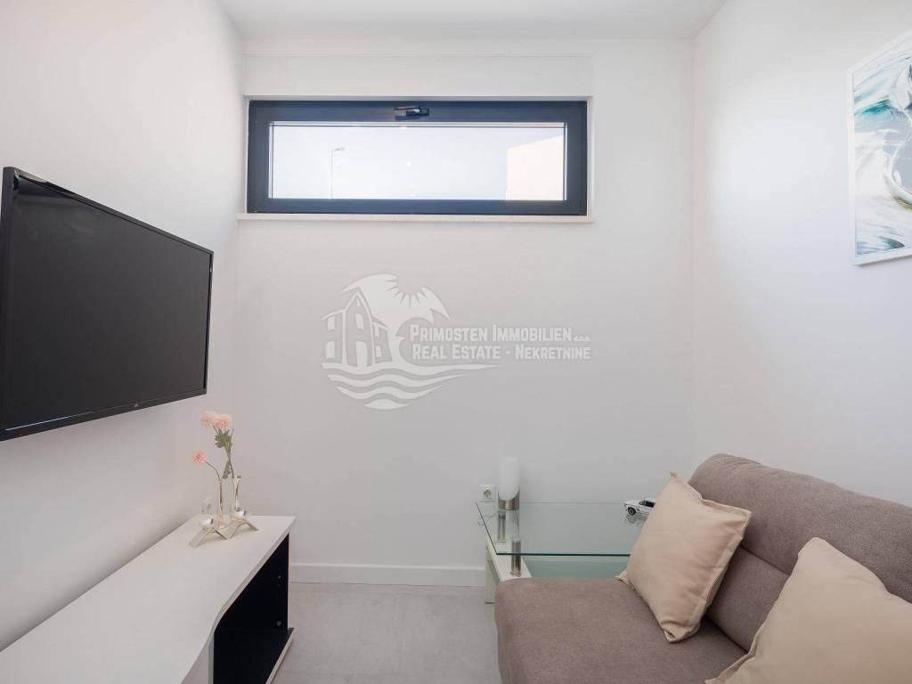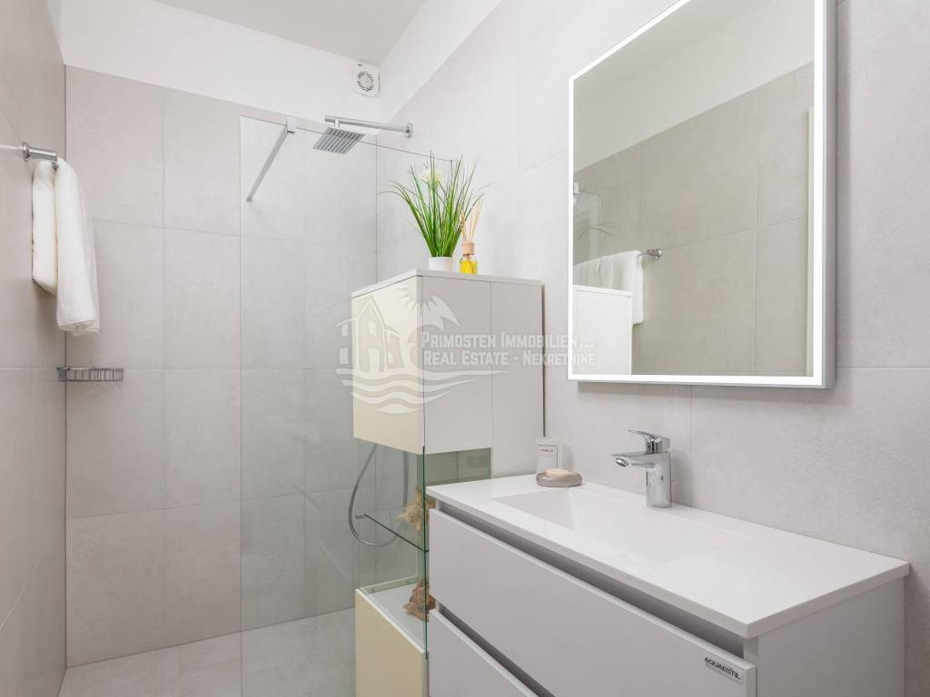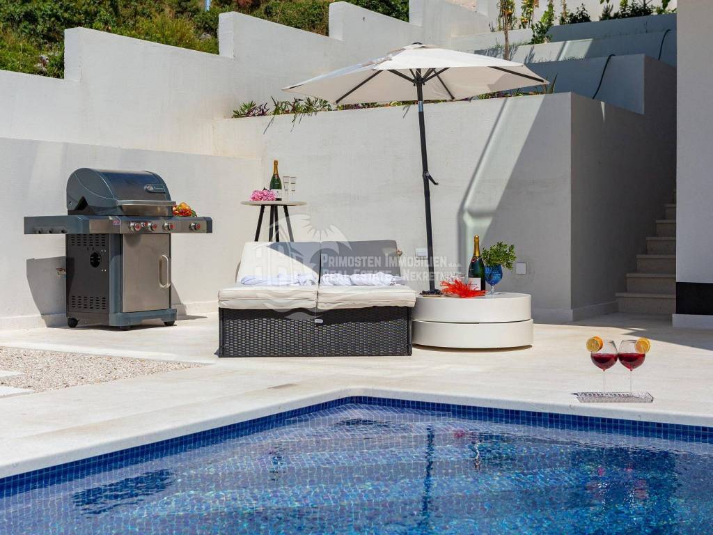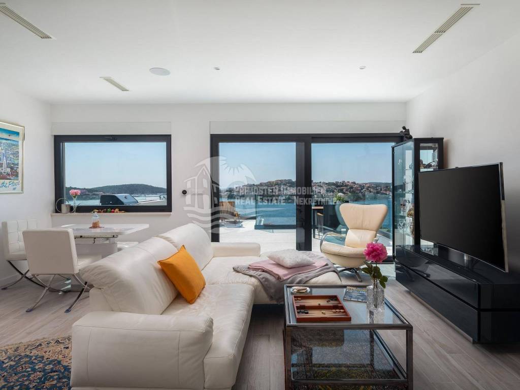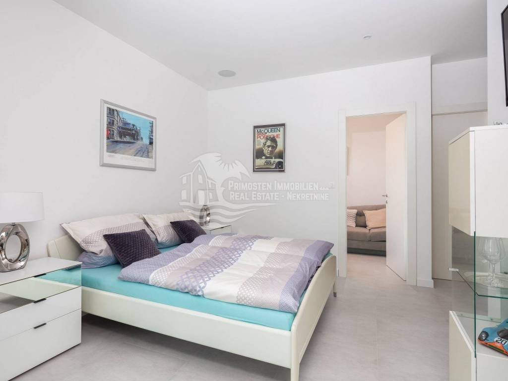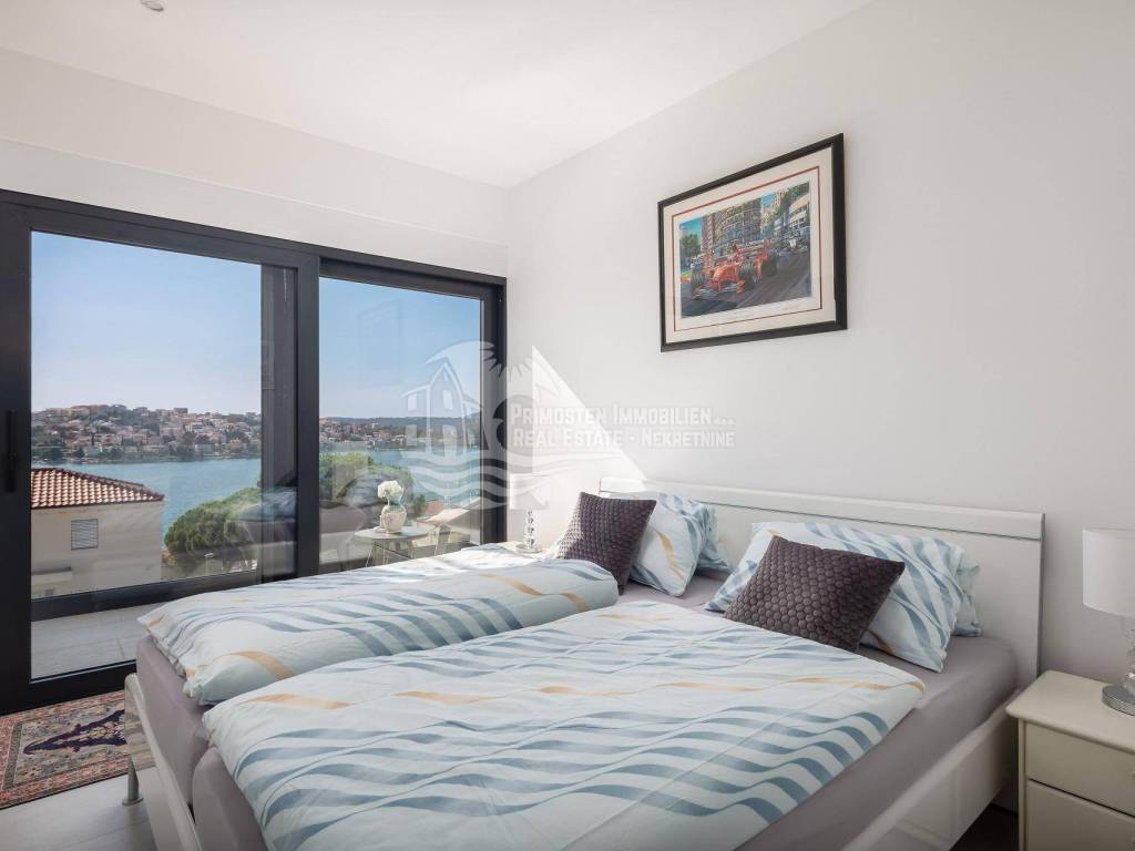 A villa near Rogoznica, a luxurious pearl of modern architecture. The house is part of a duplex complex (the left side of the picture refers to the building), has an area of 300 m², and was built on a plot of 488 m². Glazed and illuminated, modernly decorated with an elegant interior, the villa is an exclusive magnificent building. An impressive representative view of the bay and the illuminated city crown the location where the villa is located. The house consists of a souterrain, ground floor and two floors. On the ground floor there is a spacious living room with a kitchen and a dining room, and from the living room there is a spacious furnished terrace with a heated pool. On the ground floor there are also two additional storage rooms, a laundry room and a separate toilet. Floor heating is also fully installed on this floor. The staircase leads to the first floor, where there are three bedrooms with their own bathrooms. One bedroom has a separate area with a TV set and a couch set, as well as a separate access and an external staircase that can be used to get to that area. There is another laundry room on this floor. Both rooms have underfloor heating in the bathrooms. The rooms also have access to the terrace with a view of the sea. Furthermore, an internal staircase leads to the last floor, which serves as a separate residential unit and consists of a living room, kitchen, bedroom and bathroom. The living room leads to the outdoor terrace, which has a fantastic view of Rogoznica and the sea. There is also a fireplace in the living room. Also on the last floor, underfloor heating is installed in all rooms. All rooms have mosquito nets, electric blinds, and the villa is superbly equipped according to the latest standards. All rooms are air-conditioned, and the kitchens are equipped with top-quality appliances. In the complex there is a heated swimming pool measuring 7x4 with a heat pump, an outdoor grill with outdoor furniture, and a staircase leads to the souterrain, where there is a garage of approx. 20 m² with a boiler room. The facility has a total of five parking spaces. There are also solar collectors on the roof. The villa already has an established rental business and excellent seasonal occupancy. The location where the property is located is a charming little place next to Rogoznica that has seen significant tourist growth in the past few years. The villa is 100 m from the sea and 35 km from Split airport.