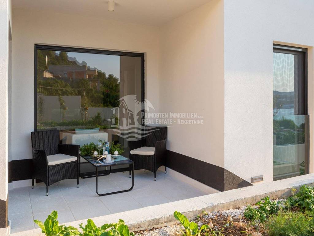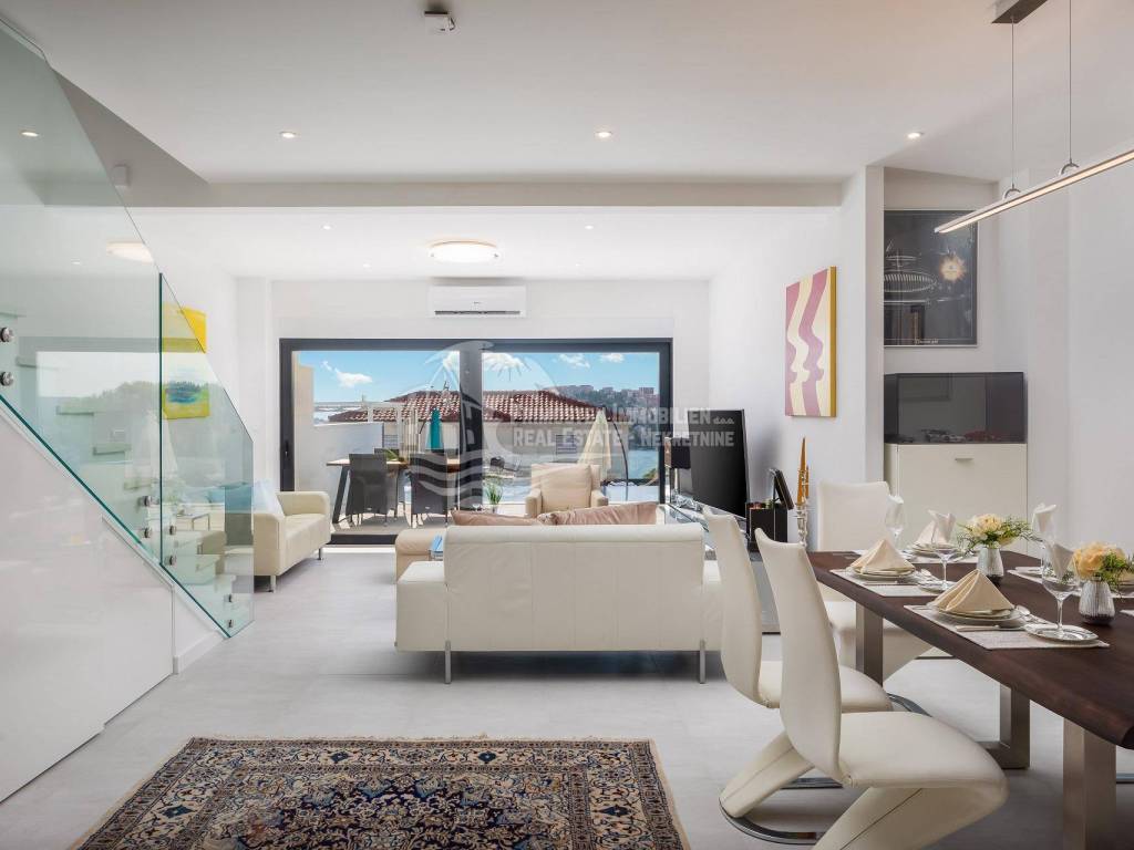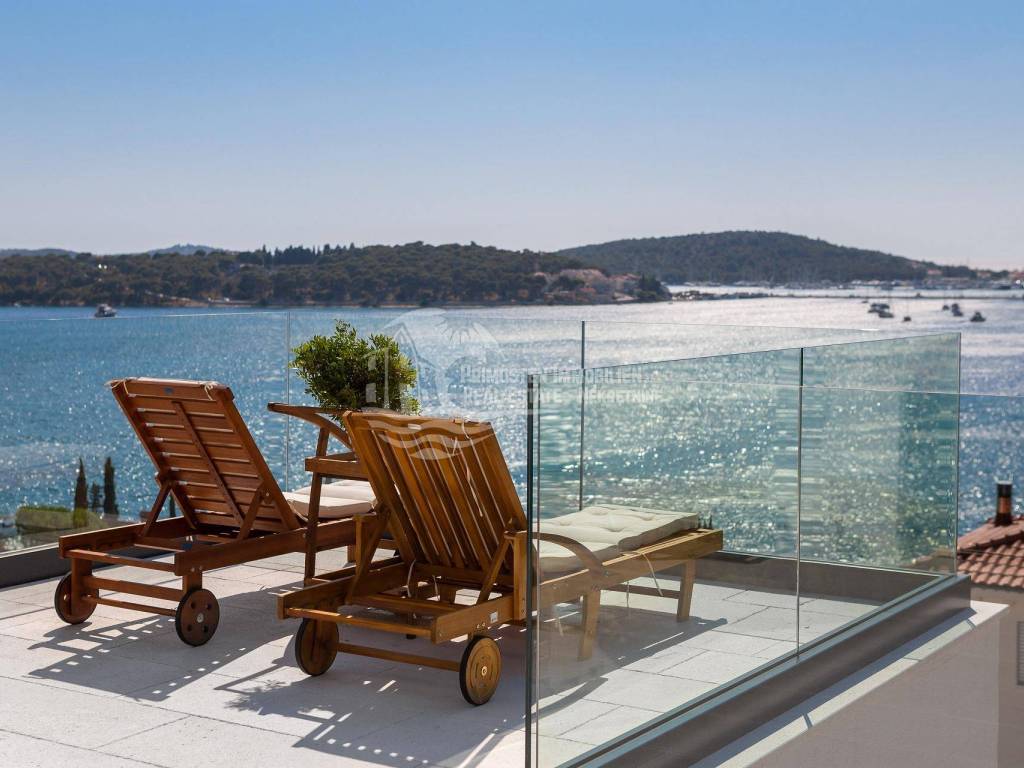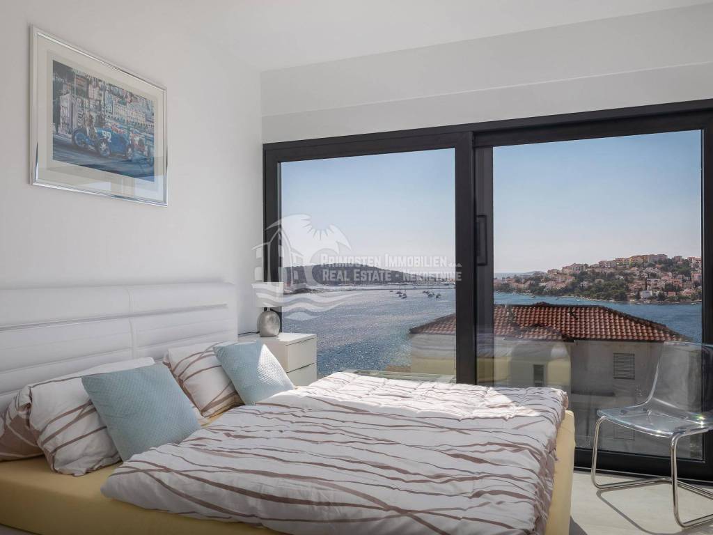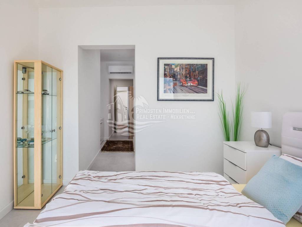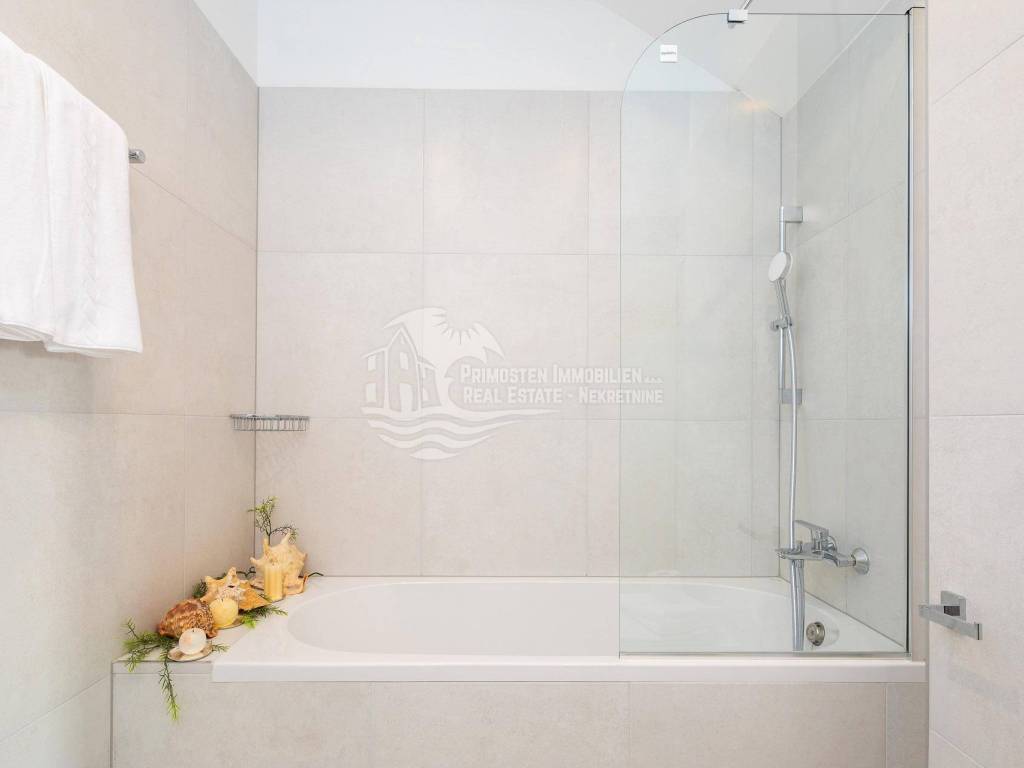 A villa near Rogoznica, a luxurious pearl of modern architecture. The house is part of a duplex complex (the left side of the picture refers to the building), has an area of 300 m², and was built on a plot of 488 m². Glazed and illuminated, modernly decorated with an elegant interior, the villa is an exclusive magnificent building. An impressive representative view of the bay and the illuminated city crown the location where the villa is located. The house consists of a souterrain, ground floor and two floors. On the ground floor there is a spacious living room with a kitchen and a dining room, and from the living room there is a spacious furnished terrace with a heated pool. On the ground floor there are also two additional storage rooms, a laundry room and a separate toilet. Floor heating is also fully installed on this floor. The staircase leads to the first floor, where there are three bedrooms with their own bathrooms. One bedroom has a separate area with a TV set and a couch set, as well as a separate access and an external staircase that can be used to get to that area. There is another laundry room on this floor. Both rooms have underfloor heating in the bathrooms. The rooms also have access to the terrace with a view of the sea. Furthermore, an internal staircase leads to the last floor, which serves as a separate residential unit and consists of a living room, kitchen, bedroom and bathroom. The living room leads to the outdoor terrace, which has a fantastic view of Rogoznica and the sea. There is also a fireplace in the living room. Also on the last floor, underfloor heating is installed in all rooms. All rooms have mosquito nets, electric blinds, and the villa is superbly equipped according to the latest standards. All rooms are air-conditioned, and the kitchens are equipped with top-quality appliances. In the complex there is a heated swimming pool measuring 7x4 with a heat pump, an outdoor grill with outdoor furniture, and a staircase leads to the souterrain, where there is a garage of approx. 20 m² with a boiler room. The facility has a total of five parking spaces. There are also solar collectors on the roof. The villa already has an established rental business and excellent seasonal occupancy. The location where the property is located is a charming little place next to Rogoznica that has seen significant tourist growth in the past few years. The villa is 100 m from the sea and 35 km from Split airport.
