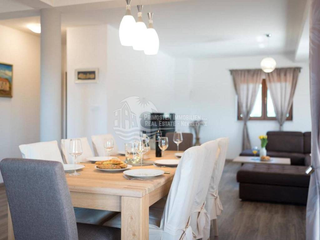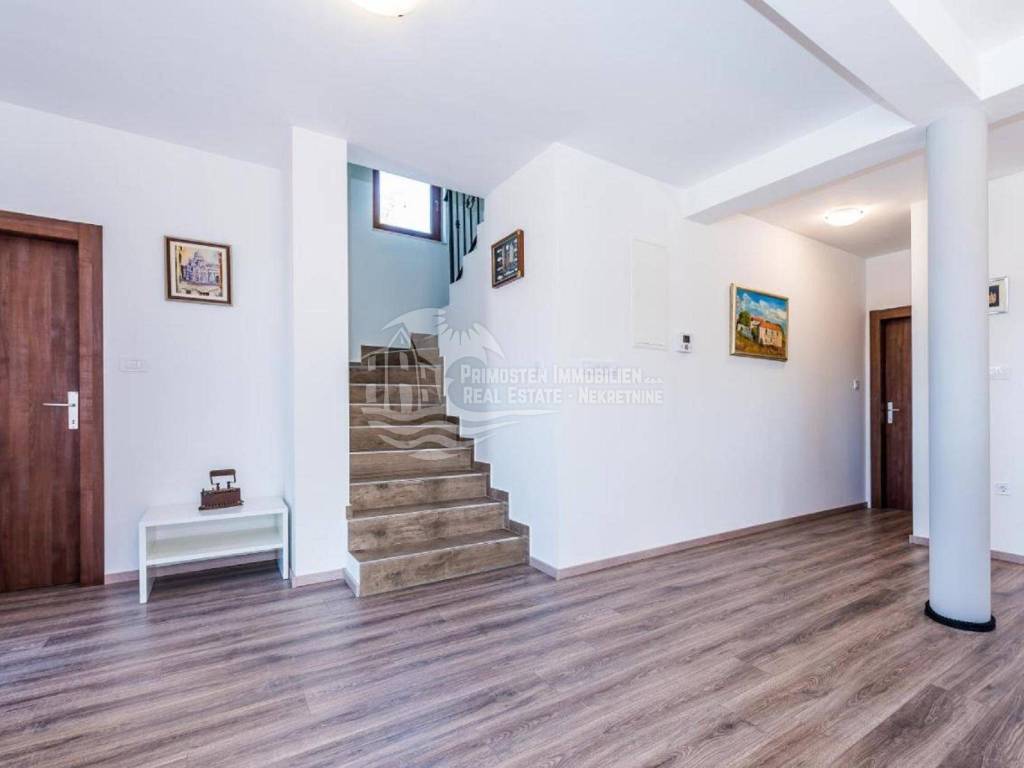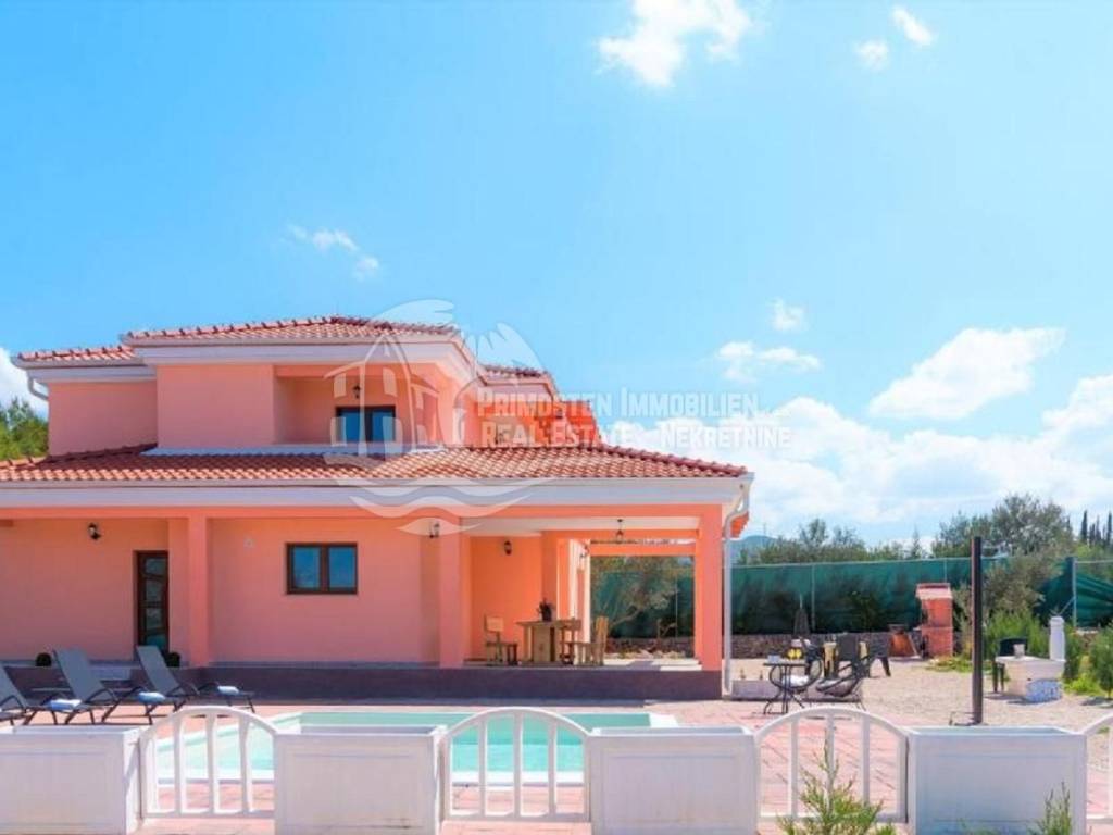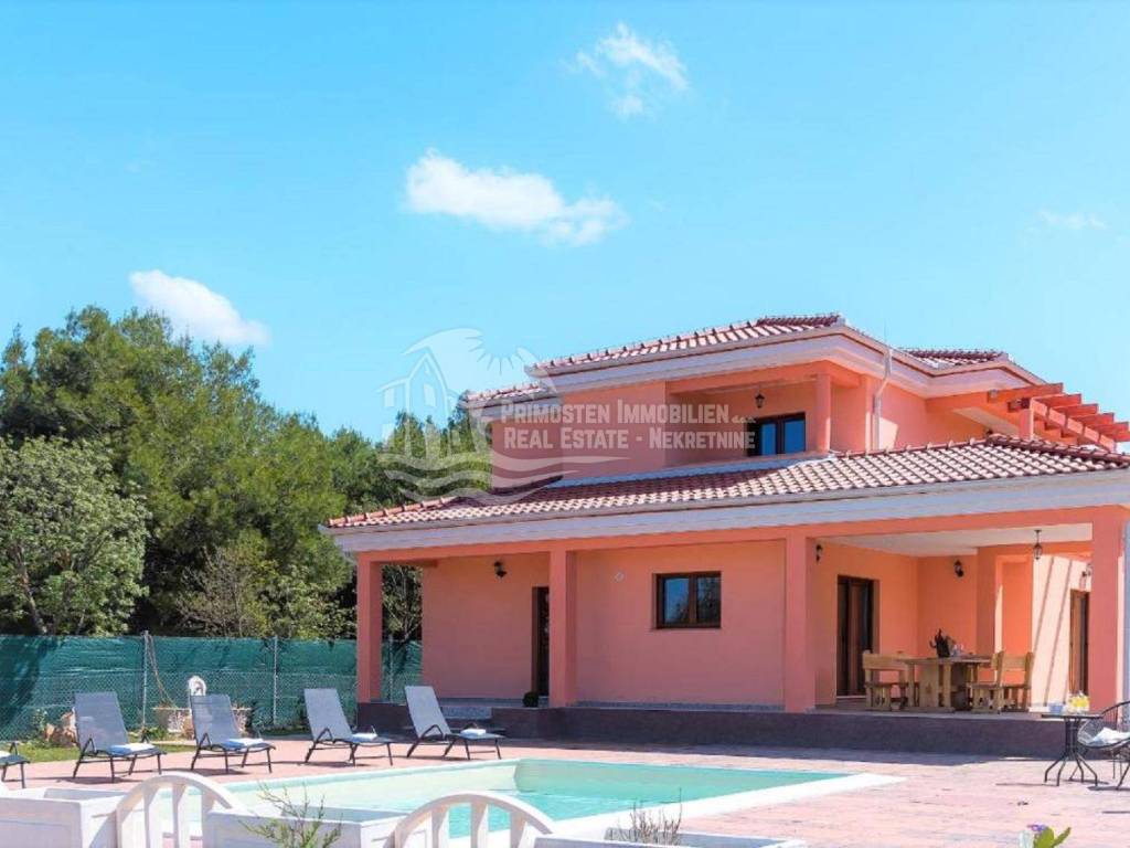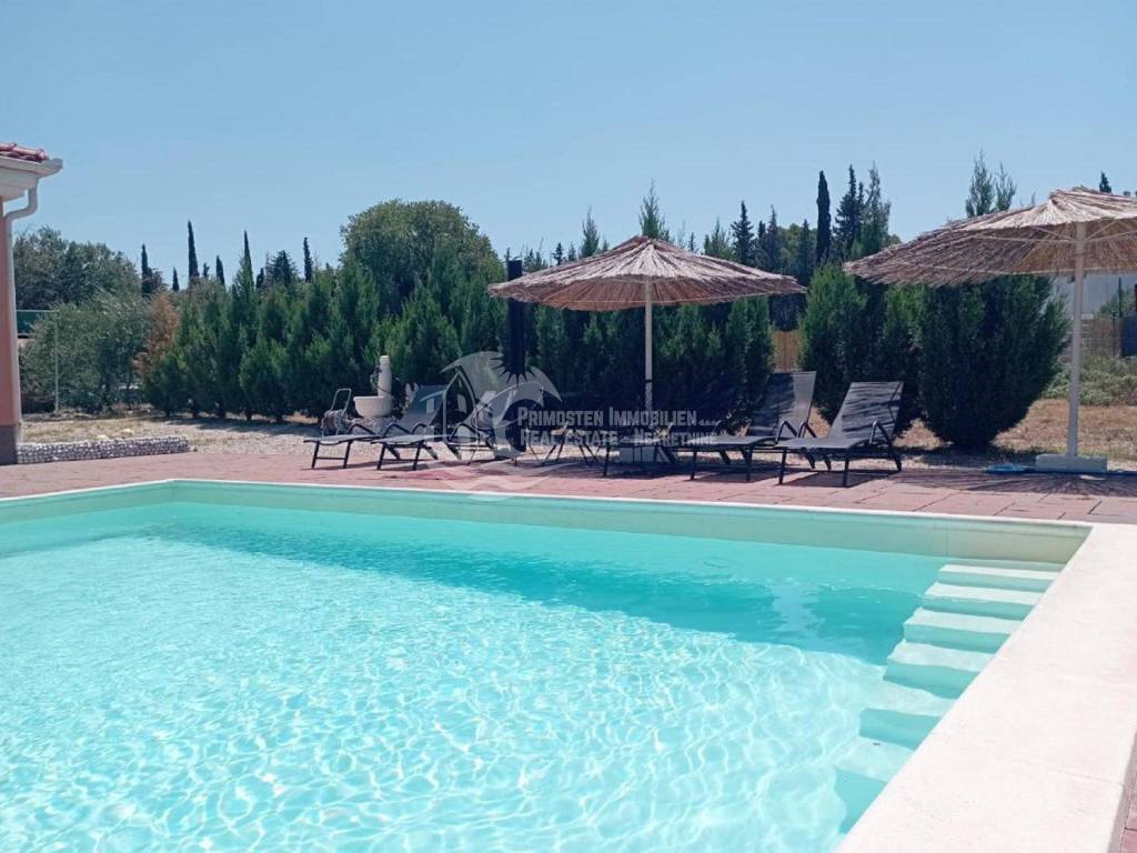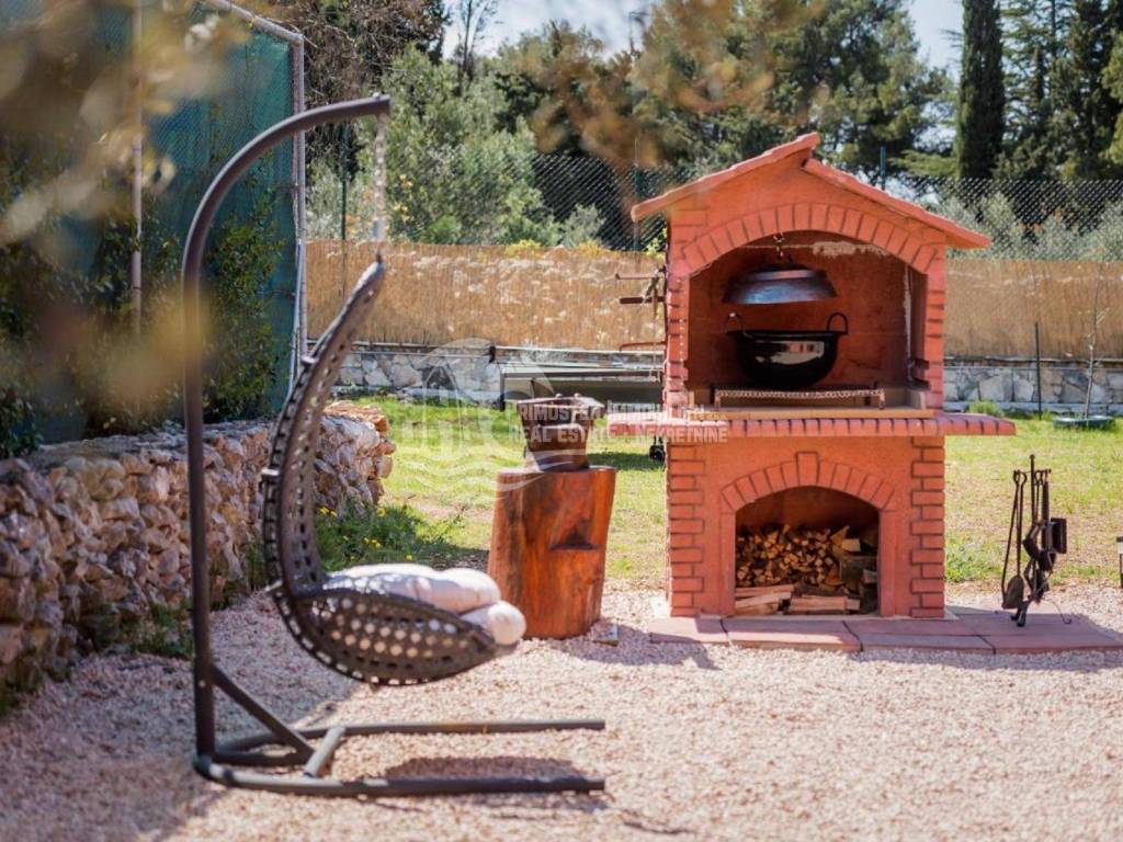 Charming two-story house 3 km from Sibenik, spread over a large plot of 1800 m². The architectural design of the house is reminiscent of the Spanish hacienda style of construction. It is located in a perfect quiet location, extends over two floors and has a brutto living area of 210 m². On the ground floor there is a spacious living room, dining room, kitchen, one bedroom, bathroom, toilet, laundry room and storage room. There is also a space for fireplace in the living room. Furthermore, the staircase leads to the first floor, where there are three bedrooms, each of which has its own bathroom. Each room has an exit to the terrace. The interior is decorated according to the latest modern standards and all rooms are air-conditioned. The ground floor has access to a spacious covered terrace and swimming pool of 32 m² and a beautifully landscaped yard with a large garden. The beautifully landscaped garden, which is filled with vibrant Mediterranean greenery from all sides, provides a real natural ambience. Since the house is located on a really large plot, there is also a large volleyball court, contents for children, an area with a barbecue and an area with outdoor furniture for socializing. Ideal for rest and relaxation in nature. The house provides a zen, calming effect and ambiance that is perfect for anyone who wants to make the good quality vacation. The house has 10 cm Styrofoam insulation and is sold furnished. It records excellent seasonal occupancy and brings very good annual income from tourism. The plot on which the house is located is approximately 800 m², and the future owner can use the additional 1000 m² of the plot to build another building.