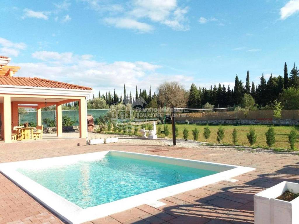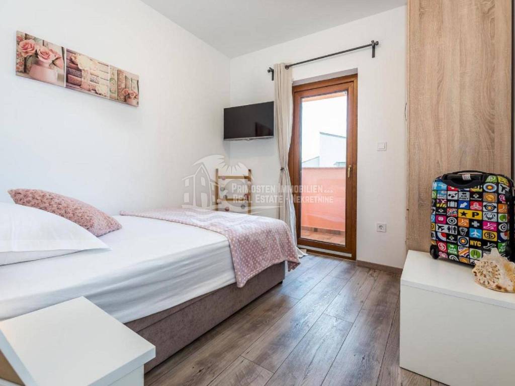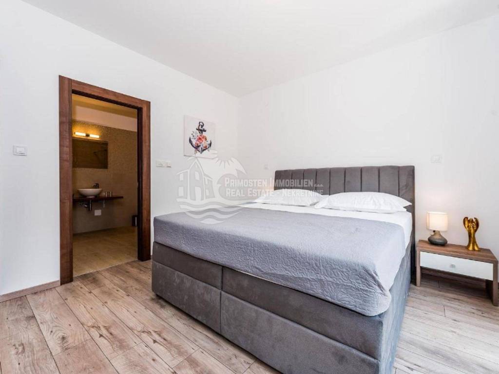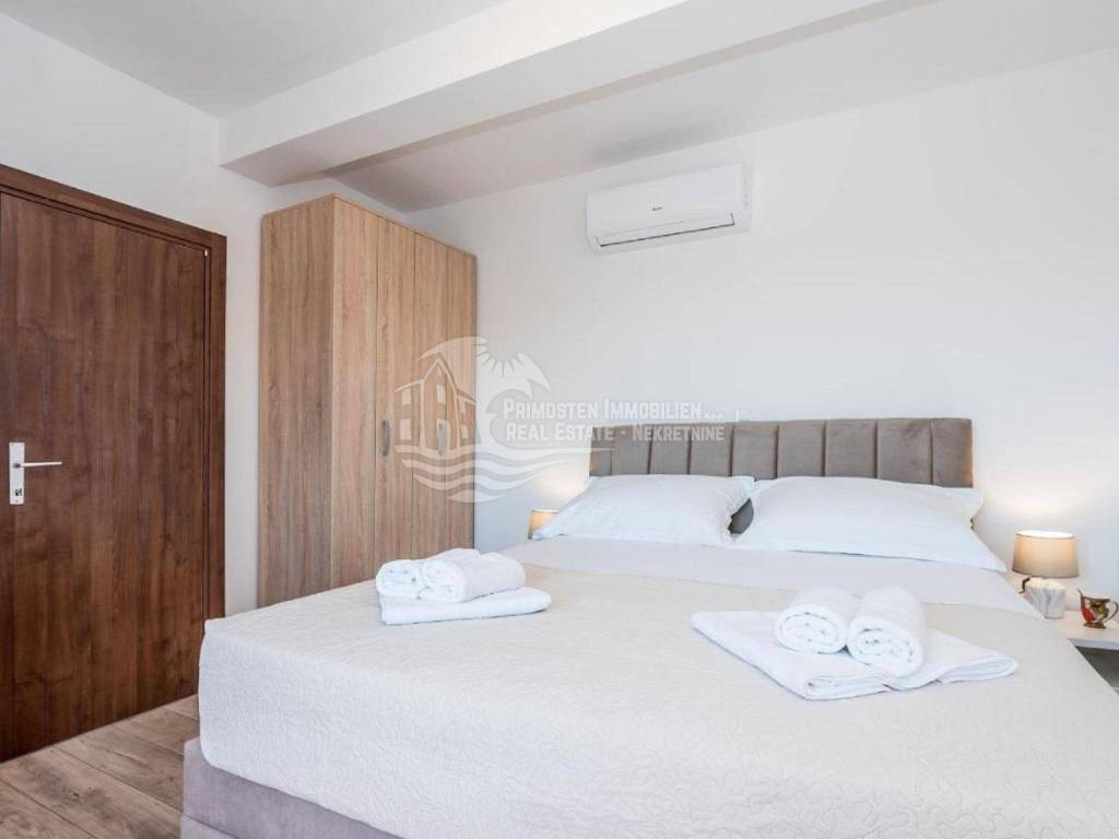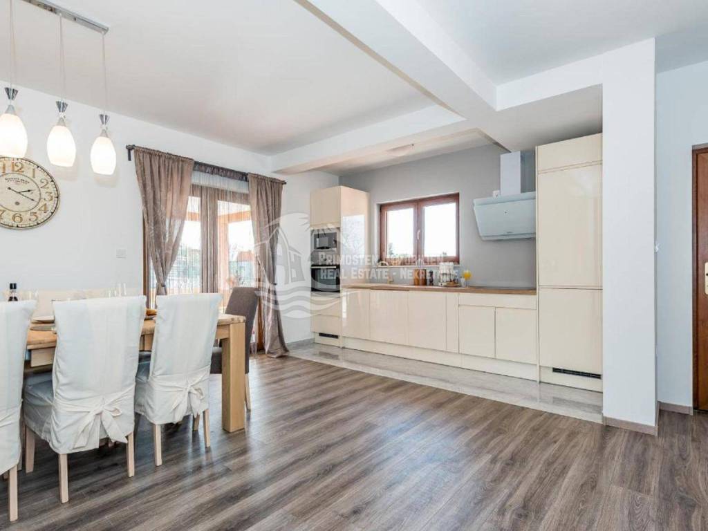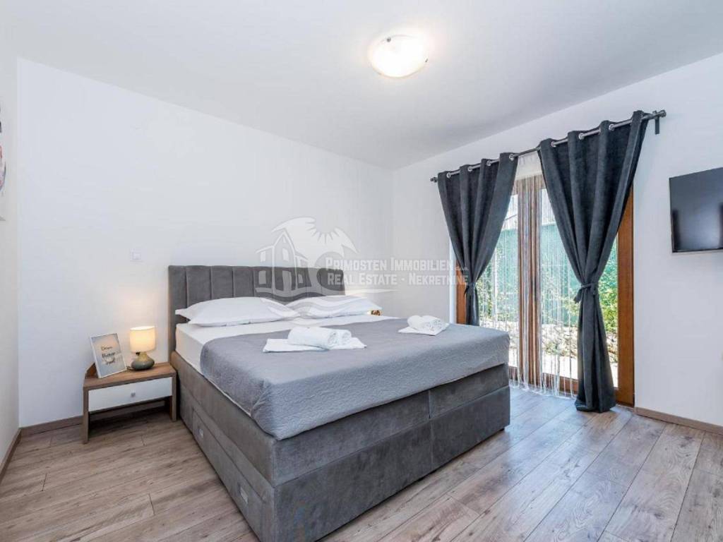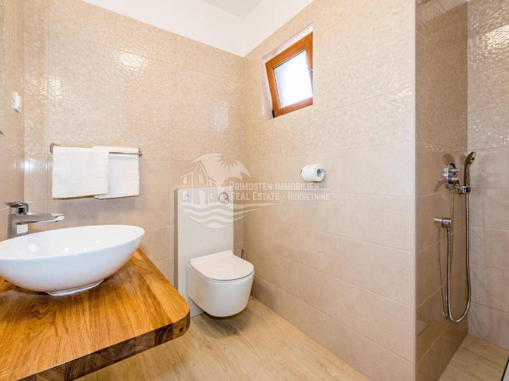 Charming two-story house 3 km from Sibenik, spread over a large plot of 1800 m². The architectural design of the house is reminiscent of the Spanish hacienda style of construction. It is located in a perfect quiet location, extends over two floors and has a brutto living area of 210 m². On the ground floor there is a spacious living room, dining room, kitchen, one bedroom, bathroom, toilet, laundry room and storage room. There is also a space for fireplace in the living room. Furthermore, the staircase leads to the first floor, where there are three bedrooms, each of which has its own bathroom. Each room has an exit to the terrace. The interior is decorated according to the latest modern standards and all rooms are air-conditioned. The ground floor has access to a spacious covered terrace and swimming pool of 32 m² and a beautifully landscaped yard with a large garden. The beautifully landscaped garden, which is filled with vibrant Mediterranean greenery from all sides, provides a real natural ambience. Since the house is located on a really large plot, there is also a large volleyball court, contents for children, an area with a barbecue and an area with outdoor furniture for socializing. Ideal for rest and relaxation in nature. The house provides a zen, calming effect and ambiance that is perfect for anyone who wants to make the good quality vacation. The house has 10 cm Styrofoam insulation and is sold furnished. It records excellent seasonal occupancy and brings very good annual income from tourism. The plot on which the house is located is approximately 800 m², and the future owner can use the additional 1000 m² of the plot to build another building.