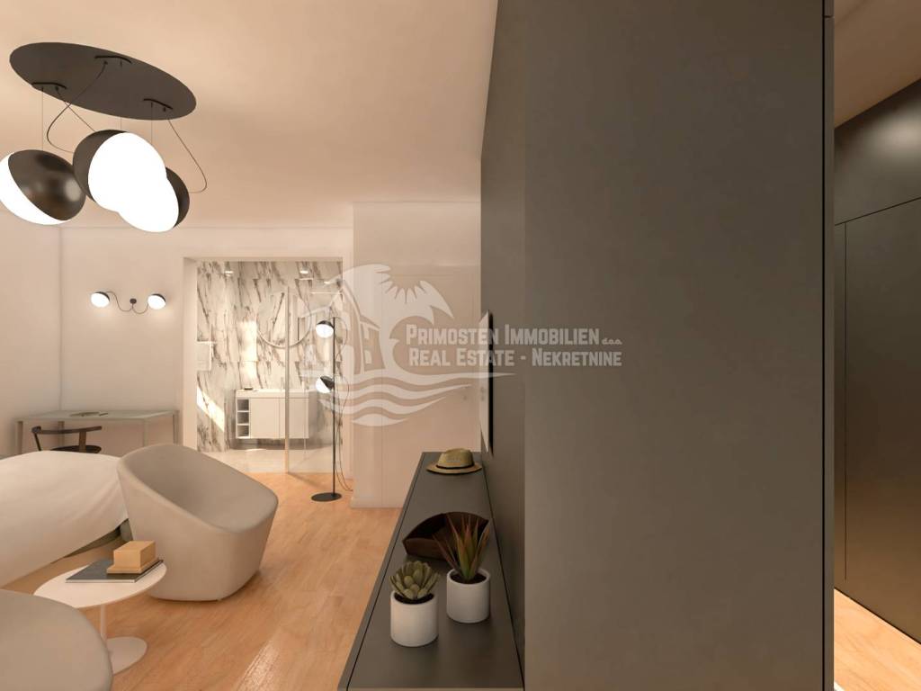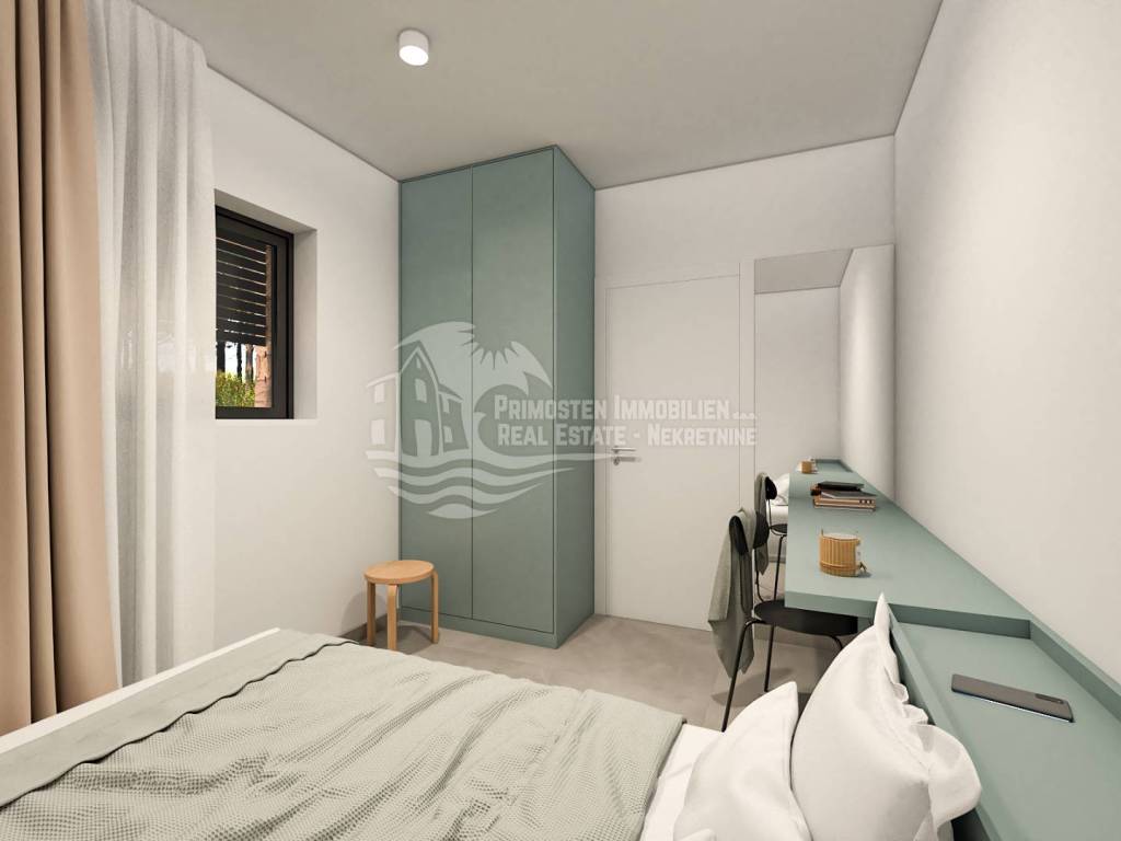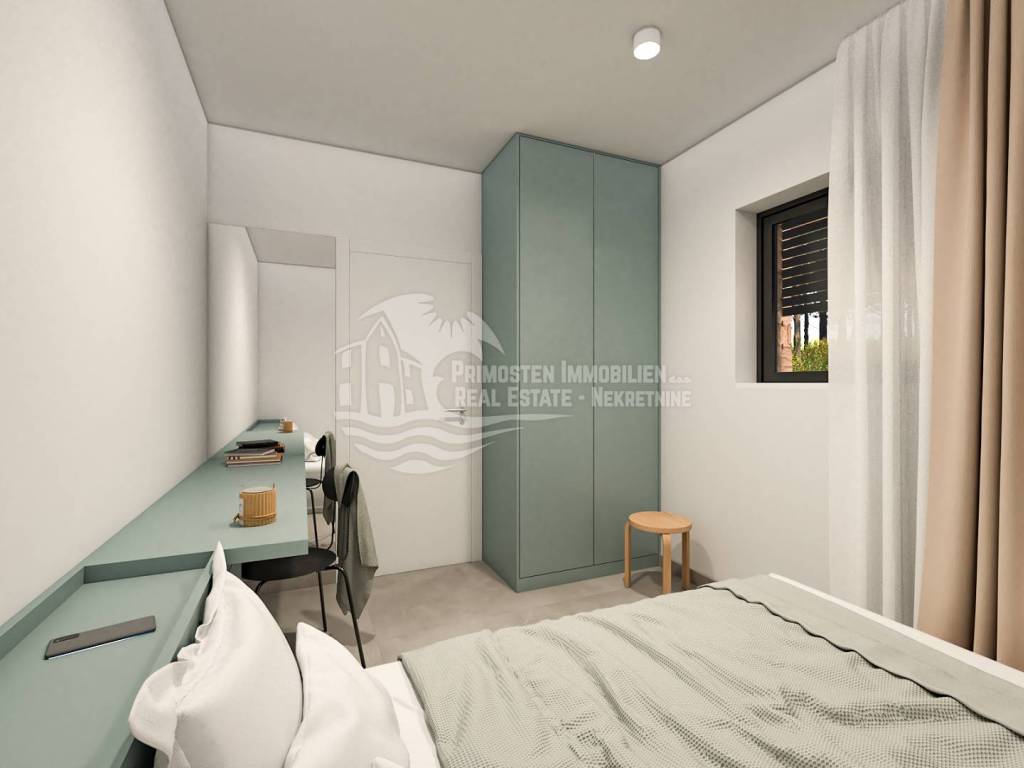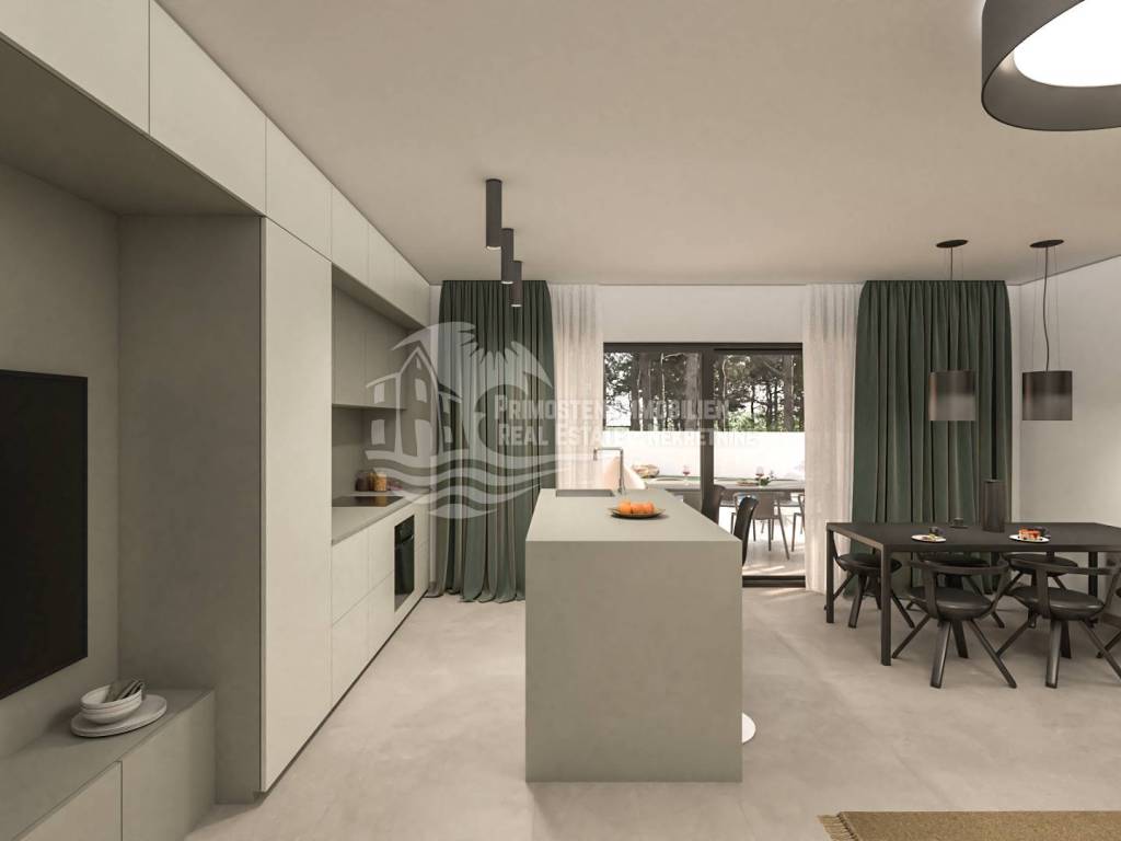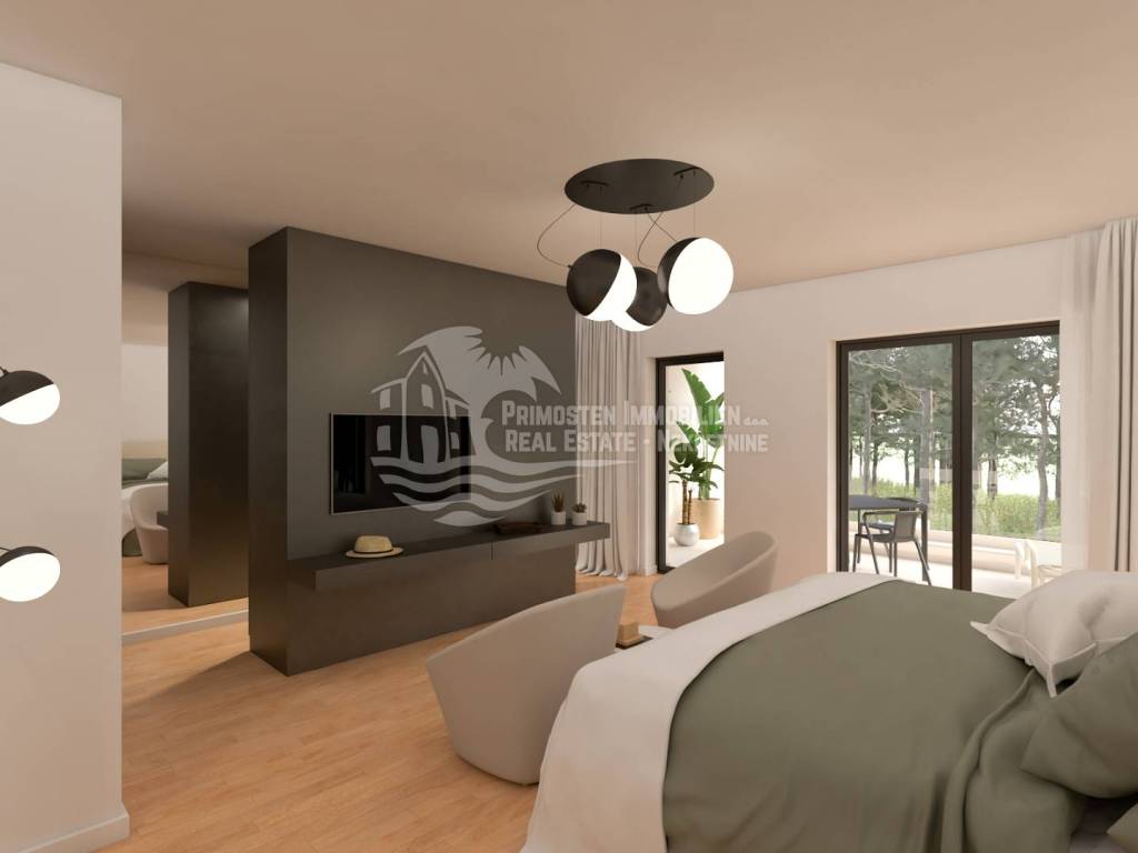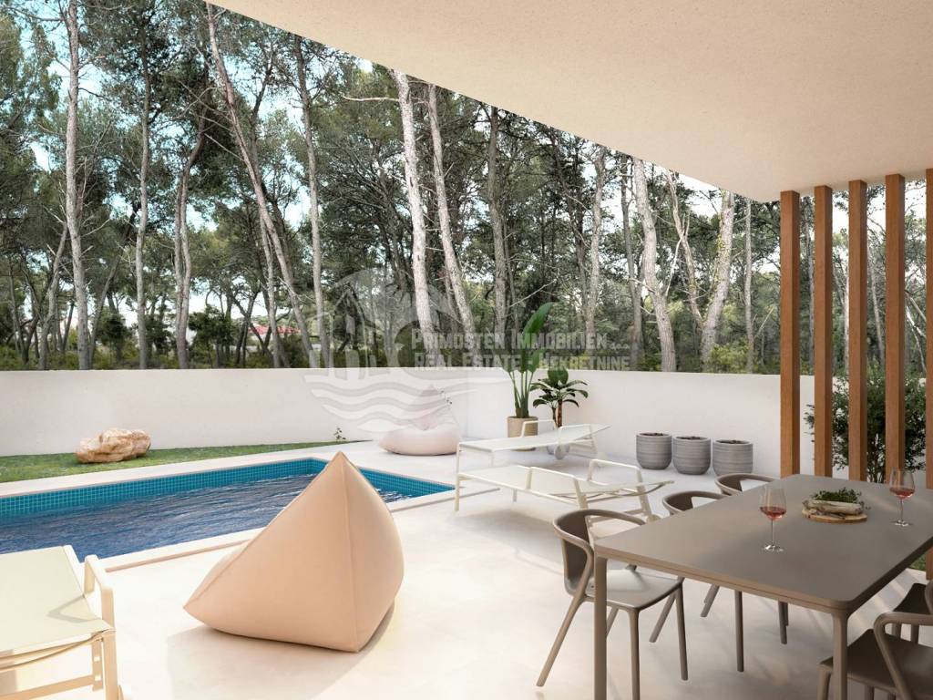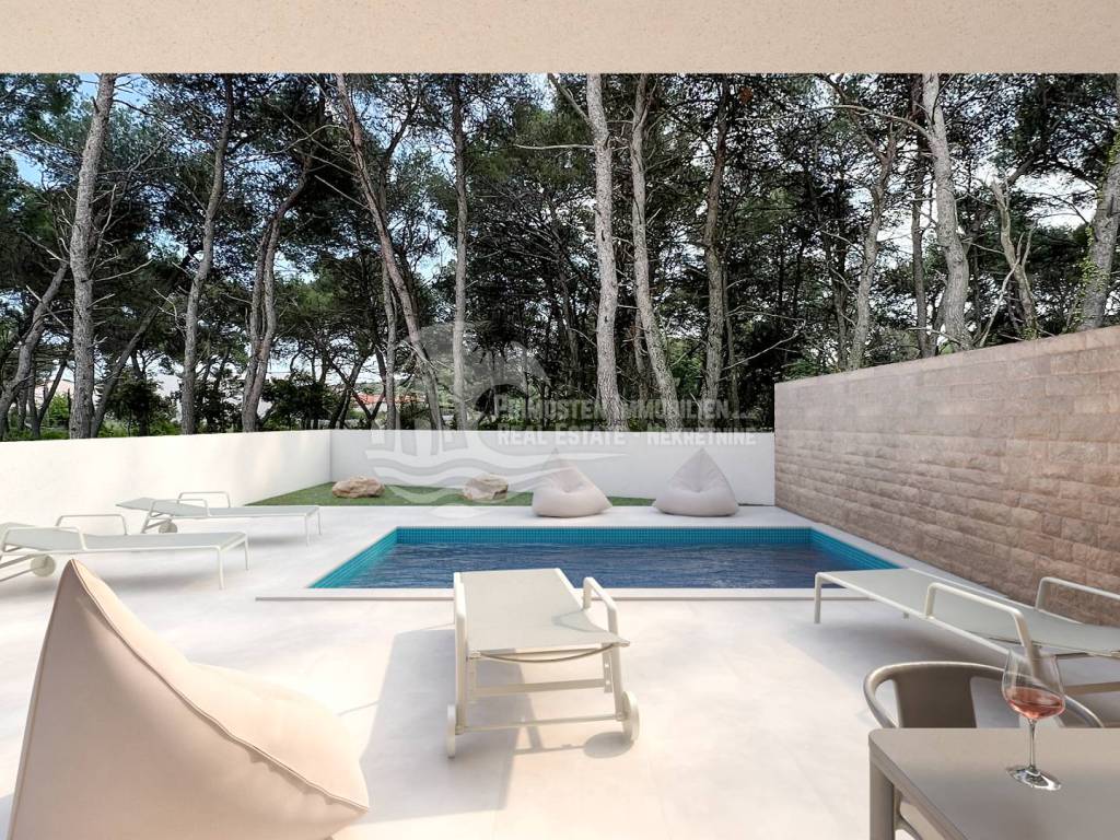 A fantastic triplex project in Tribunj, consisting of three residential units, three separate "storied" apartments with a garden, pool and terrace. Residential unit C consists of a ground floor and two floors and has an area of 165 m². On the ground floor there is a living room, kitchen, dining room, guest room, bathroom, storage room and exit to the covered terrace. This floor has a total area of 66.57 m². On the first floor, which is connected by a staircase, there are two bedrooms, two bathrooms, a toilet and a loggia and has an area of 67.30 m². On the last floor there is a spacious terrace with a fantastic view of the sea, which has a covered and uncovered part and has an area of 64.05 m². In the terrace there is also a summer kitchen, a sunbathing area and a jacuzzi. There is also a swimming pool, barbecue and parking on the ground floor. The pool equipment, in addition to the high standard of basic equipment, includes counter-current swimming, pool lighting, an isothermal cover with a winding stand, preparation for a heat pump and automatic dosing of chemicals for conditioning the pool water.