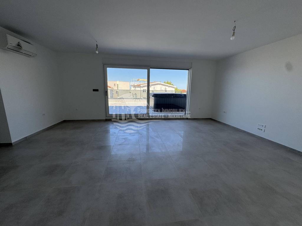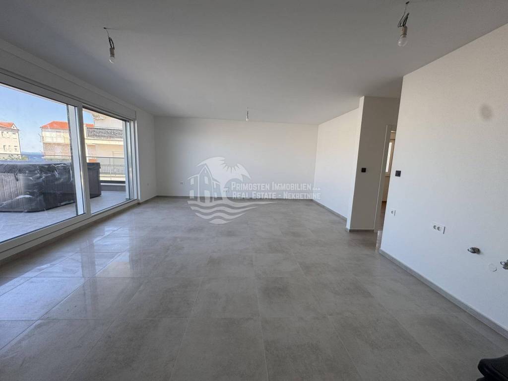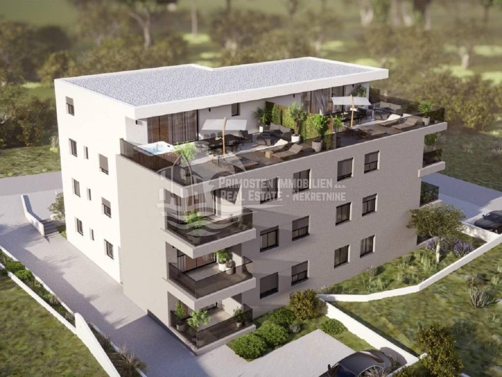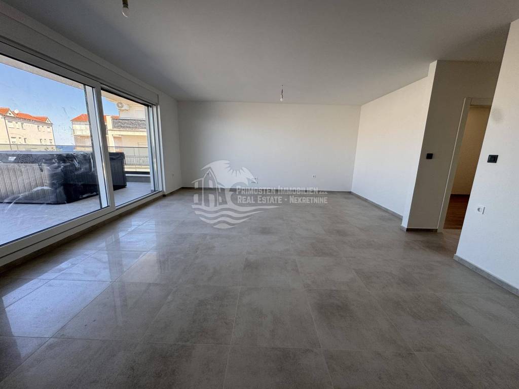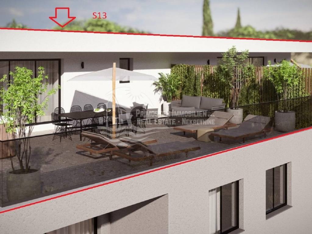 Primosten Immobilien exclusively offers you a high-quality and modern construction project with a total of 14 residential units in an absolute top location. A three-room penthouse (residential unit S13) in Primosten, which is currently under construction, is for sale with a total living area of ​​98.20 m² and a terrace area of ​​54.54 m². The room layout is as follows; open kitchen-living room, two bedrooms, bathroom, separate toilet, hallway, storage room, covered balcony, as well as a spacious open terrace with whirlpool and fantastic unobstructed views of the sea and the old town of Primosten. The view is a postcard motif. The distance to Primosten beach is approx. 300 m, restaurants, cafes and the well-known beach are within easy walking distance. The technical equipment includes, among other things, fully air-conditioned rooms and underfloor heating in the bathroom. There is also a fireplace opening. The building has energy certificate A. Included in the purchase price is a communal garden and an allocated parking space. Completion of the construction work is scheduled for summer 2025. The apartments are sold by a company, so there is no property transfer tax when purchasing the apartment. If you are looking for a new build apartment near the sea, this property is an excellent choice. Whether as a holiday apartment or investment property. Arrange a viewing appointment with us!