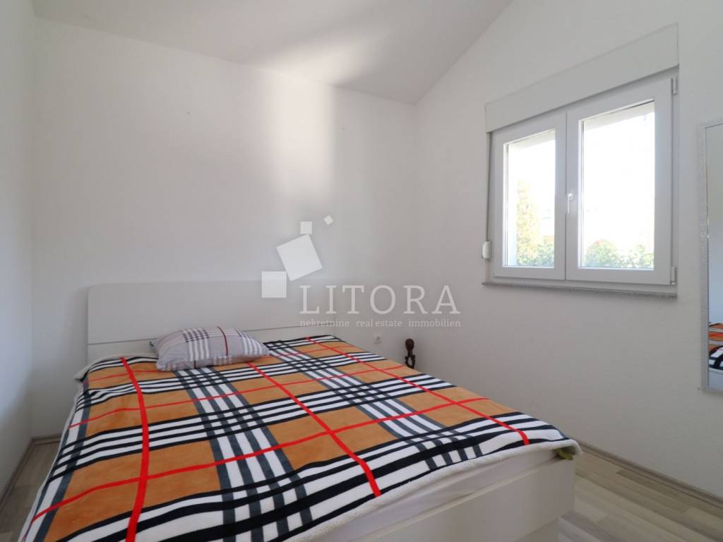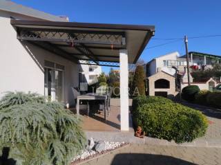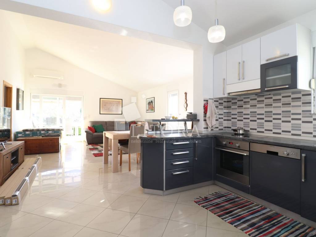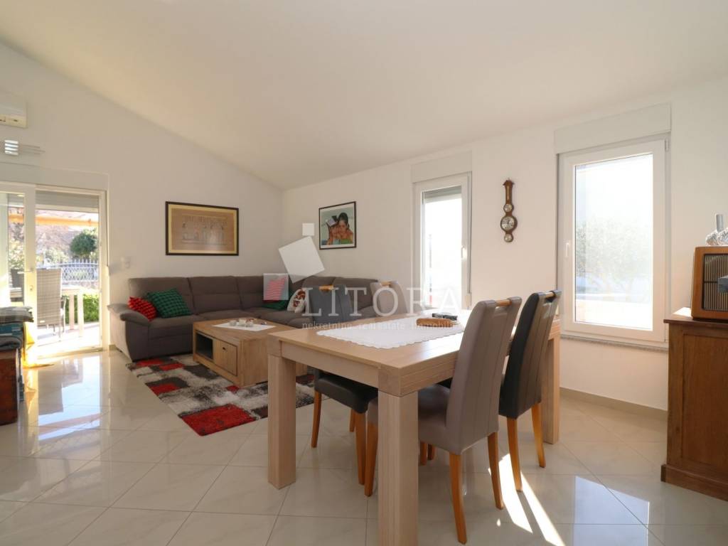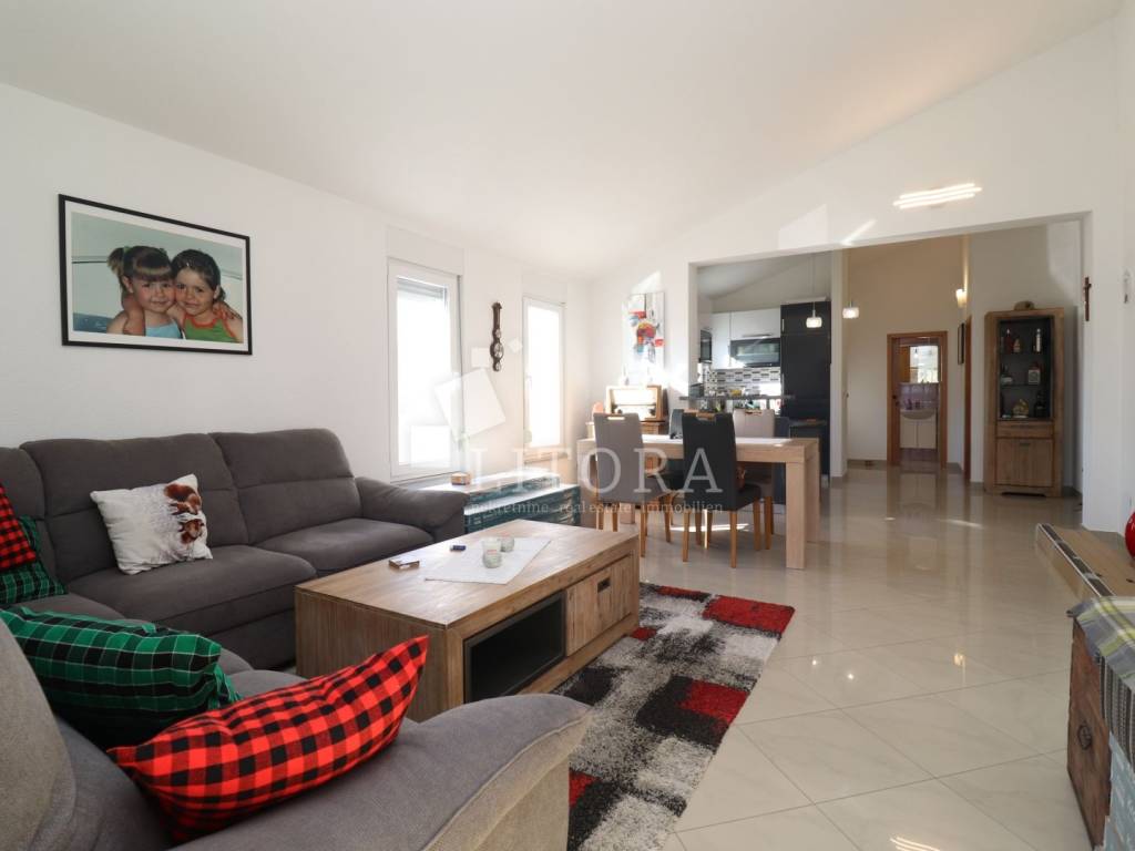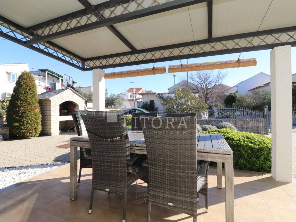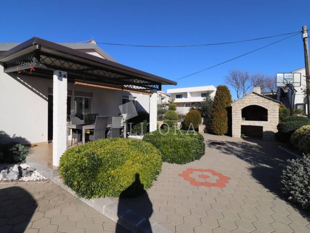 Vodice, 700 m from the town center – single-storey family house (semi-detached) with a landscaped garden. The house offers 97.52 m² of usable living space and consists of a spacious entrance hall, a smaller bathroom, a storage room, three bedrooms, a large bathroom, a spacious kitchen, and a large living room with access to a 12 m² covered terrace, oriented to the south. The terrace is surrounded by a paved courtyard and a beautifully landscaped garden. The house was built in 2010 and is situated on a 336 m² plot. The yard is fenced, and the house is equipped with air-conditioning units. The outdoor area includes a brick-built barbecue, a small prefabricated auxiliary building / storage room, and parking space for three vehicles. The house is fully furnished, with all furniture included in the purchase price. It is located 700 m from the town center and only 1,000 m from Vruje Beach.
