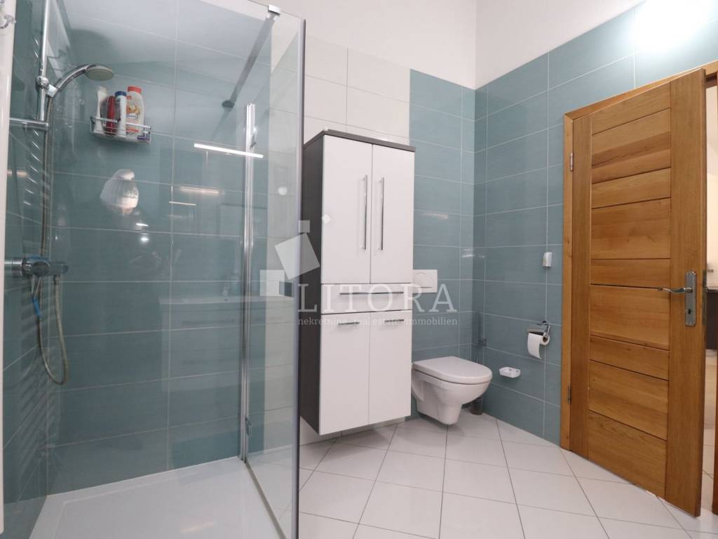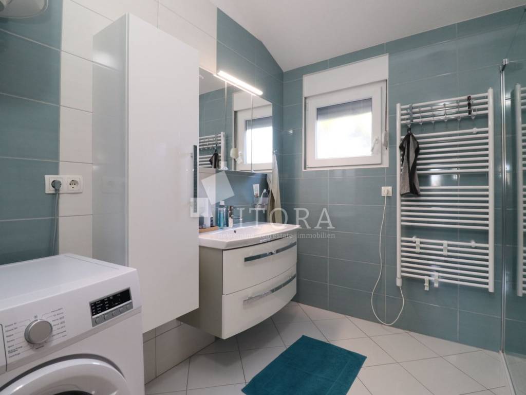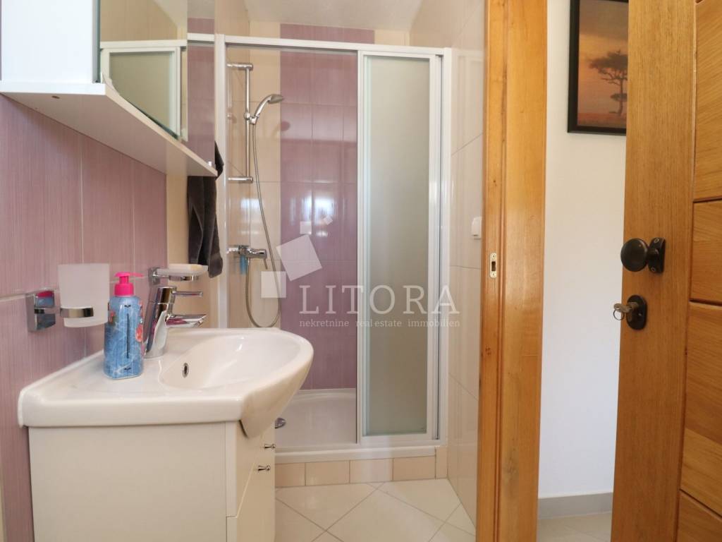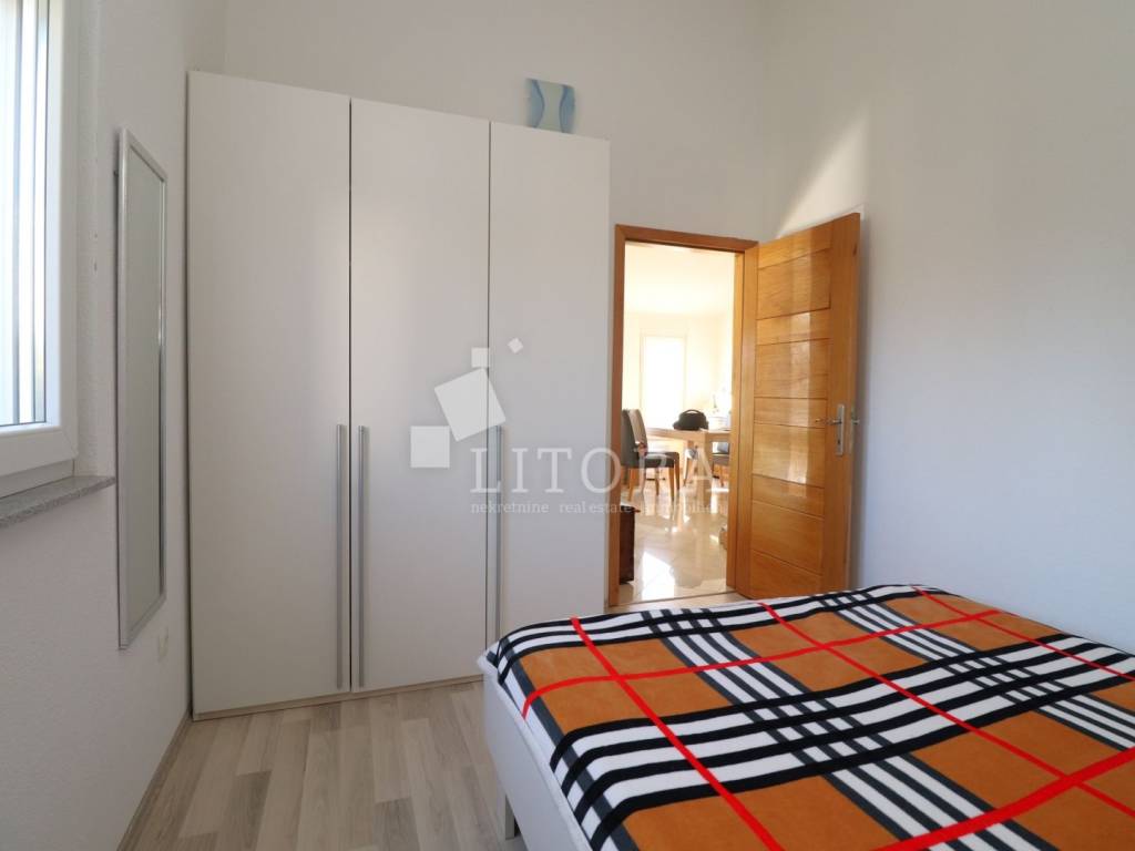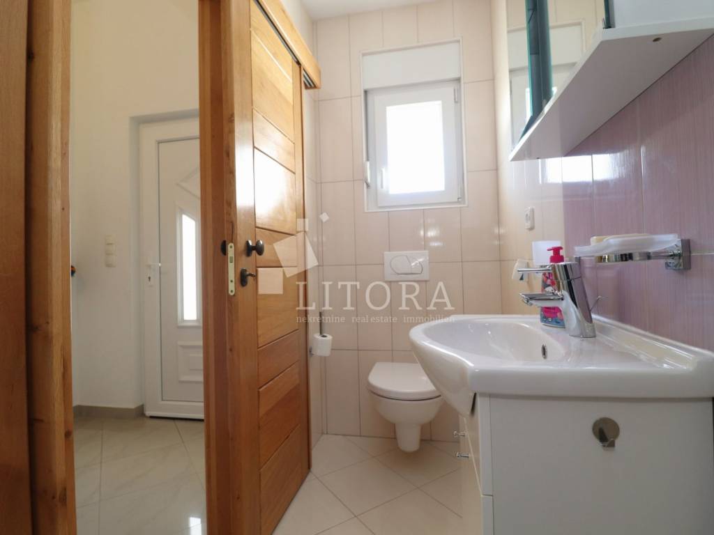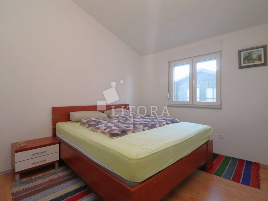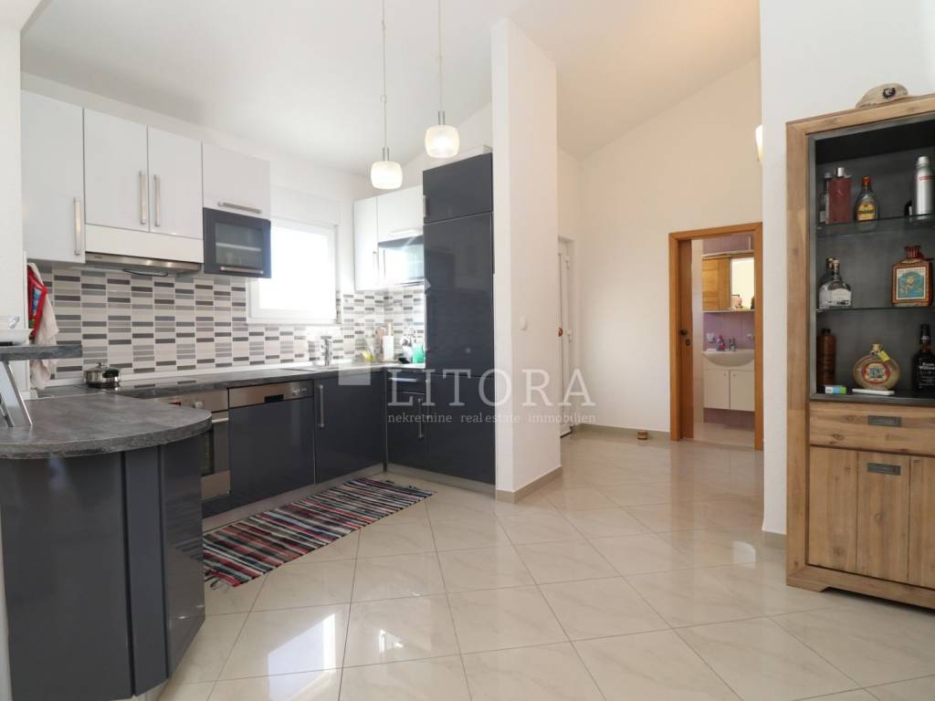 Vodice, 700 m from the town center – single-storey family house (semi-detached) with a landscaped garden. The house offers 97.52 m² of usable living space and consists of a spacious entrance hall, a smaller bathroom, a storage room, three bedrooms, a large bathroom, a spacious kitchen, and a large living room with access to a 12 m² covered terrace, oriented to the south. The terrace is surrounded by a paved courtyard and a beautifully landscaped garden. The house was built in 2010 and is situated on a 336 m² plot. The yard is fenced, and the house is equipped with air-conditioning units. The outdoor area includes a brick-built barbecue, a small prefabricated auxiliary building / storage room, and parking space for three vehicles. The house is fully furnished, with all furniture included in the purchase price. It is located 700 m from the town center and only 1,000 m from Vruje Beach.