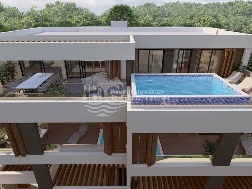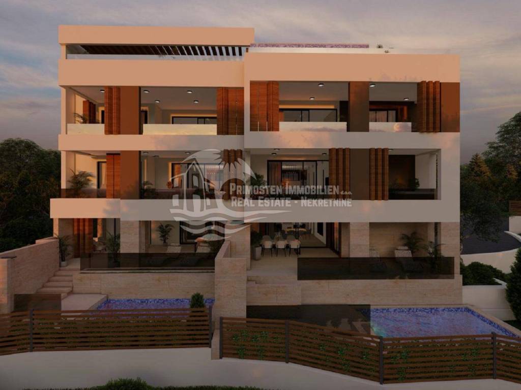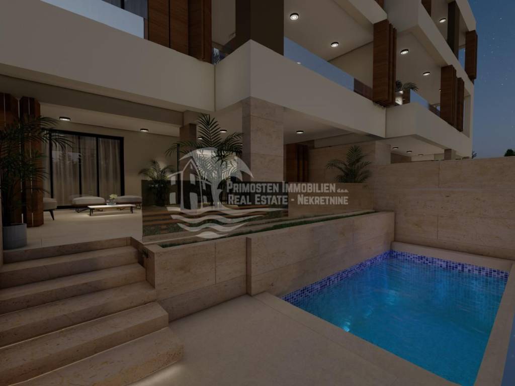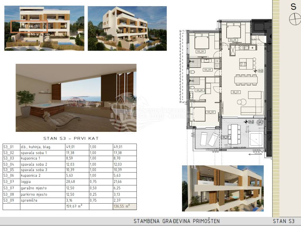SENSATIONAL OFFER! For sale is apartment S3, located on the first floor of a building that is currently under construction and consists of 7 residential units. The building is located in an extremely good location, close to all tourist facilities, and close to the beautiful beaches of Primošten. The distance to the sea is approx. 400m. This luxury apartment has a living area of 136.55 m2 with the coefficients of a terrace, a garden and one outdoor parking space and one garage space. The apartment consists of a living room, kitchen and dining room (49.01 m2), three bedrooms (17.38 m2 and 12.03 m2 and 10.39 m2) and two bathrooms (8.59 m2 and 5.63 m2). . From the living room there is a 28.48 m2 loggia. In addition to the loggia, the apartment has one garage parking space, one outdoor parking space and a storage room. All apartments will be equipped with security doors, while all internal doors in the apartments will be 2.45 m high.