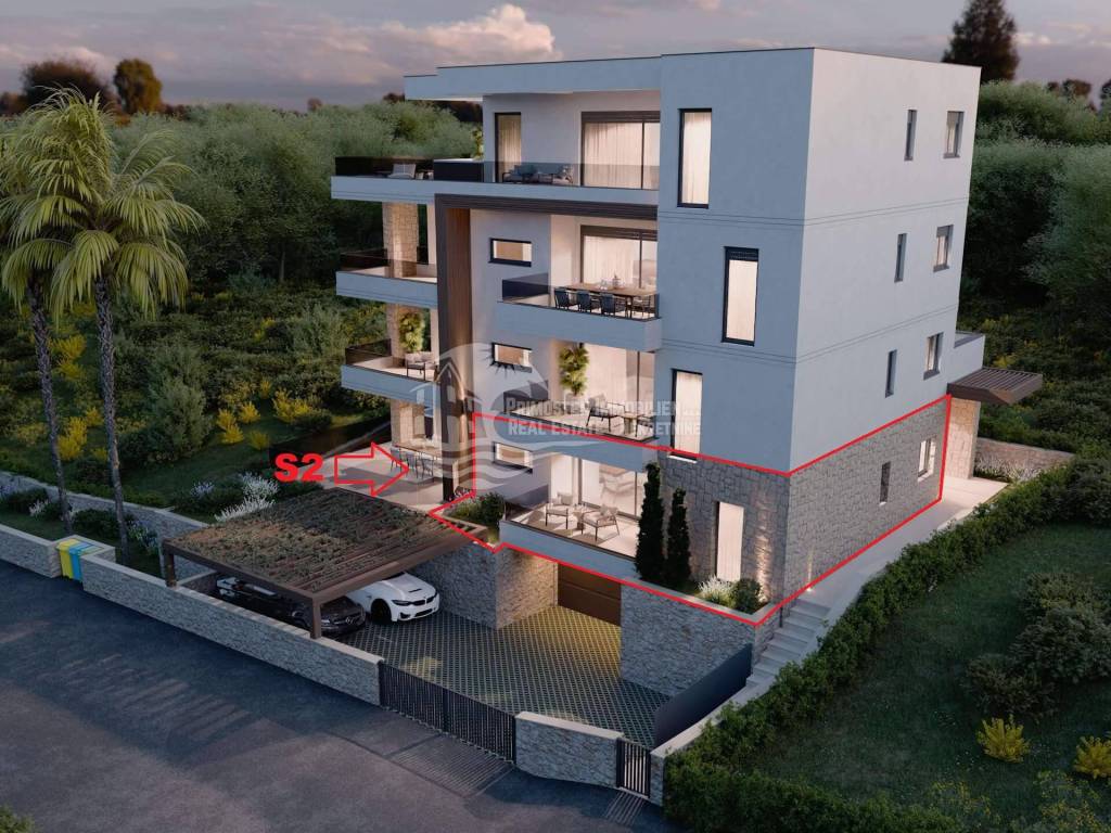 This ground floor apartment in Primošten, is still under construction and located in a residential building with a total of seven residential units. The living space is approximately 61 m² and the usable space is approximately 66,94 m². It offers an entrance hall, living room, kitchen, two bedrooms, bathroom, south facing covered terrace (4,24 m²), and an additional terrace of 8,12 m². The interior and exterior areas will be laid with high-quality tiles, and the bedrooms will have oak parquet flooring in a herringbone pattern. Although the apartment is on the ground floor, it offers unobstructed views of the open sea and the stunningly beautiful old town of Primošten. The technical installation includes three air conditioning units and electric underfloor heating in the kitchen-living room and bathrooms, as well as electric shutters with fly screens on the windows. The purchase price includes a garage parking space with a charging station for electric vehicles. The apartment is sold unfurnished, but for an additional fee, you can use the interior design for furnishing, as shown on our website. Shopping facilities such as a supermarket, bakery, and cafe are within walking distance in about 5 minutes. The town center and beach are 2 km away, and Split Airport is about a 35-minute drive away. Completion of construction is scheduled for June 2026. Contact us for further details!