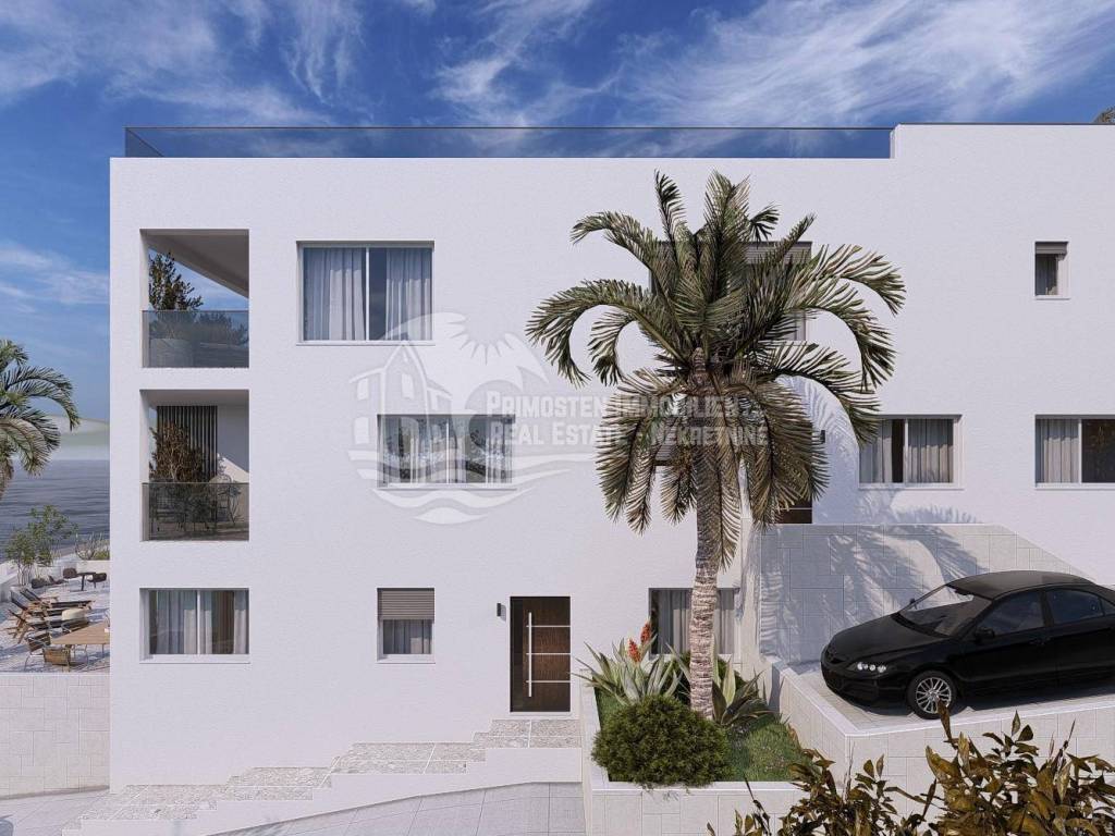 This luxurious, newly built project, located in the first row to the sea, was carefully designed to combine luxury and comfort, making it the perfect choice for those seeking an upscale lifestyle in one of the most desirable coastal locations. Apartment S3 is located in a small residential building with a total of four units and is just 15 meters from the sea. It is ideally south-facing and is located on the first floor. The total living area is 69.11 m² and consists of a kitchen-diner, two bedrooms, a hallway, and a bathroom. The living room opens onto a spacious, covered balcony with unobstructed views of the crystal-clear sea and the islands. The apartment includes an outdoor parking space. High-quality materials were used in the construction and furnishings (high-quality tiles and sanitary ware, air conditioning in every room, underfloor heating, etc.). The prime location in the first row to the sea, the modern design, modern amenities, and proximity to all major amenities, including Split International Airport (10 km away) and the cities of Trogir, Split, and Šibenik, make these apartments unique on the market. Payment is made in stages.
