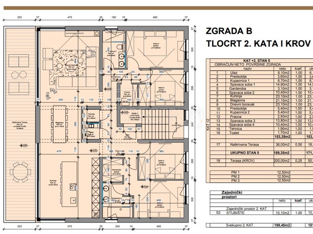 The apartment is located on the 2nd floor of a newly built residential building with 5 residential units. The living area is 153.35 m2. The apartment consists of an open space living room with kitchen and dining room, 4 bedrooms, 2 bathrooms, toilet, wardrobe, laundry room, hallway and technical room. The living room leads to a spacious covered terrace of 36 m2, which is an ideal space for enjoying the outdoors. The layout of the rooms in the apartment allows the new owner to turn one large apartment into 2 smaller apartments. The apartment also has a spacious roof terrace of 200 m2. There is a jacuzzi on the roof terrace, and the roof terrace offers a beautiful view of the sea and nature.