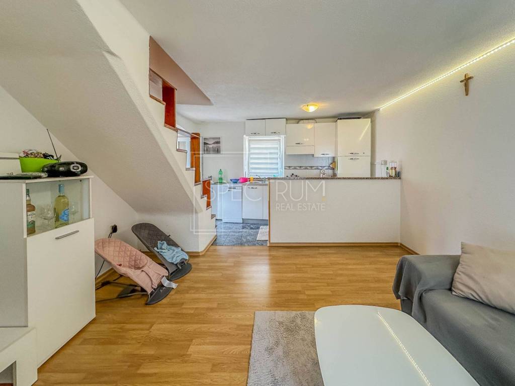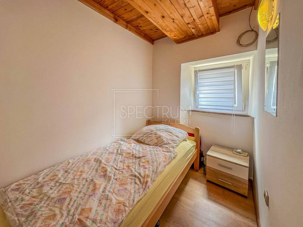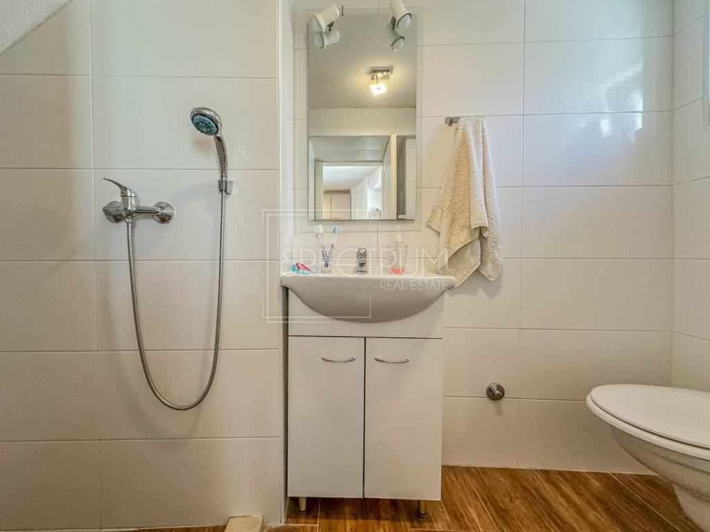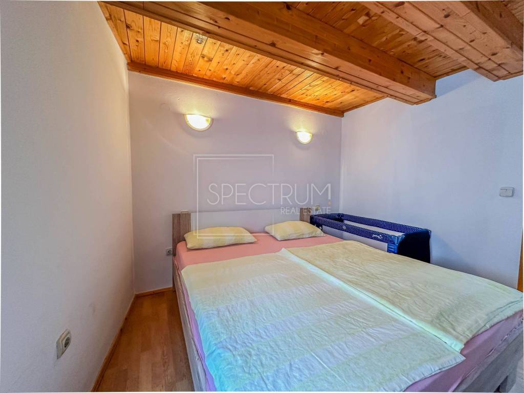 The larger apartment has a separate entrance, and is reached by external stairs. Under the external stairs there is an additional storage space. On the 1st floor there is a living room together with a kitchen and dining room. Internal stairs lead to the attic where there are 2 bedrooms and a bathroom. From the kitchen there is an exit to a covered entrance terrace with a view of the sea.