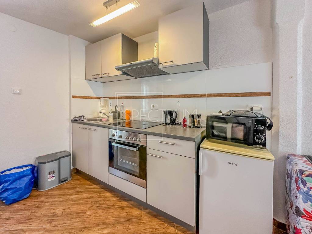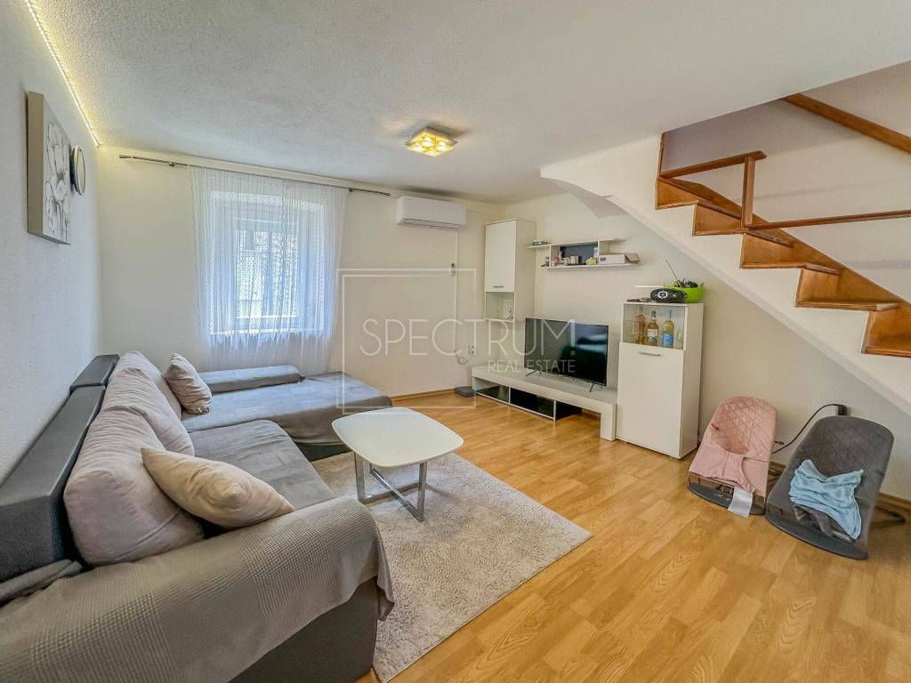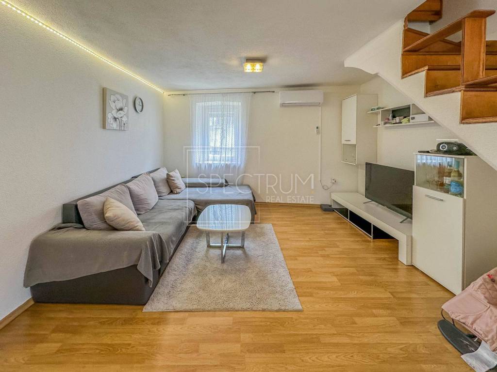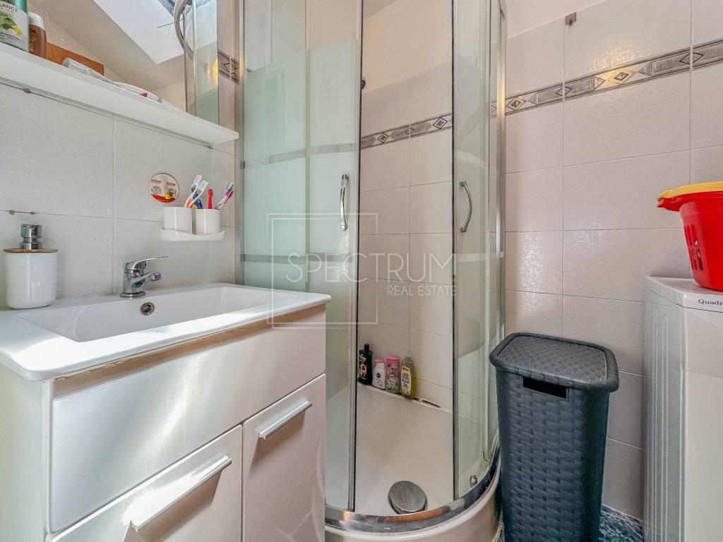 The larger apartment has a separate entrance, and is reached by external stairs. Under the external stairs there is an additional storage space. On the 1st floor there is a living room together with a kitchen and dining room. Internal stairs lead to the attic where there are 2 bedrooms and a bathroom. From the kitchen there is an exit to a covered entrance terrace with a view of the sea.