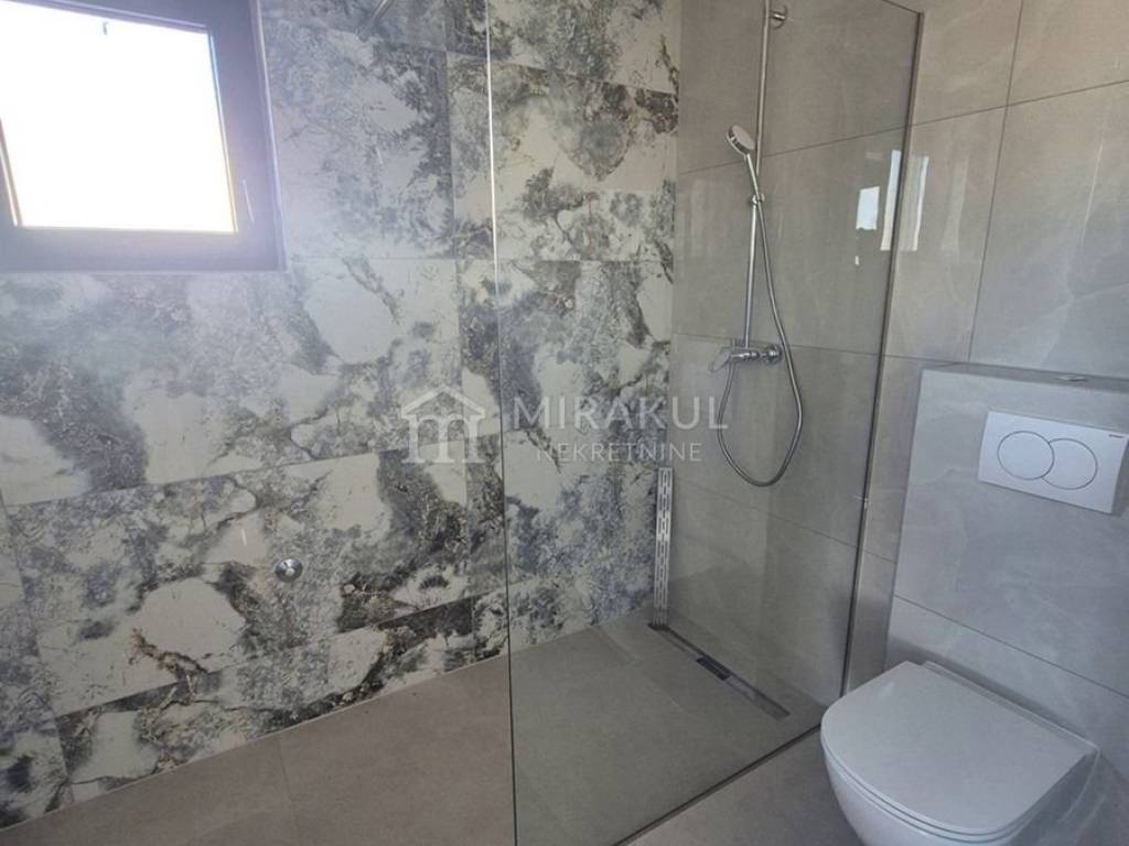 The apartment has a parking lot, the staircase has an iron railing. The stairs are made of stone. The rooms will have laminat flooring, electric underfloor heating, all rooms are air-conditioned, PVC joinery, electric shutters, mosquito nets, glass terrace railing.