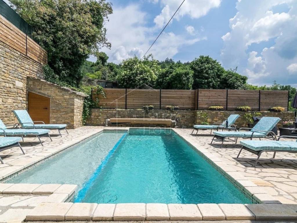 Istrian stone house for sale with a swimming pool with a beautiful panoramic view of Motovun. The house is located on the edge of a small settlement, which guarantees complete peace and privacy. Access to the property is provided by an asphalted road, and Motovun is only a few minutes away by car.