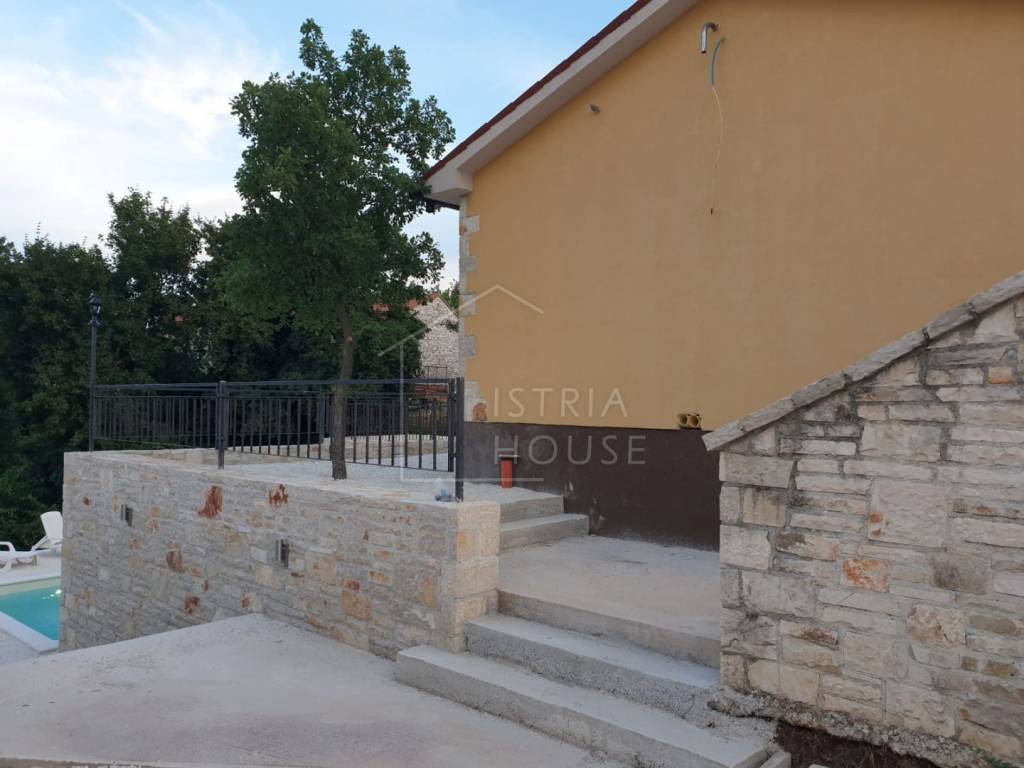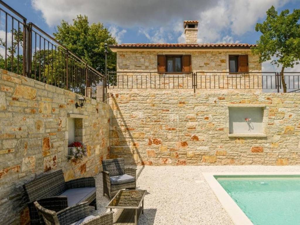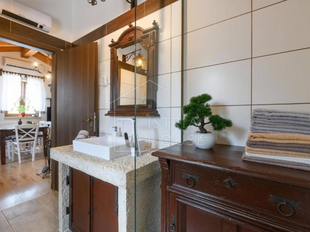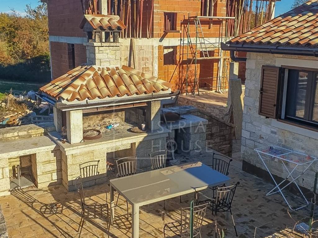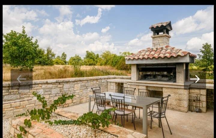 A smaller, already built building of 50 m2 consists of one bedroom, bathroom, living room and kitchen with dining area. In front of this building there is a swimming pool with a sunbathing area, a jacuzzi and an outdoor terrace with a barbecue and seating. It was built in the traditional Istrian style, so the interior was decorated respecting tradition and using the same materials and furniture.