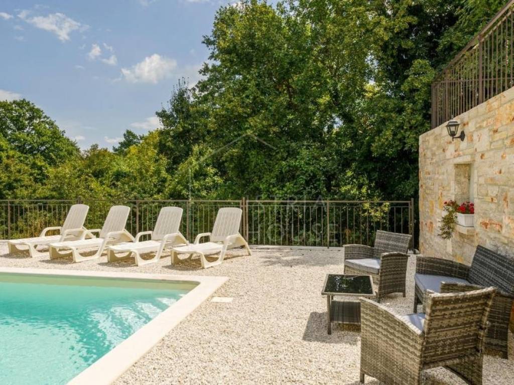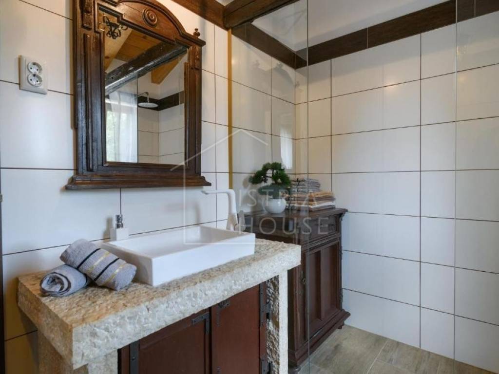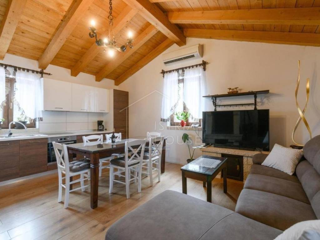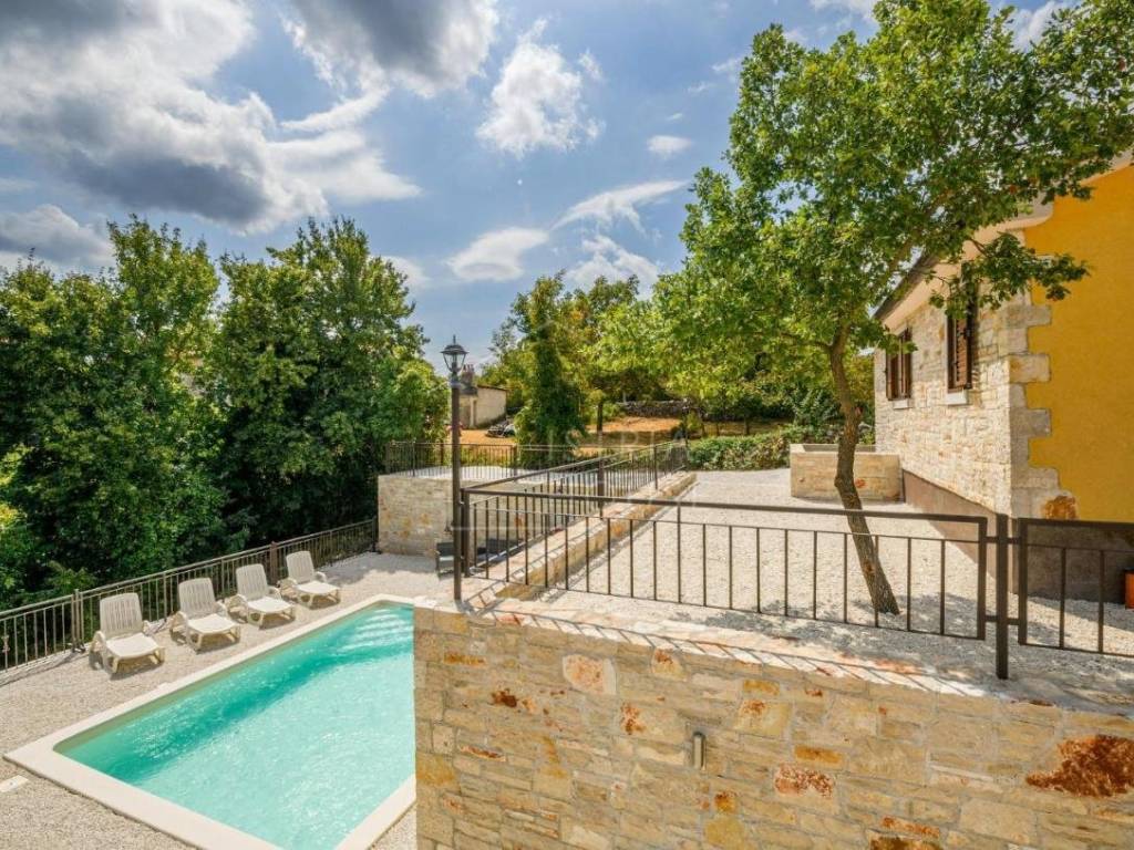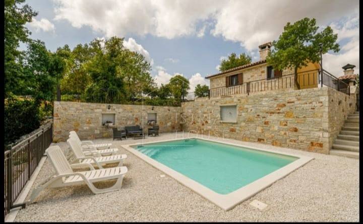 A smaller, already built building of 50 m2 consists of one bedroom, bathroom, living room and kitchen with dining area. In front of this building there is a swimming pool with a sunbathing area, a jacuzzi and an outdoor terrace with a barbecue and seating. It was built in the traditional Istrian style, so the interior was decorated respecting tradition and using the same materials and furniture.
