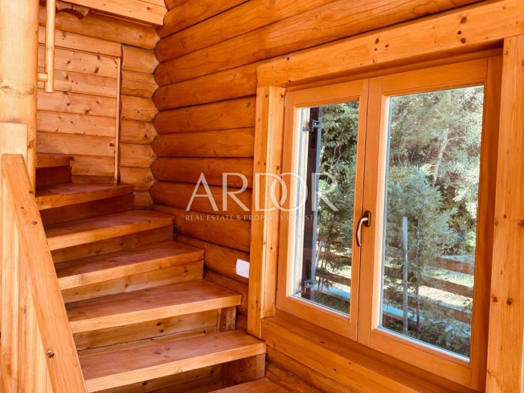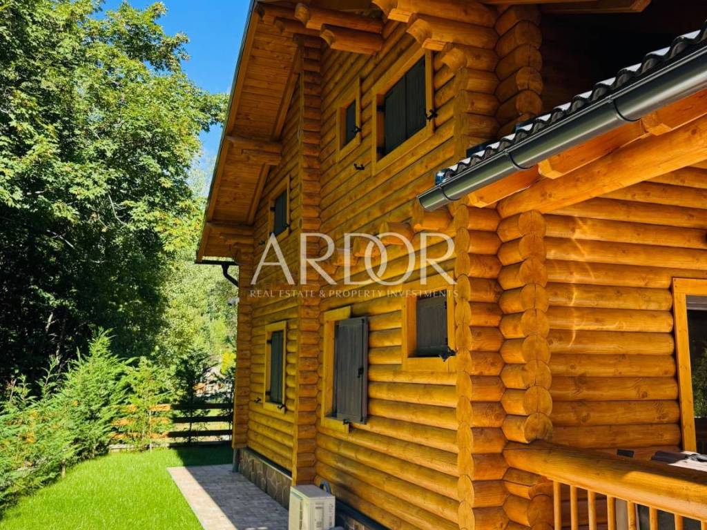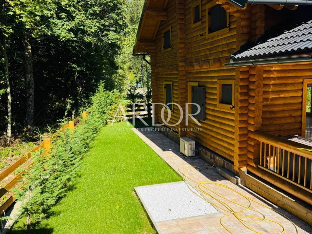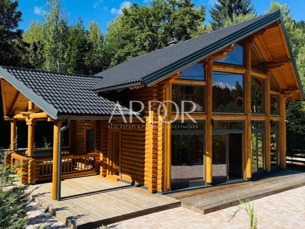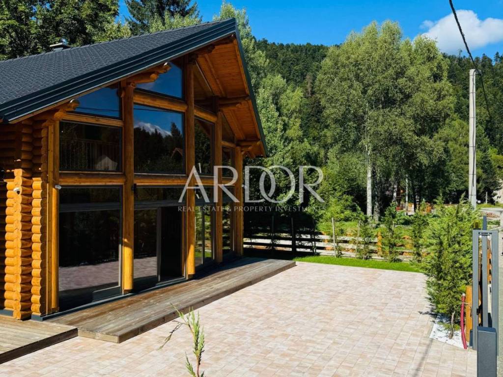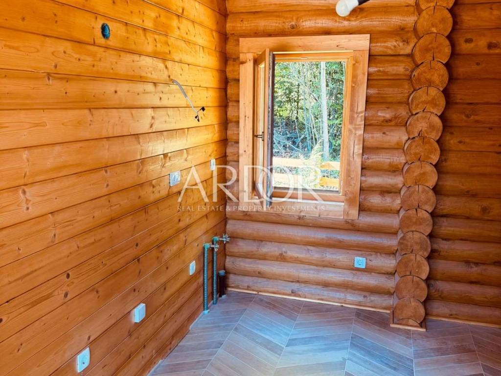 New Build - House Made Entirely from Machine-Processed Logs with a Diameter of 23 cm. The house is situated in a highly attractive location in Fužine, near Lake Bajer and Lake Lepenica.