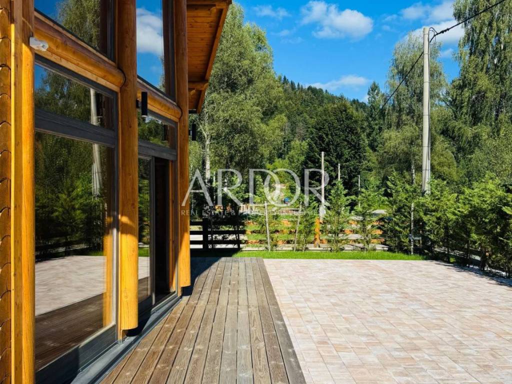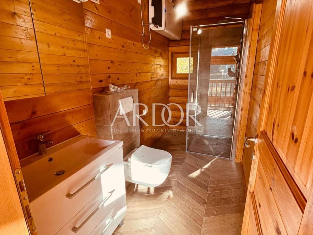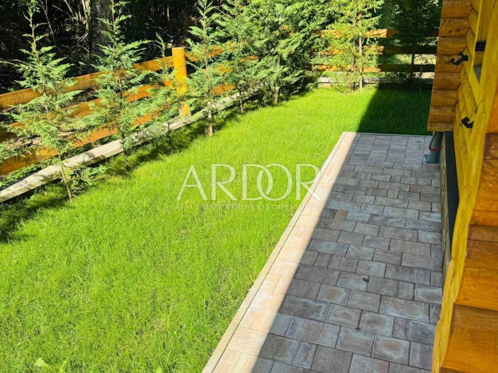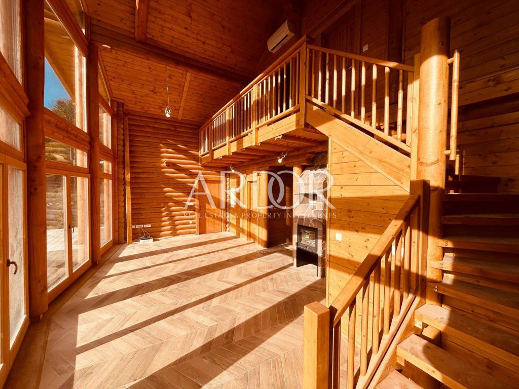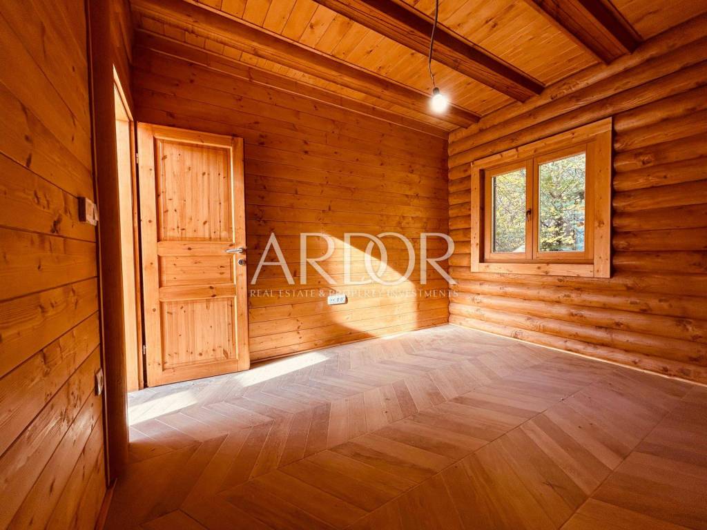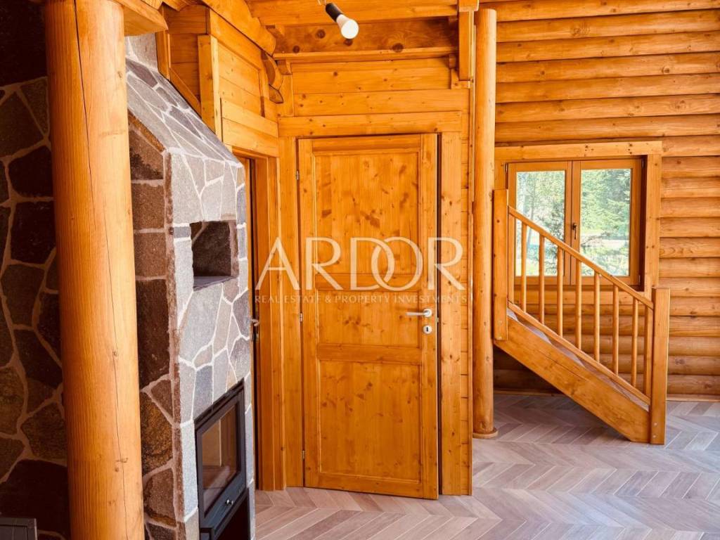 New Build - House Made Entirely from Machine-Processed Logs with a Diameter of 23 cm. The house is situated in a highly attractive location in Fužine, near Lake Bajer and Lake Lepenica.
