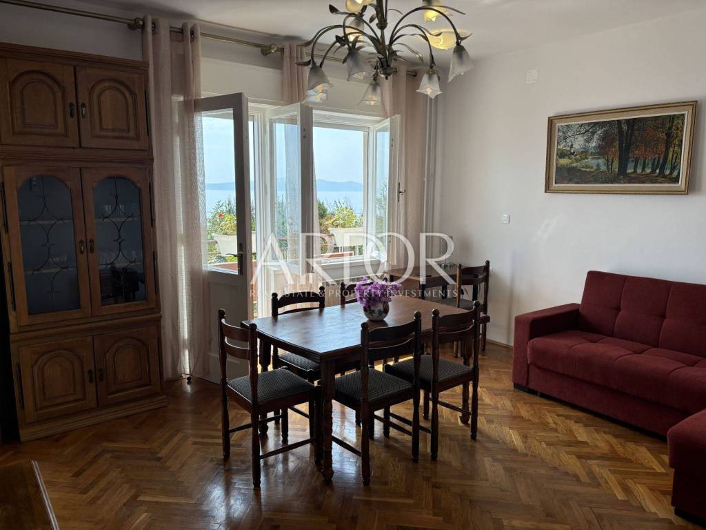 Apartment for rent 200 meters from the sea in Ičići / Opatija, surface area 104 m2. The apartment has two rooms, a kitchen, a living room, a bathroom with a toilet and a separate toilet, a storage room, a balcony. The apartment is air-conditioned (heating/cooling), has oil central heating, optics have been introduced. The apartment is located on the first floor of a family house, has a separate entrance, separate electricity and water meters. The house was built in 1975, completely renovated in 2024. It is located on a plot of 1500 m2, it has a yard with a parking space, a garden, a green garden, a sun terrace of 70 m2.