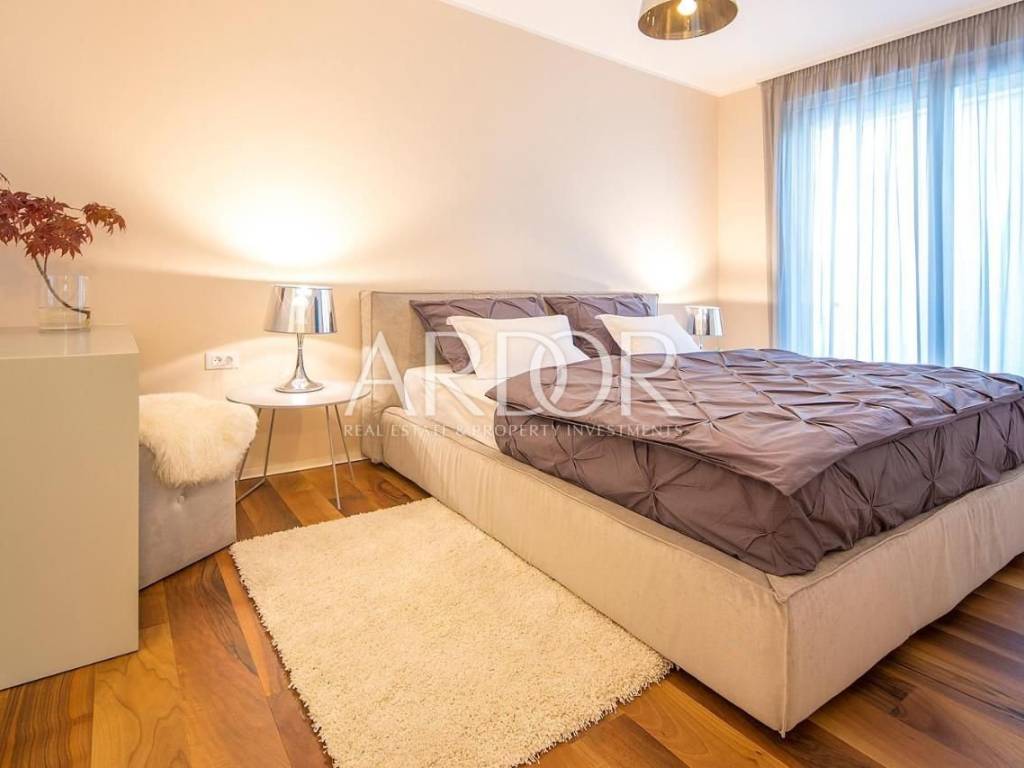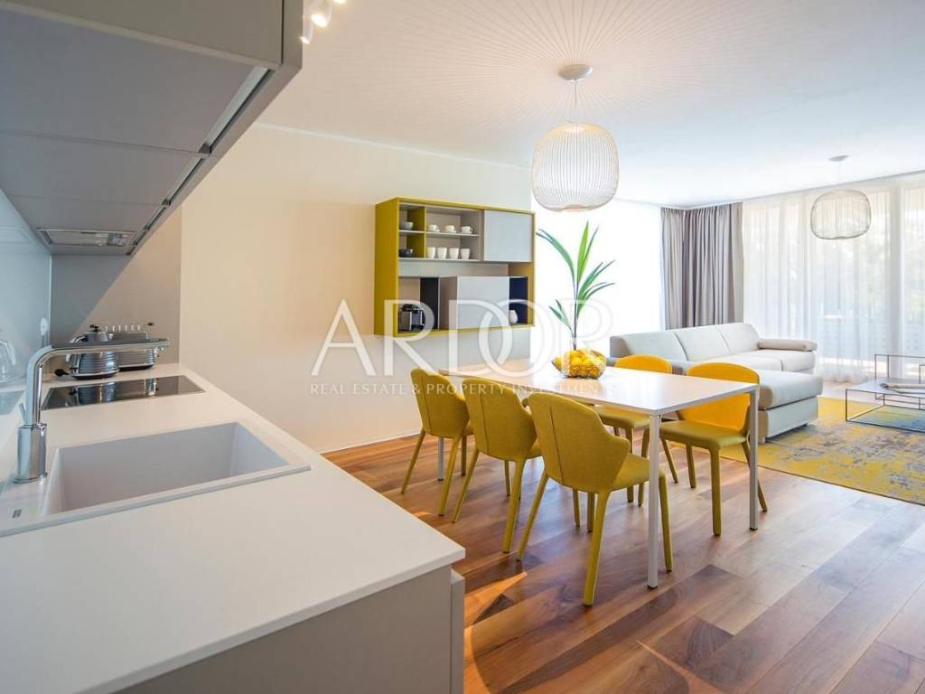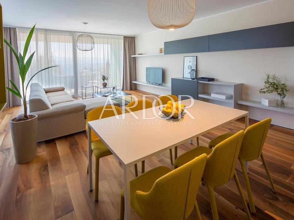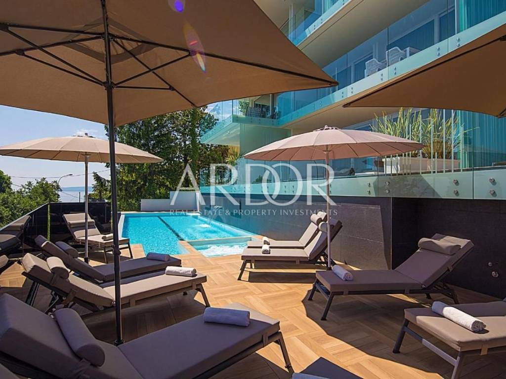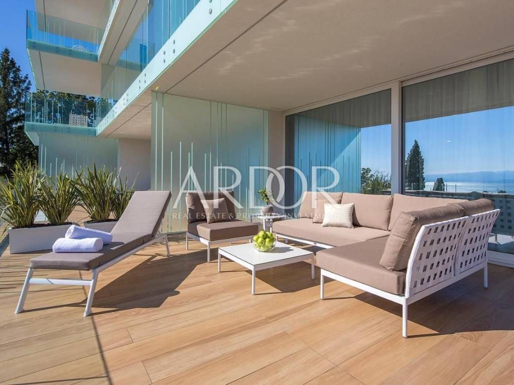 It consists of a living room with an open-plan kitchen and dining area, two bedrooms, two bathrooms, a hallway and a wardrobe. An additional advantage is a beautiful covered terrace and a landscaped garden, perfect for morning coffee and relaxation with a view of the sea and Opatija.
