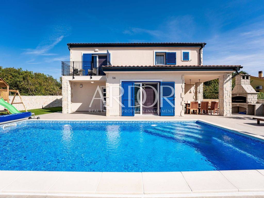 The outdoor area with a 32 m2 heated swimming pool and sunbathing area is surrounded by greenery and Mediterranean plants. It also includes a children's playground, a lounge area with barbecue and an outdoor dining area, perfect for relaxation and family gatherings.