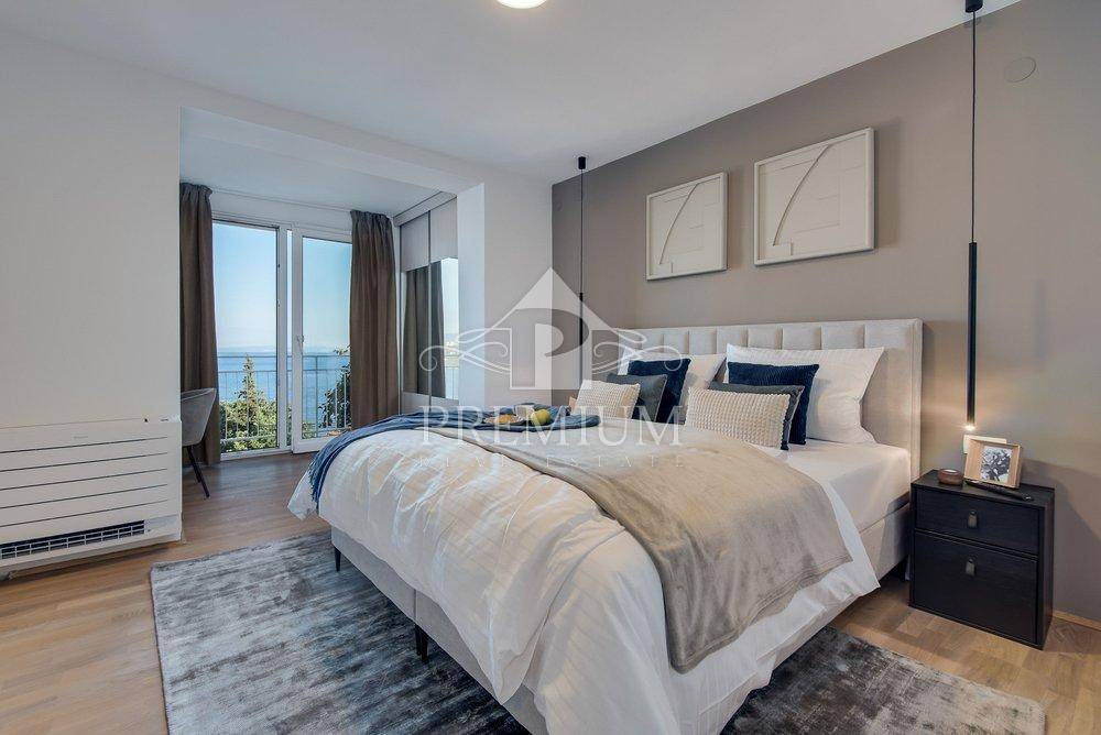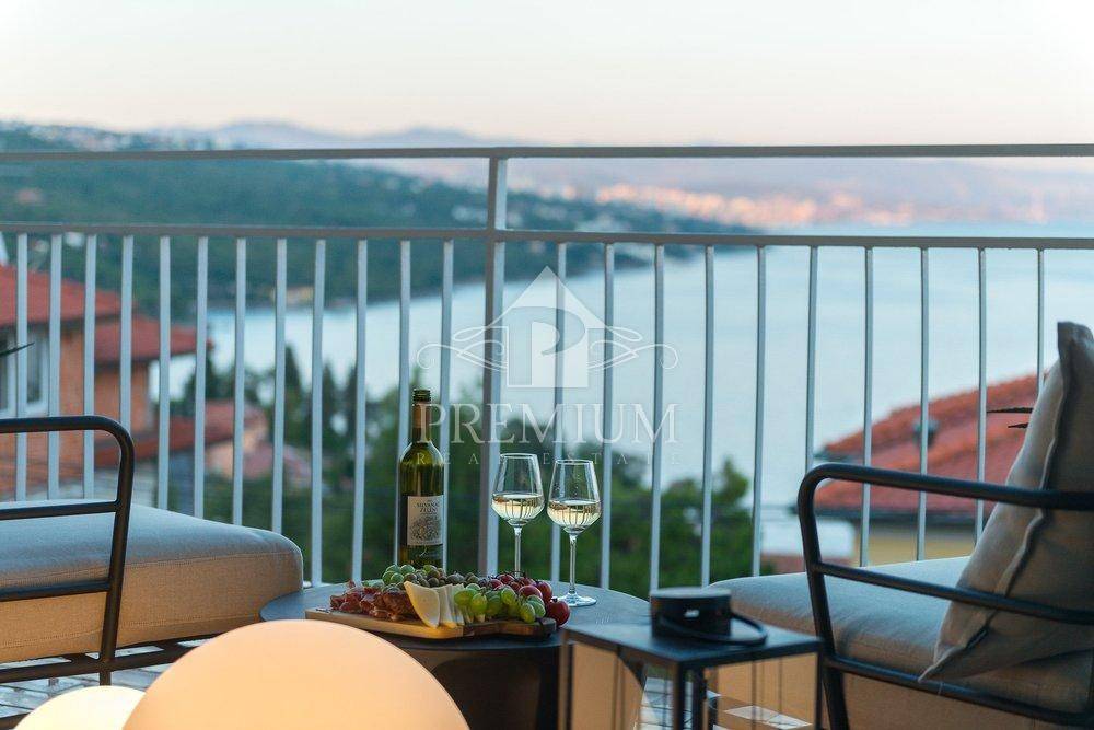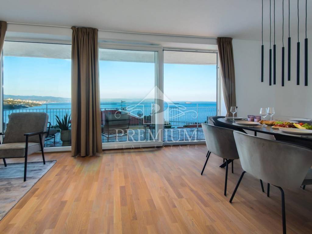 We offer a luxuriously decorated apartment with an area of 121.35 m2, including a balcony, which is only a few minutes' walk from the beach and the sea. The apartment was completely renovated in 2022 and consists of an entrance hall, kitchen and dining room, spacious living room, two bedrooms, bathroom and toilet, and a terrace. From the living room and one of the bedrooms there is a beautiful view of the sea and the entire Kvarner. Air conditioners are in all rooms, fully equipped kitchen and modern interior. The living room has a smart TV and a modern sofa that can be converted into a sofa bed. There is one parking space in the garage, and any other car can be parked on the street or in designated parking spaces (for a fee). The house is located in a very attractive location, close to all necessary amenities.