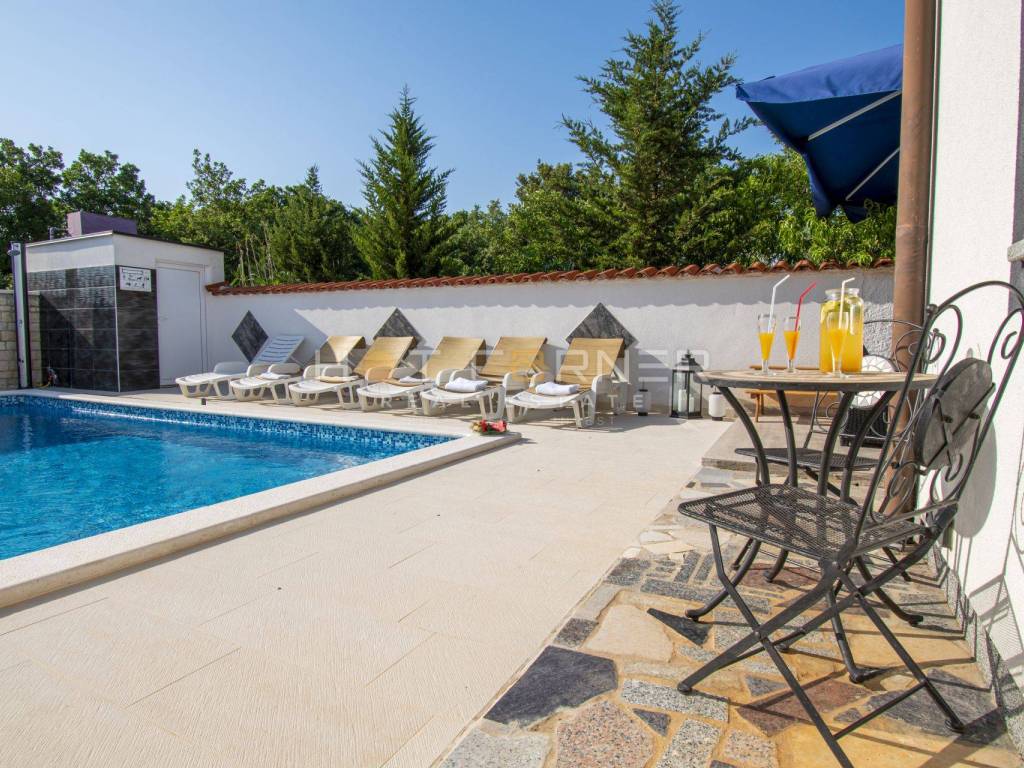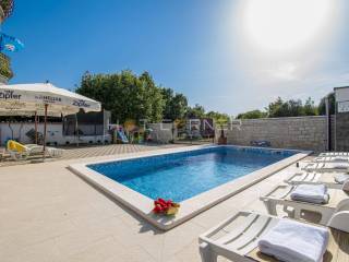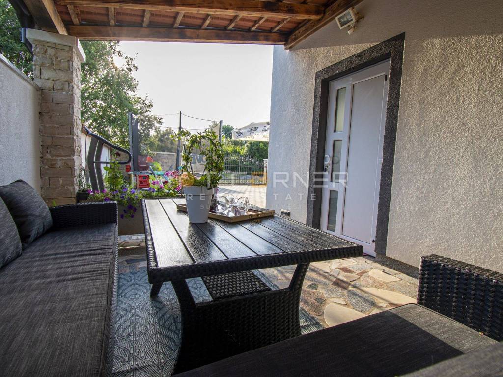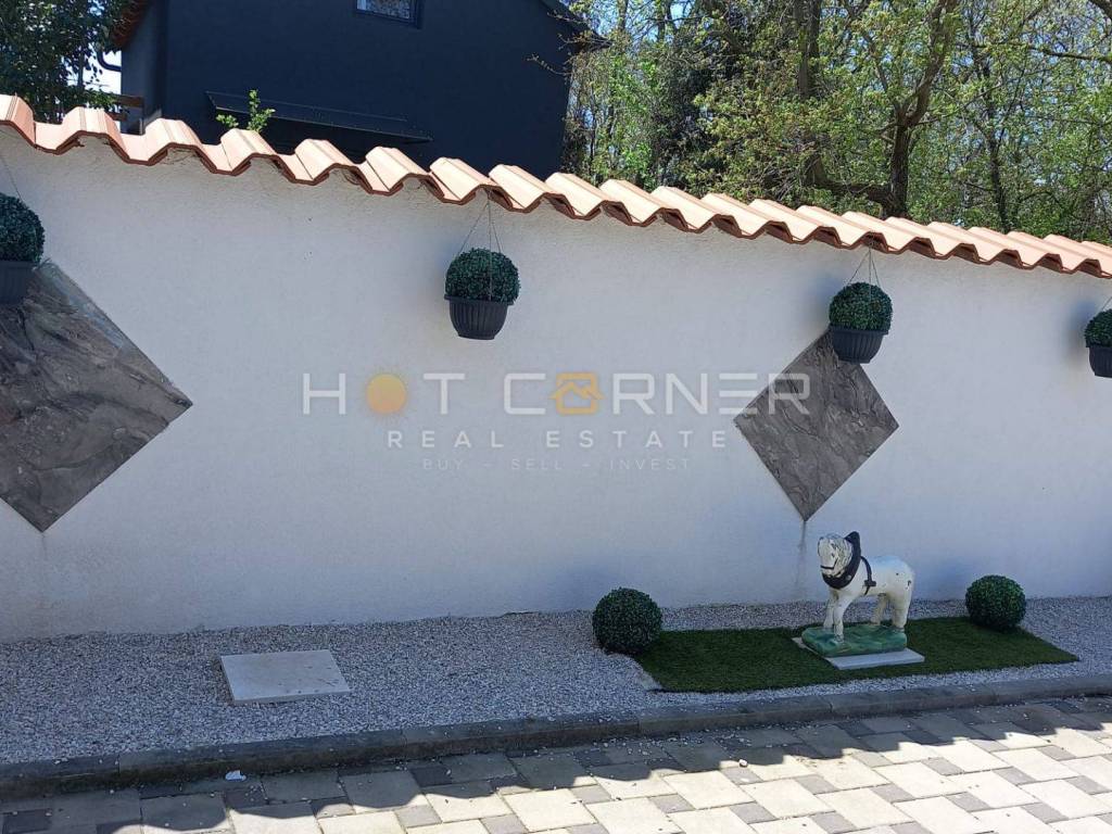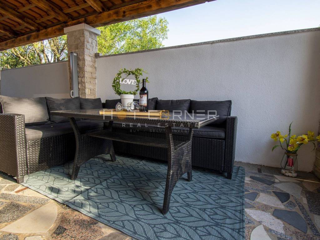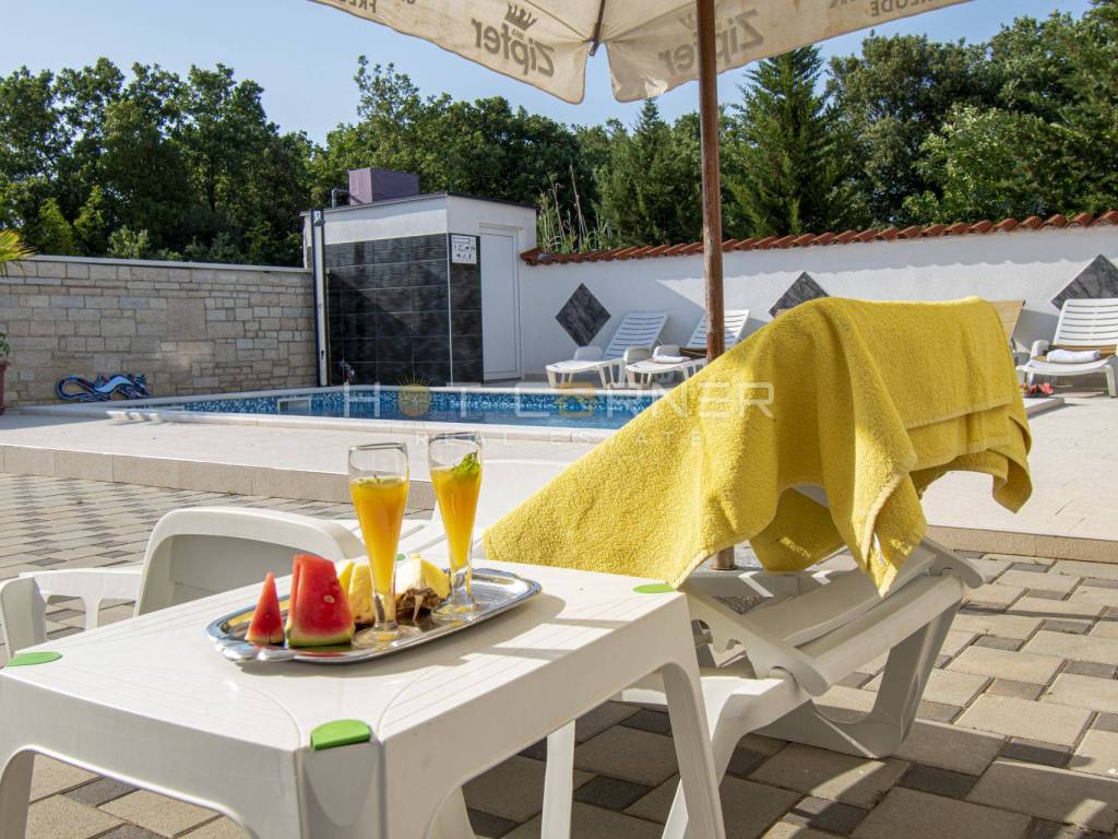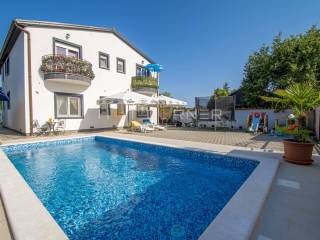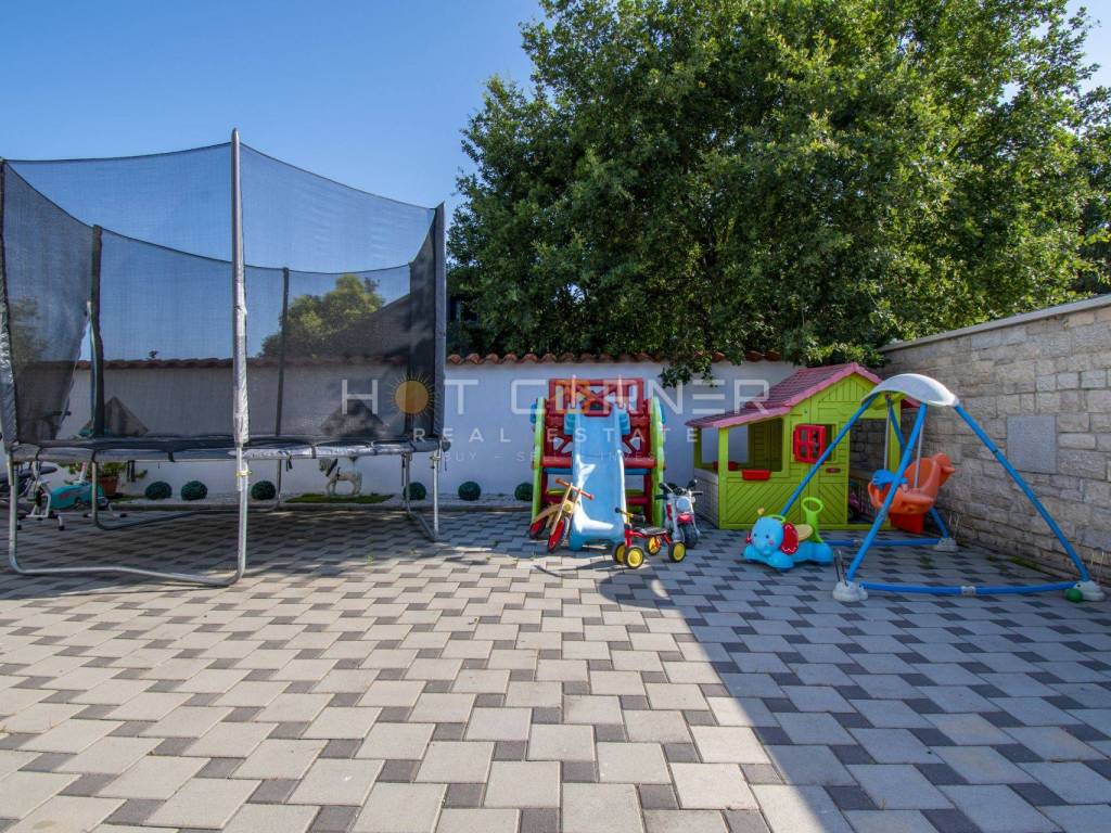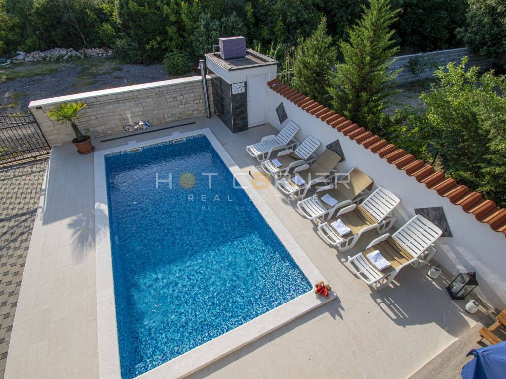 For sale, a modern, standalone house of recent construction in the wider area of Veliki Vrh, Pula, with an area of around 260m2 and a swimming pool. The house is situated on a beautiful plot of approximately 515m2, surrounded by greenery, featuring a well-maintained garden with a heated pool, sunbathing area, barbecue, and space for socializing and dining.