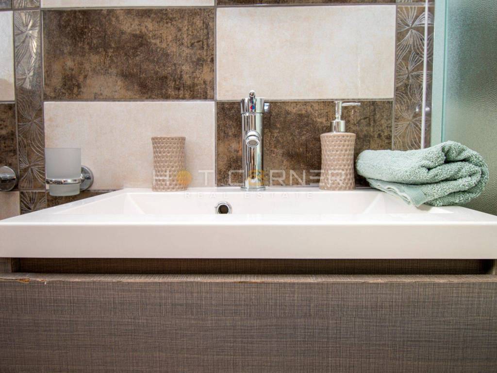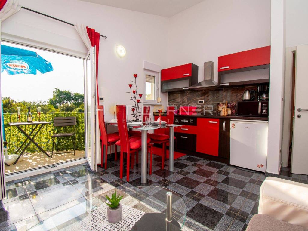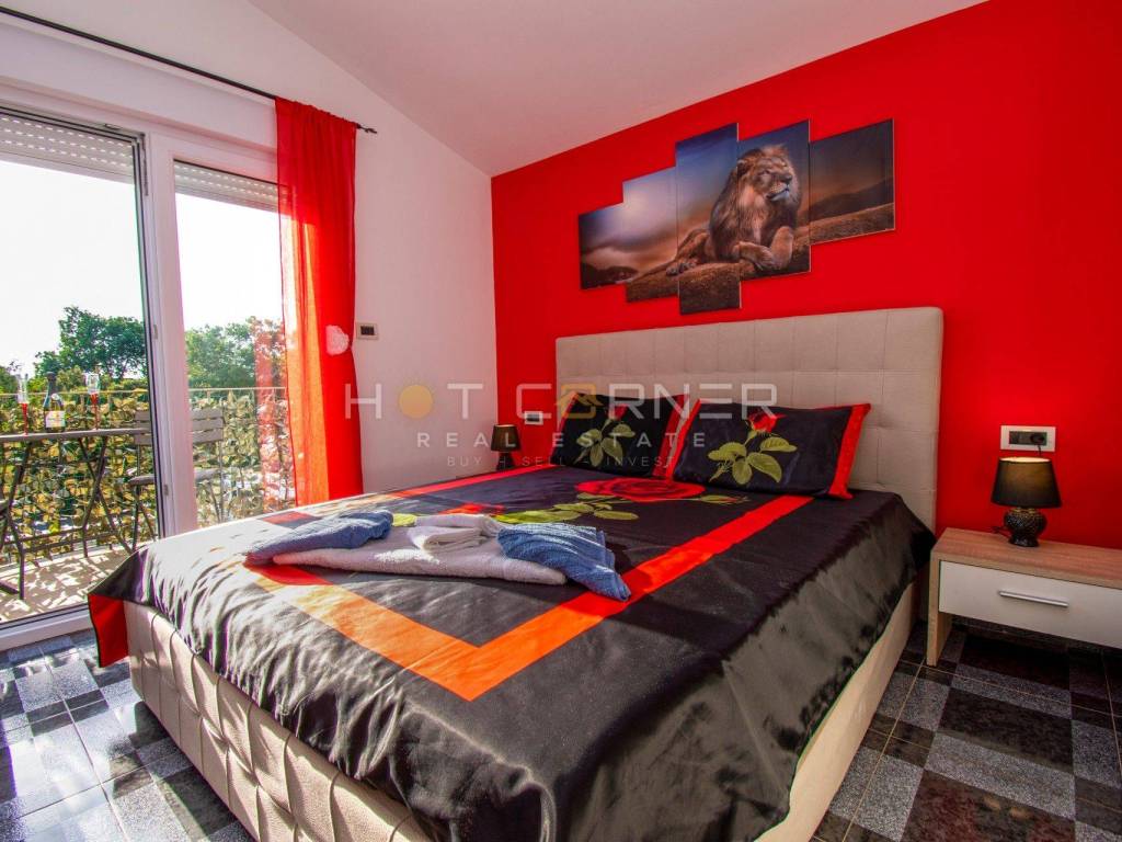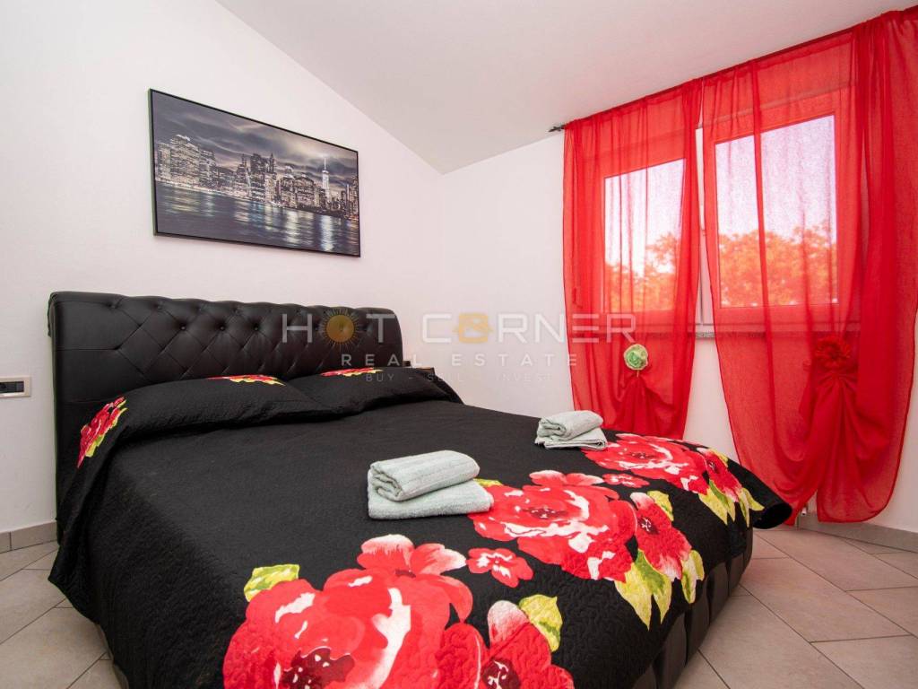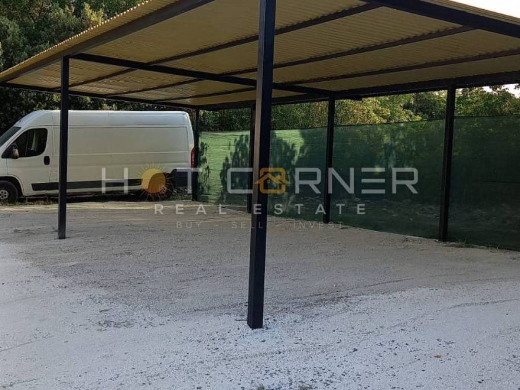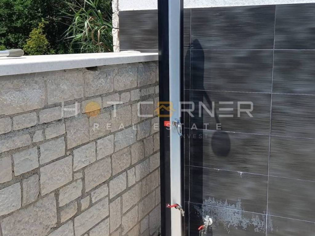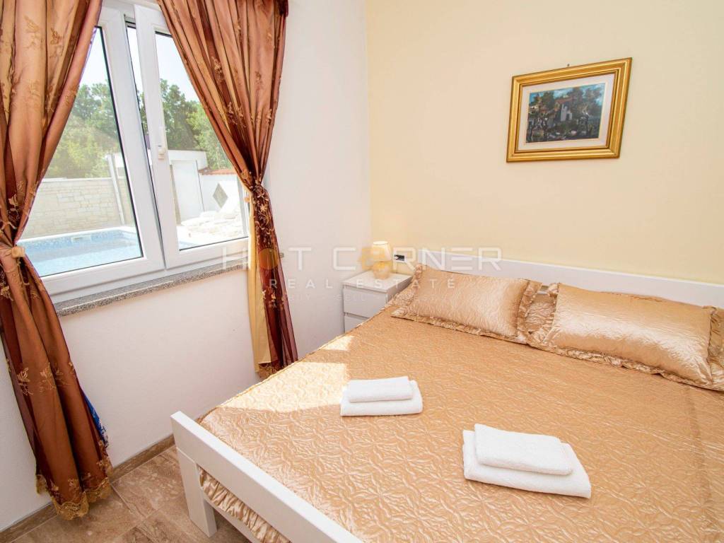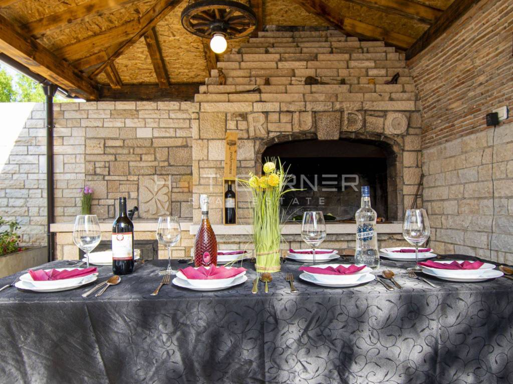 For sale, a modern, standalone house of recent construction in the wider area of Veliki Vrh, Pula, with an area of around 260m2 and a swimming pool. The house is situated on a beautiful plot of approximately 515m2, surrounded by greenery, featuring a well-maintained garden with a heated pool, sunbathing area, barbecue, and space for socializing and dining.