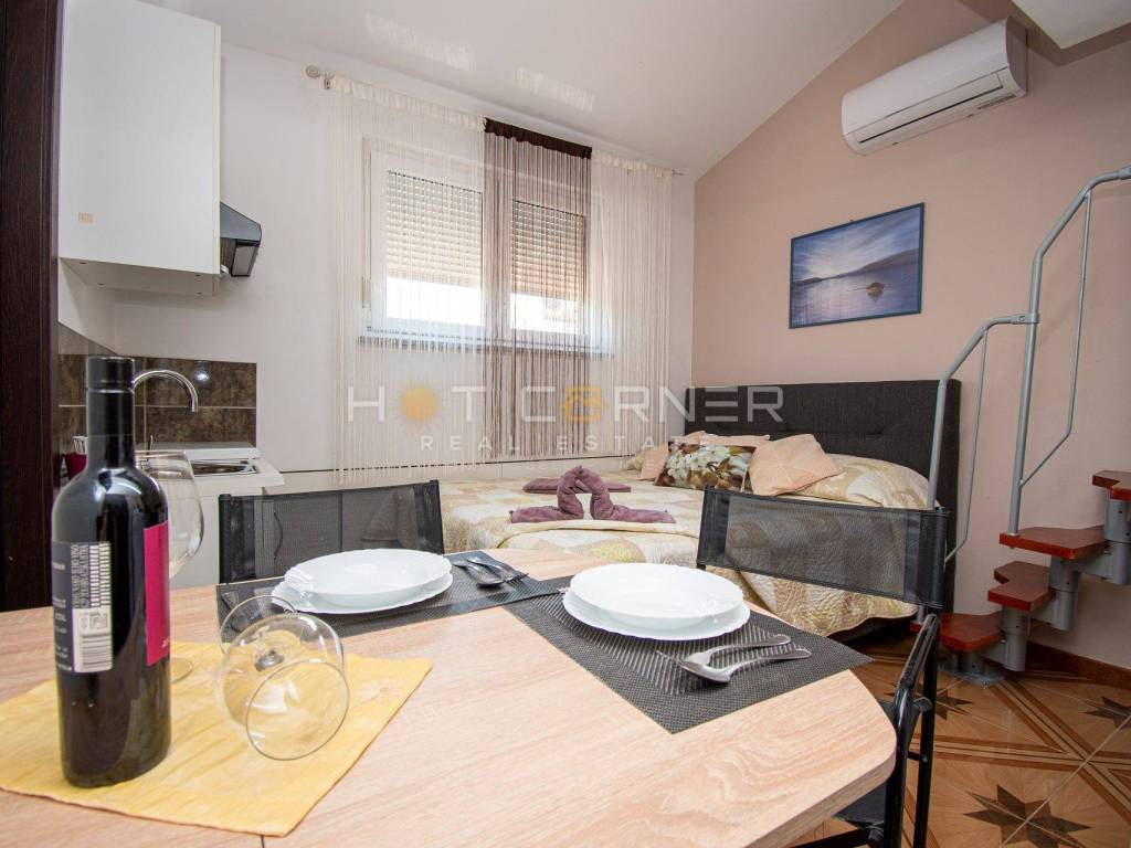 5// A studio apartment on the first floor of approximately 48m2 (in gray-cream color in the pictures), featuring an open-space living room, kitchen and dining area, bedroom, bathroom, and a gallery.