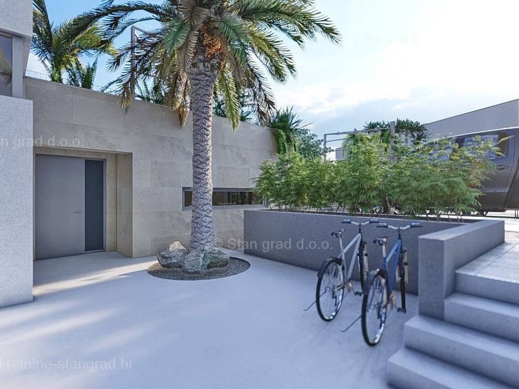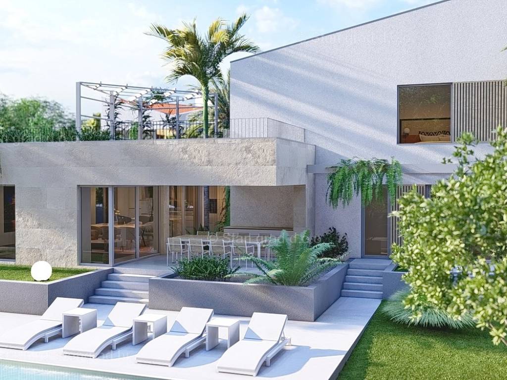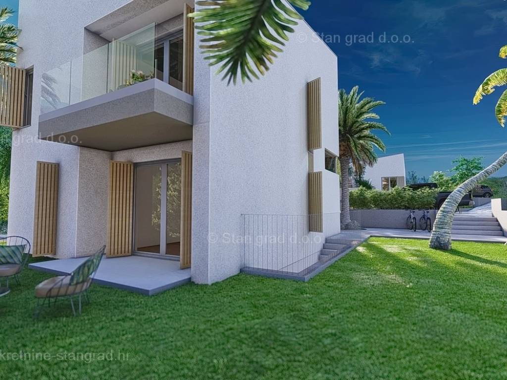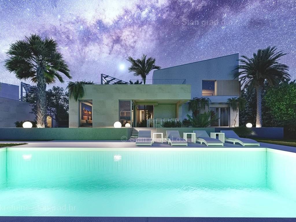 At the Stan Grad Immobilien agency in Kvarner, an exclusive designer project is for sale – a luxury villa located in the northern Adriatic Mediterranean region of the island of Krk, at the highest point of the coastal town of Malinska, with a stunning sea view. This detached villa is perfect for those seeking a luxurious retreat that offers privacy, not only during the summer months but throughout the entire year.