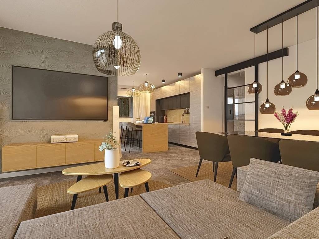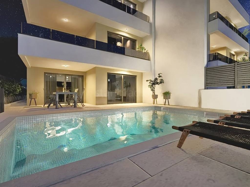 This is a spacious and comfortable single-level apartment located on the ground floor of a contemporary building. The total living area amounts to 108 square meters, comprising a living room with a kitchen and dining area, three bedrooms, two bathrooms, an additional guest toilet, and a terrace. A special feature of this property is the private garden with a swimming pool and sunbathing area, offering the perfect spot for relaxation and enjoyment of the Mediterranean atmosphere.