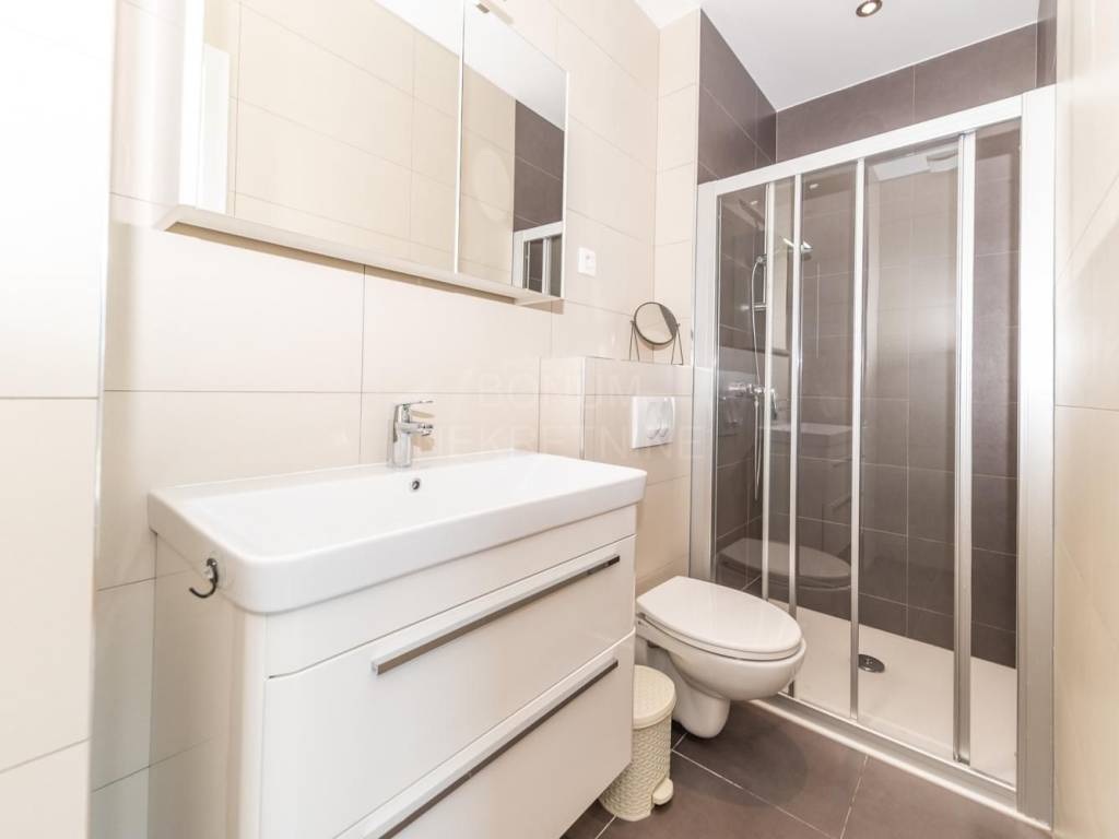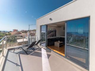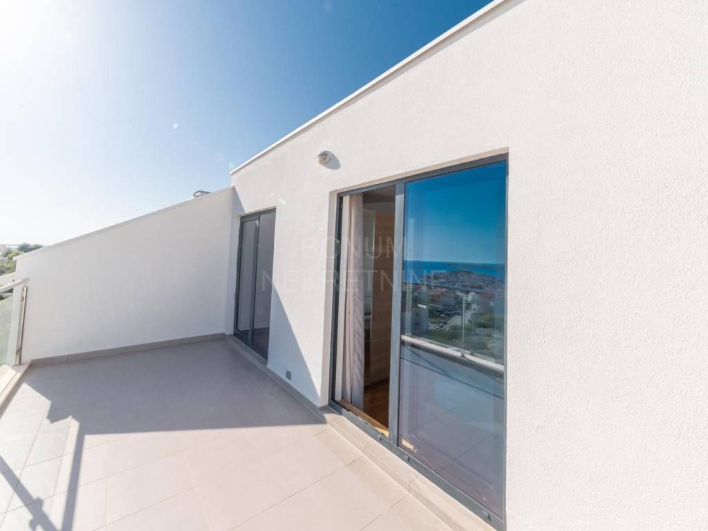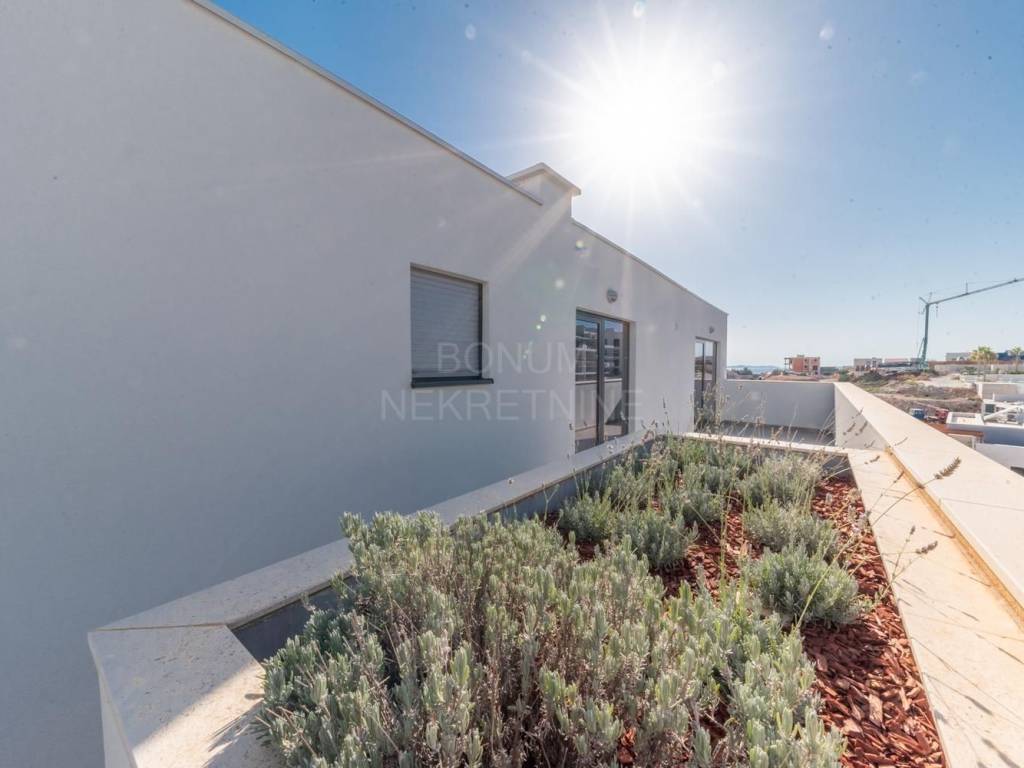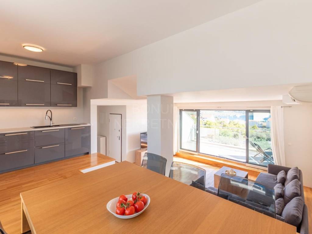 The apartment consists of an entrance area that continues to a spacious living room with a kitchen and a dining room in one unit, from which there is a terrace with a beautiful panoramic view of the sea. In the second part, there are three bedrooms, one of which has a separate bathroom and a terrace with a view of the sea, then two more bathrooms and a large terrace at the back of the apartment.