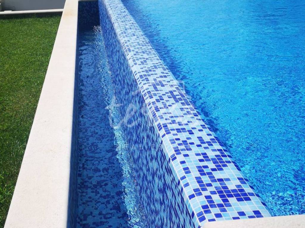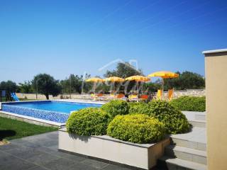 Next to the terrace that surrounds the house, there is a summer kitchen, a swimming pool and a sunbathing area, and there is a children's playground in the beautiful grass yard.