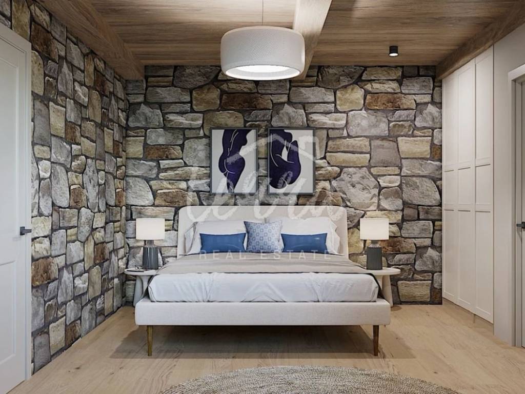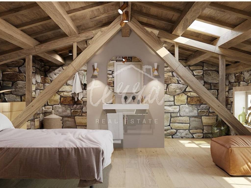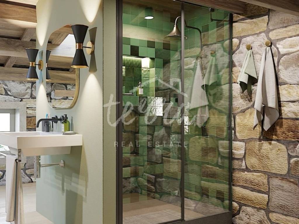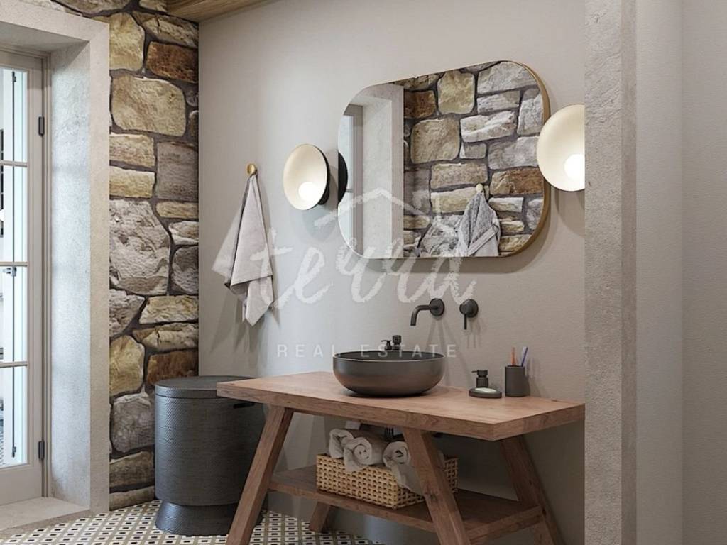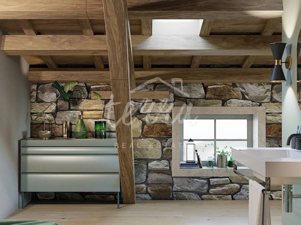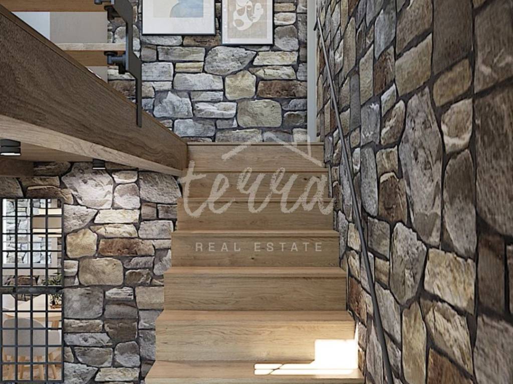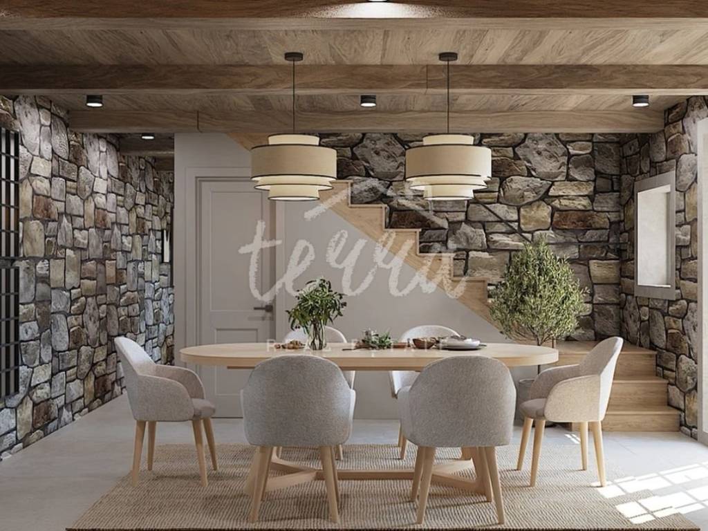 From the ground floor, internal stairs lead to the basement, which has retained its original style (stone walls) and is designed as a wine room that the future owner can decorate according to his own wishes.