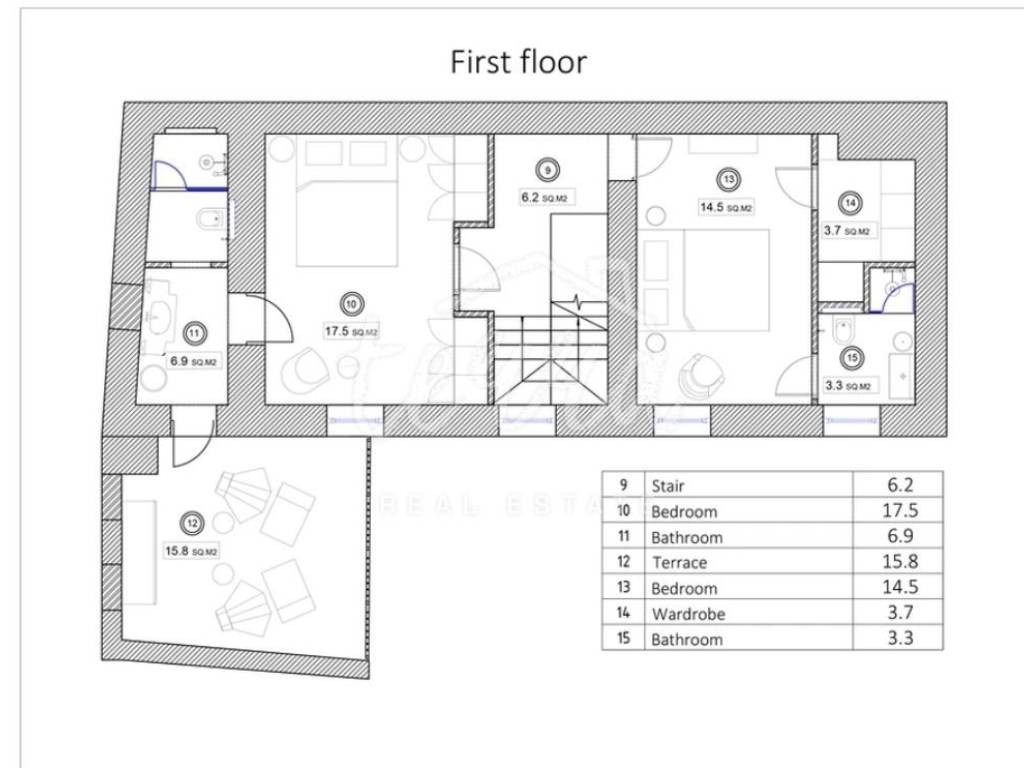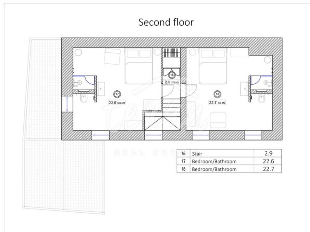 Internal stairs lead to the first floor where there are two bedrooms, each with its own bathroom, and a beautiful covered terrace.