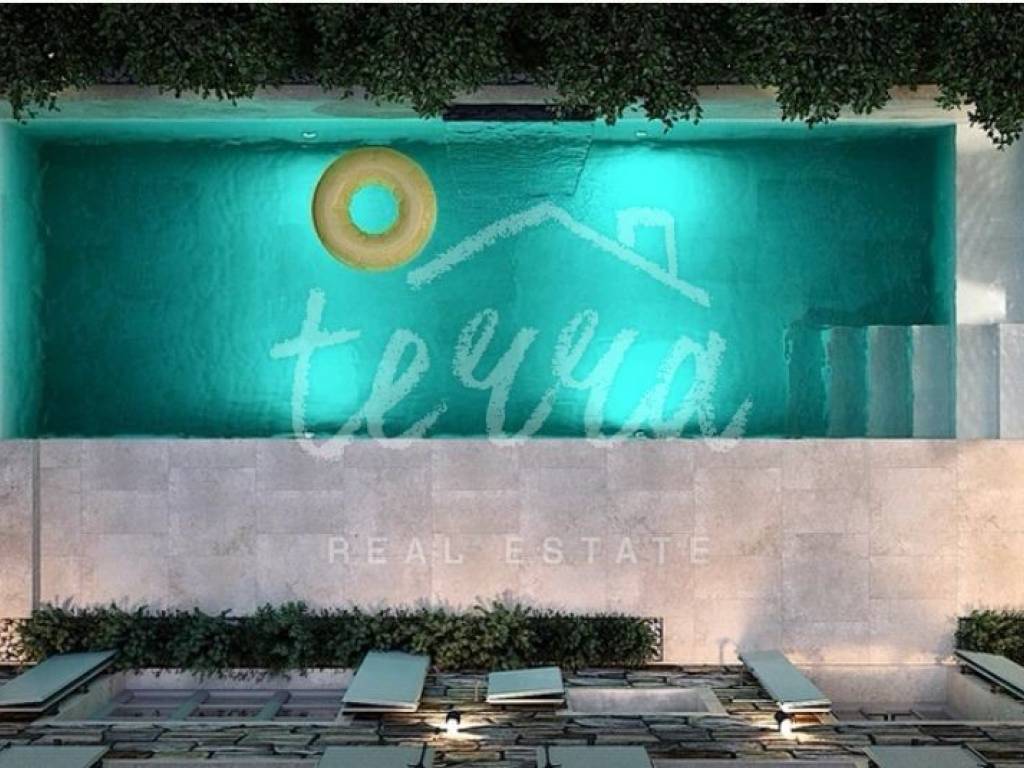 The ground floor consists of a kitchen with a dining room and a living room from which large glass walls lead to the swimming pool, sun deck and sauna.