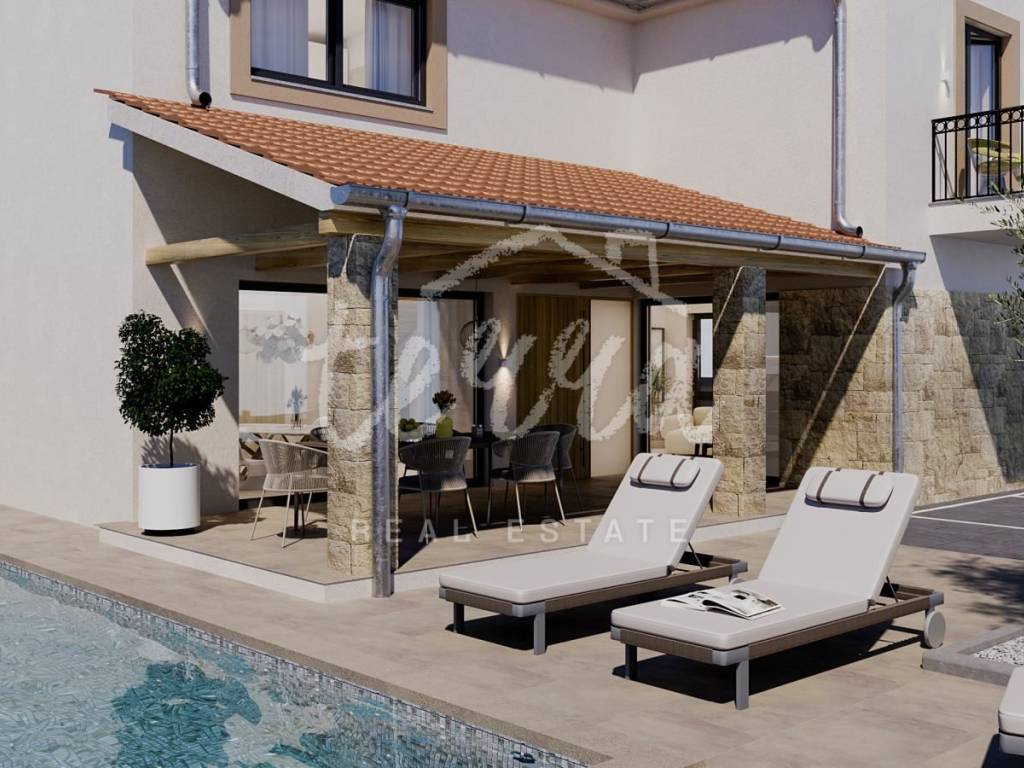 Newly built house for sale, Marčana area. The house has 174m2, a 350m2 garden and a 28m2 swimming pool. In a quiet environment, near the house there is a market and the sea is 3km away. The house is sold fully equipped with external works, a swimming pool and an outdoor barbecue.