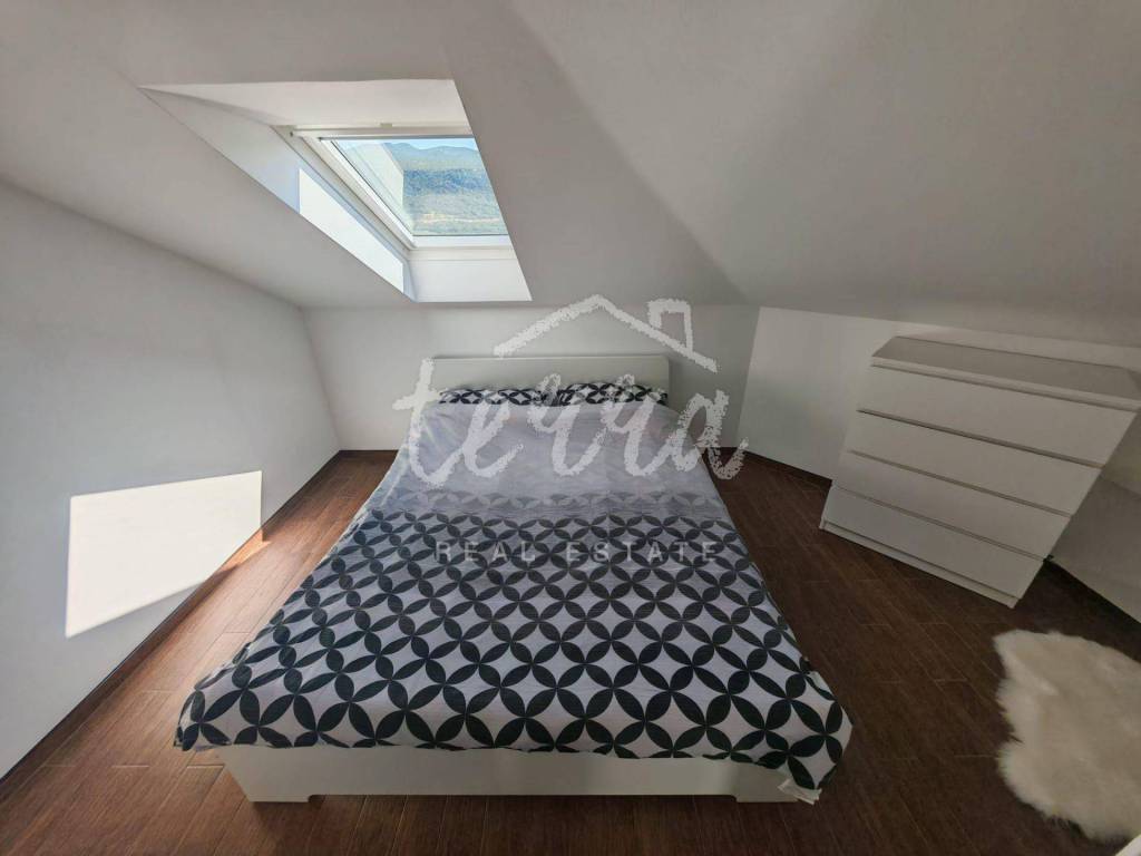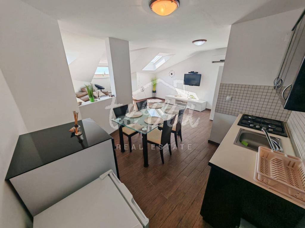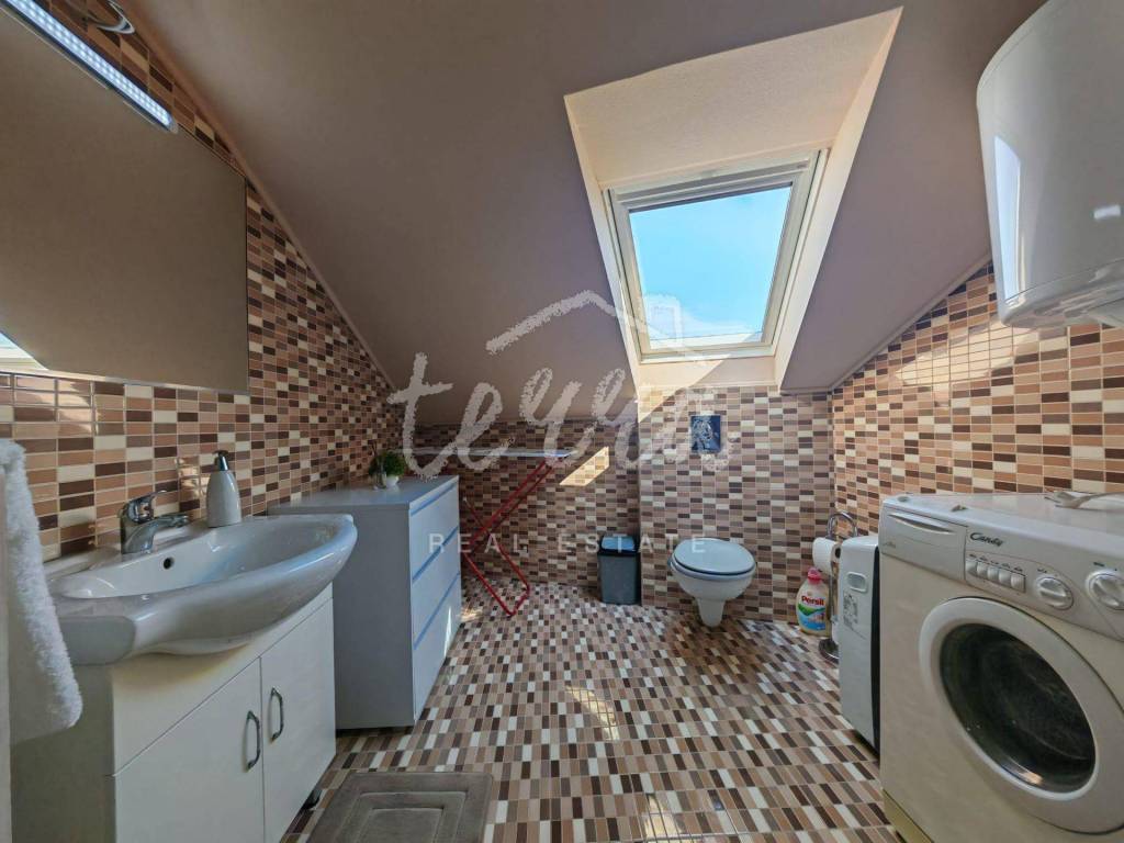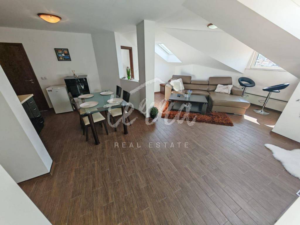 The apartment consists of a bathroom, two bedrooms, a spacious living room connected to the kitchen and dining room. The floor plan of the apartment is 70m2, but due to the slope, 50m2 is registered.