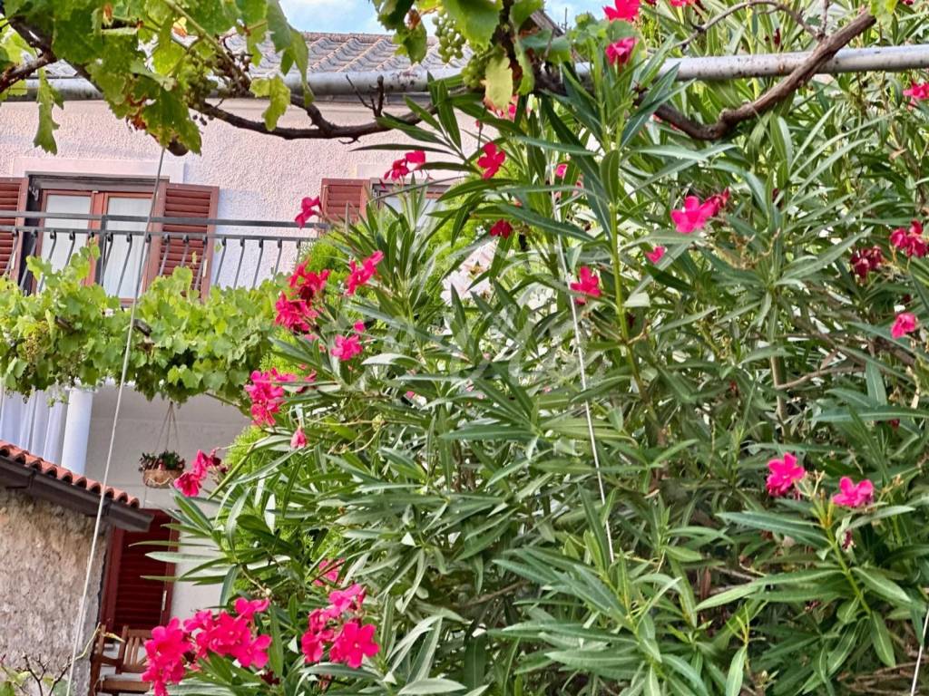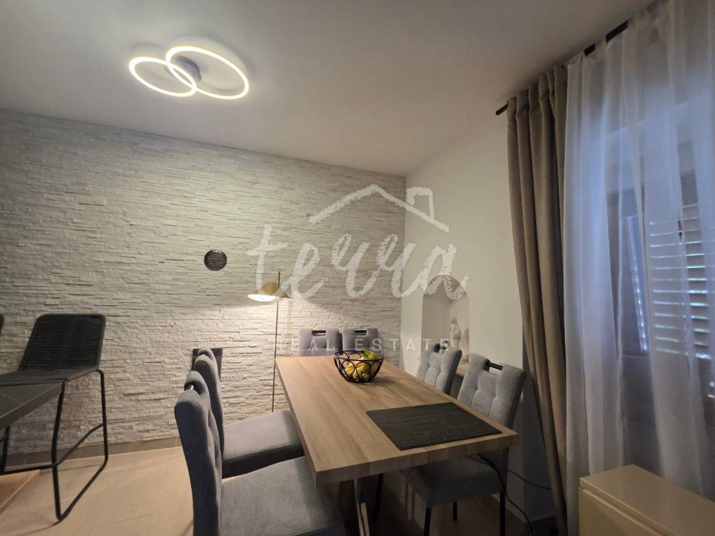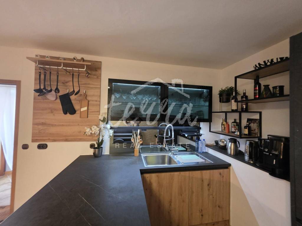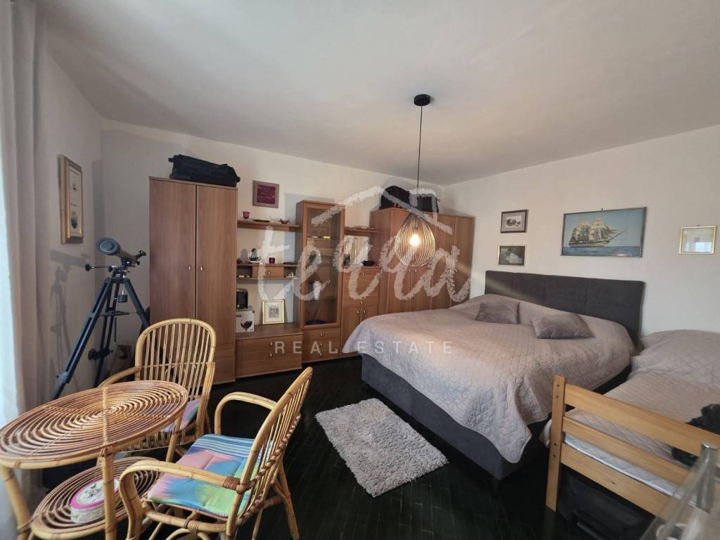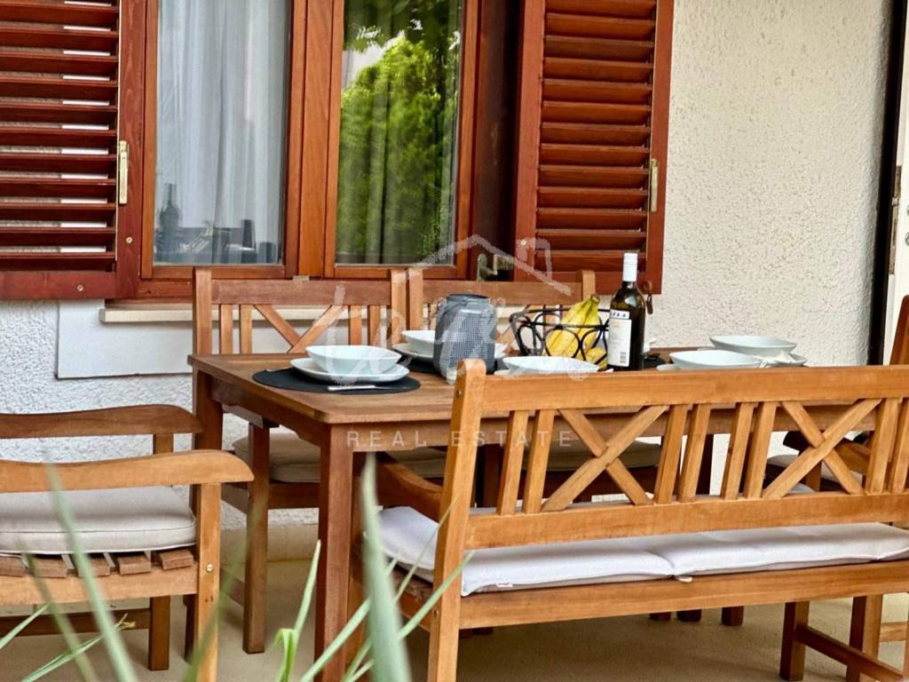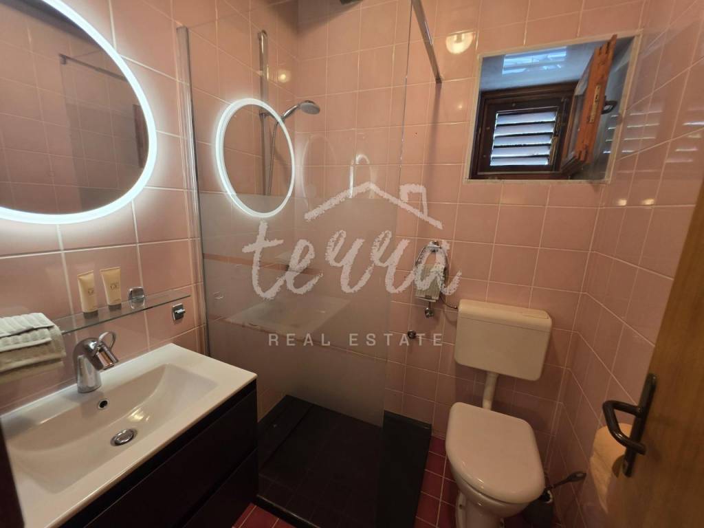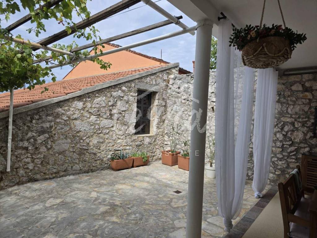 The house is in an excellent location, only 100m from the city center. The ground floor has a kitchen with dining room, living room, bathroom and covered entrance terrace. An internal staircase leads to the first floor where there are two bedrooms, a hallway and a terrace with a beautiful sea view. The yard is landscaped and maintained, and there is a secured parking space in front of the house. There is also an auxiliary building on the plot consisting of a studio apartment, storage room and a spacious roof terrace with an open sea view. This property is ideal for year-round living, but also as an investment for tourist rental.