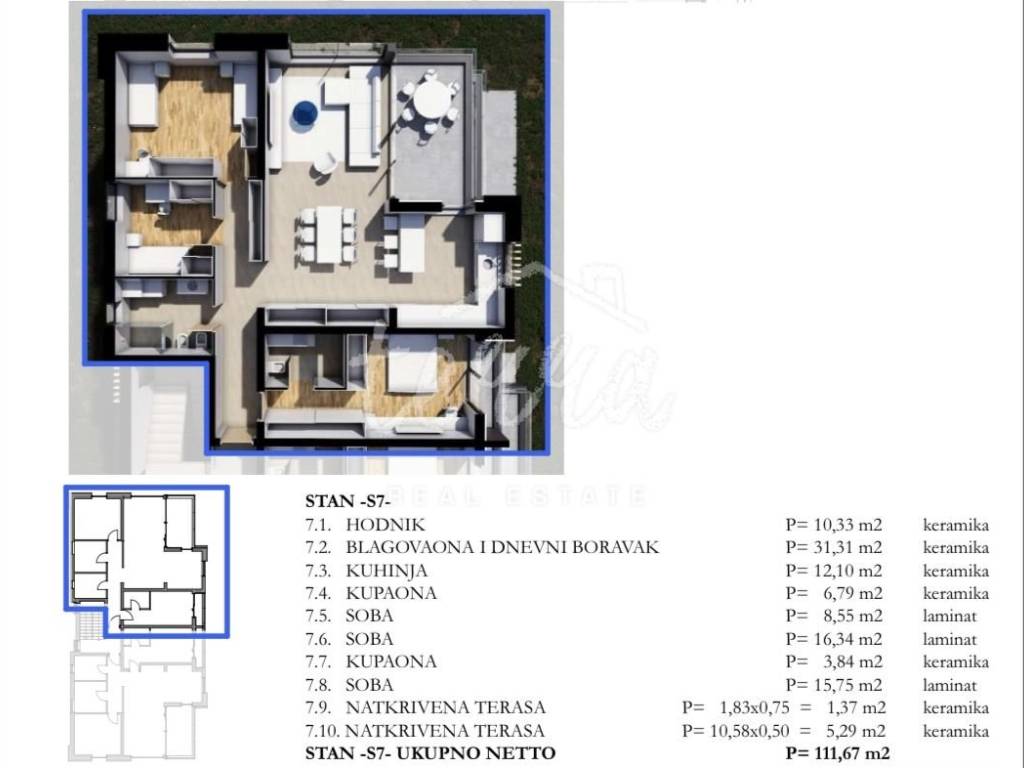 Total area of 111.67 square meters, consists of a hallway, three bedrooms, kitchen, dining room, living room, two bathrooms and two covered terraces.