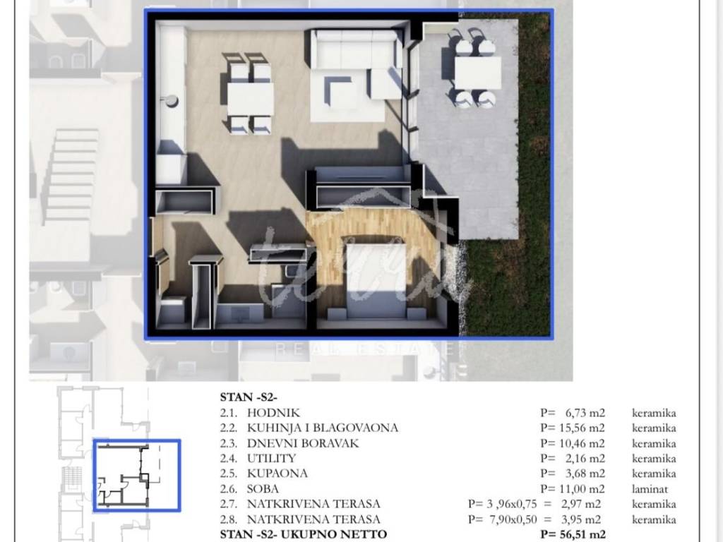 With a total area of ​​56.51 square meters, it consists of a hallway, one bedroom, kitchen, dining room, living room, bathroom, utility room and two covered terraces.