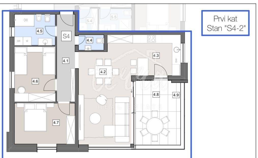 A two-bedroom apartment on the first floor of a new, modern Villa is for sale.