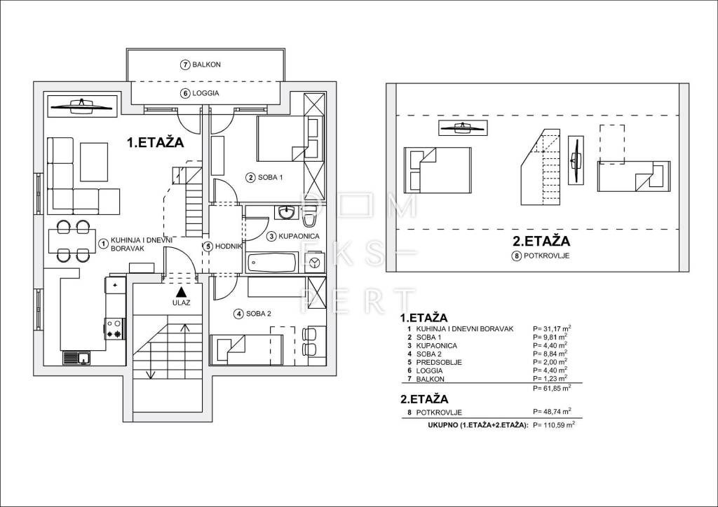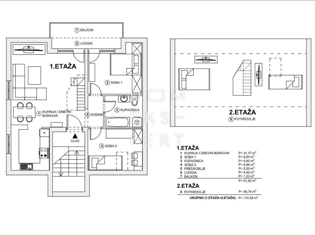 - Upper Level: Converted attic space used as a spacious sleeping area (48.74 m2)