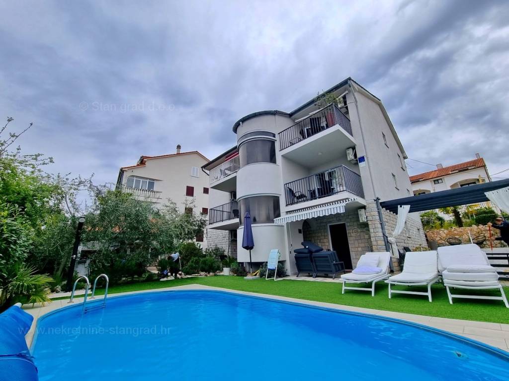 The Stan Grad Immobilien agency in Kvarner sells an interesting holiday home in the traditionally most sought-after Croatian Adriatic area of the island of Krk. The mentioned house is located in a very nice position not far from the sea and the center of the coastal town of Malinska. According to the type of building, the building can be categorized as a detached house with several apartments. The building of good quality is built on three floors that are useful in terms of space and height. The house was built in such a way that it includes 5 two-room apartments and one two-room apartment, each with its own separate entrance. The house has a total area of 400 m2. Each apartment has a living room and a kitchen, one or two bedrooms, a bathroom and a terrace. The interior spaces of the property are equipped with the necessary technical equipment and functional furniture. In addition to the described property, this property includes a well-organized garden where there is a summer kitchen with a covered terrace, a sunbathing area and two swimming pools. One is intended to be used for the apartment on the ground floor, next to which it is located. The second is for use by all others. Several cars can be comfortably parked in the garden of the property. In addition to the above, it should be emphasized that the house has a beautiful view of the sea. Ideal as an investment purchase and taking over an established rental business. This real estate is the property of a natural person, so the buyer is obliged to pay sales tax in the amount of 3% when transferring its ownership to his name. The owner of the house guarantees proper ownership and technical documentation and the possibility of quickly transferring ownership of the property to the buyer. We are waiting for you in Kvarner, at the address of the office on the island of Krk. Agent Stan Grad Immobilien will help you transfer property ownership and utility bills.