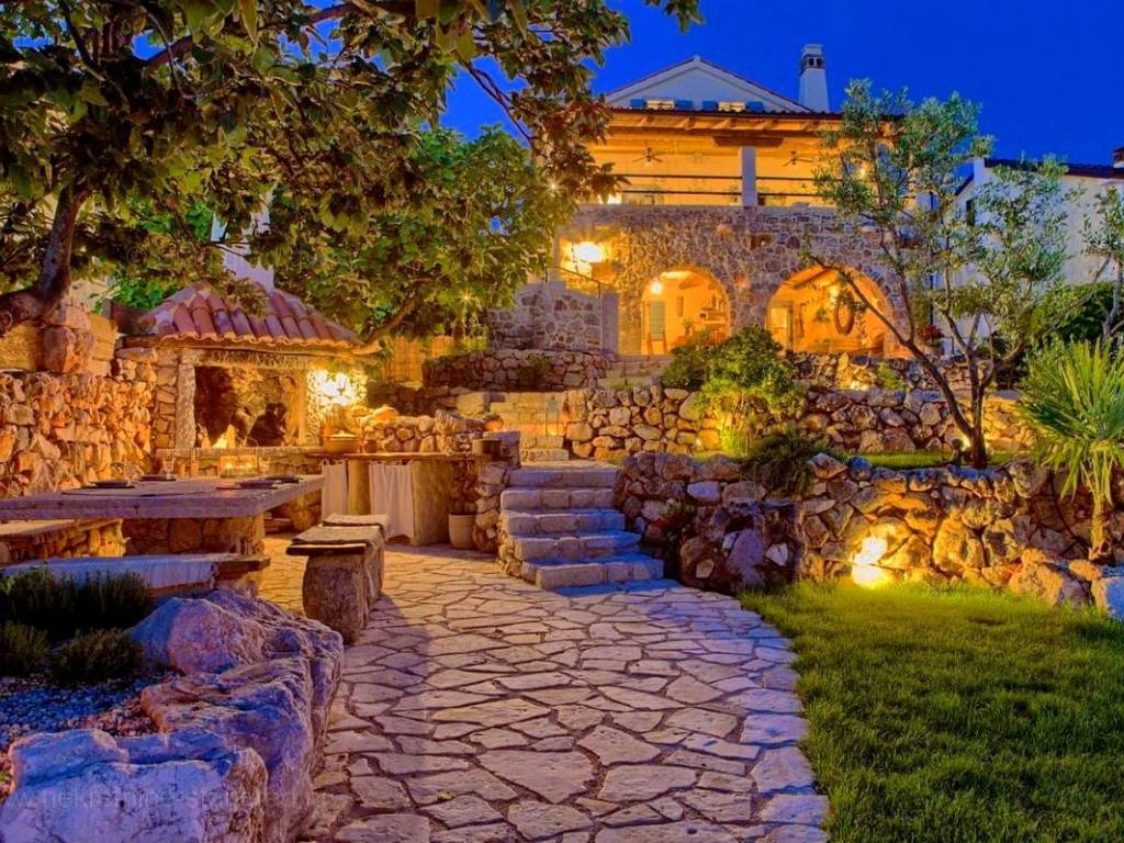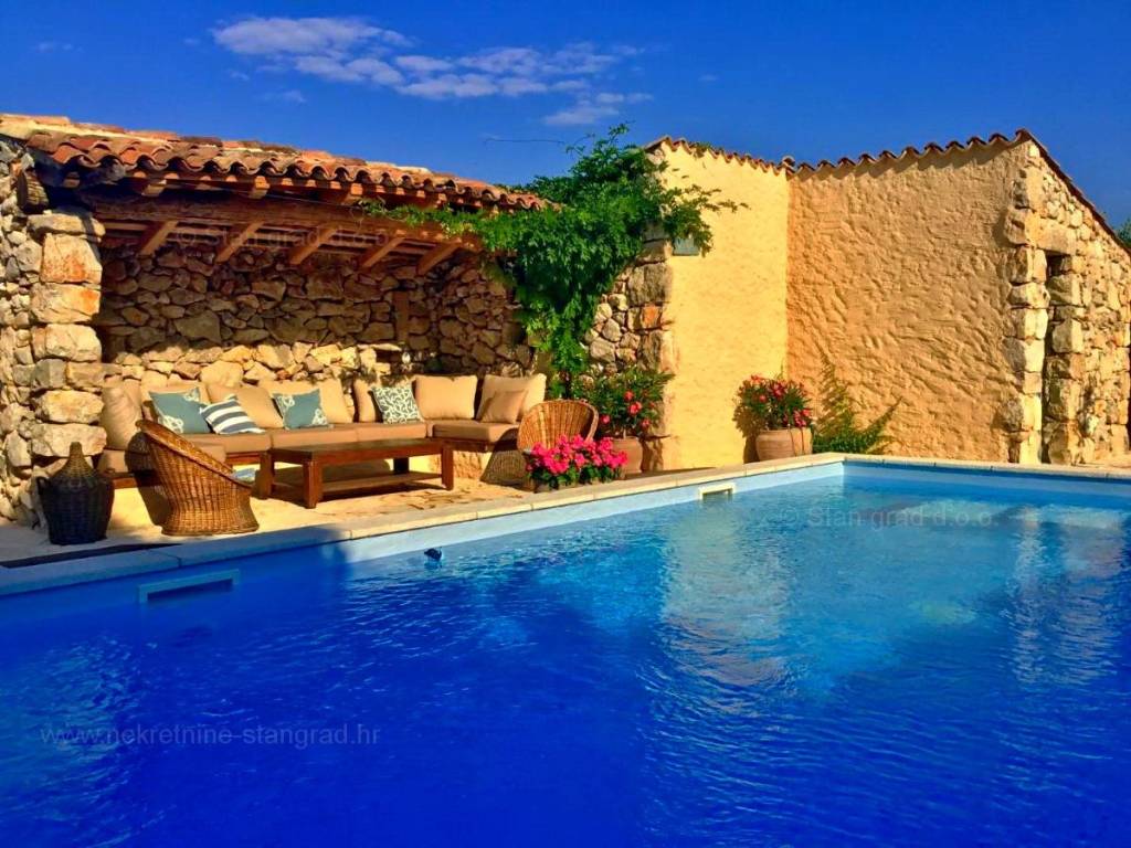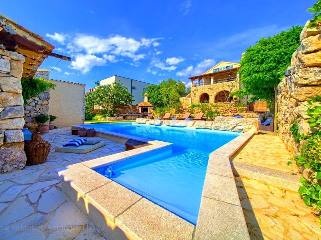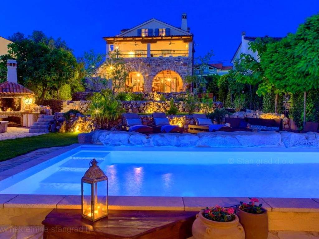 From the wide range of properties available on the northern Adriatic, Stan Grad Immobilien offers a stunning coastal villa in the attractive tourist region of the island of Krk. This rustic stone house is located in the vicinity of the well-known town of Malinska, in a peaceful location away from city noise. In terms of building type, this house can be classified as a semi-detached house with a basement, ground floor, first floor, and high attic.