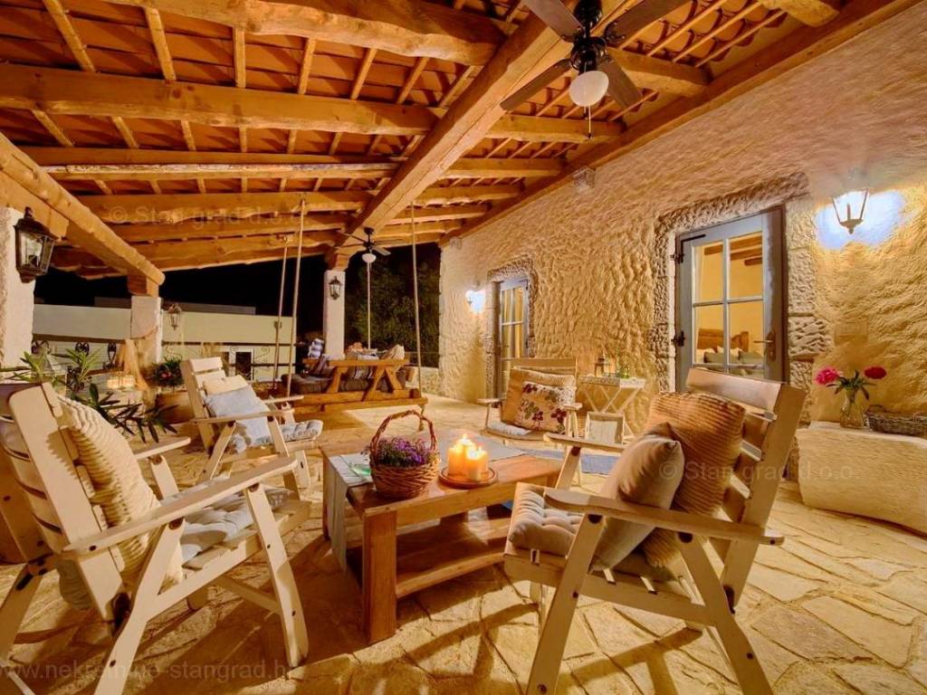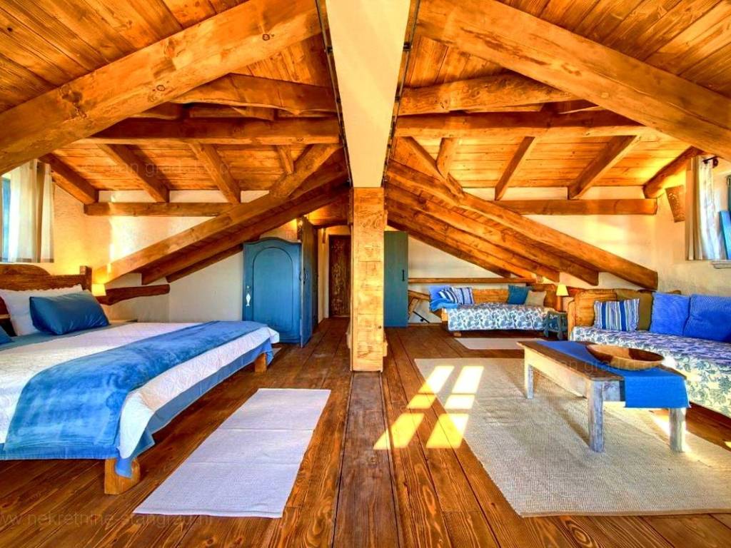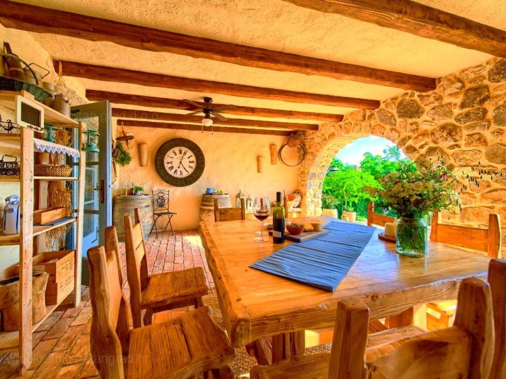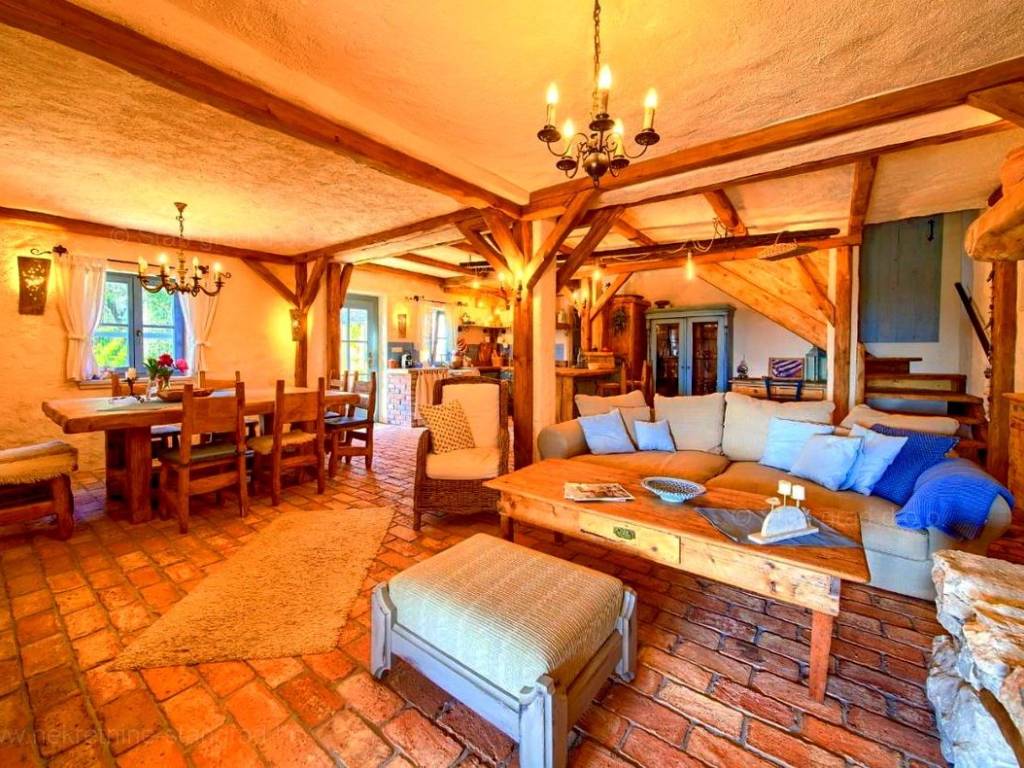 This rustic house spans a total of 4 levels. The structure is designed for family living. The total area of the house is 220 m². This area includes a wine cellar in the basement, a living room with a fireplace, kitchen, and dining room on the ground floor, an outdoor toilet, and a covered loggia. An internal staircase leads to the first floor, which has 2 bedrooms, a bathroom, and a large covered terrace with a sea view. The high attic is a spacious room that can be divided into two bedrooms and a bathroom if needed. The interior of the property is fully equipped with new, high-quality technical devices and uniquely designed furniture. The heating system uses a heat pump, air conditioning system, fan convectors for heating and cooling with regulation for each individual room, high-quality wooden joinery, new installations, and Mediterranean tiles.