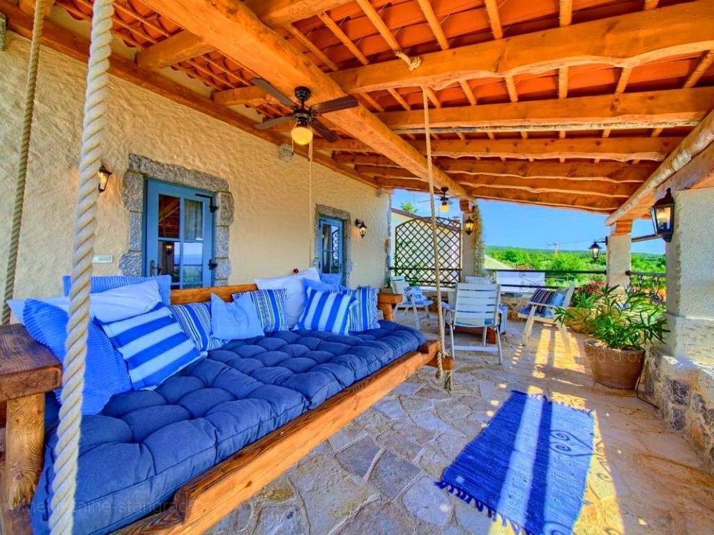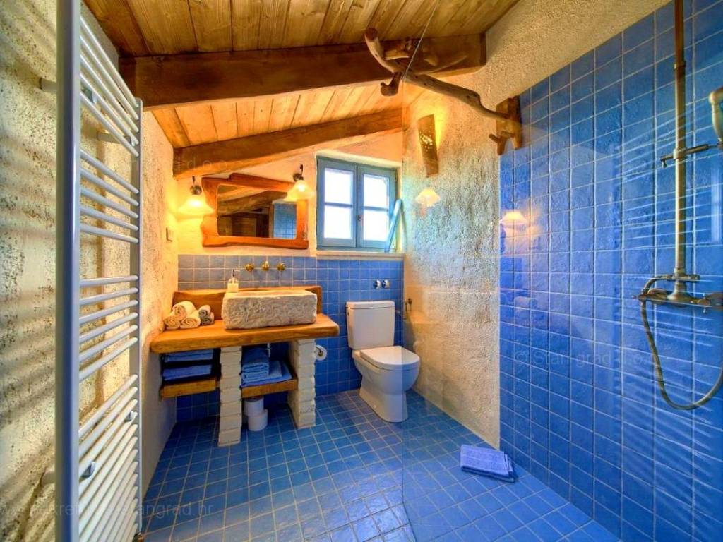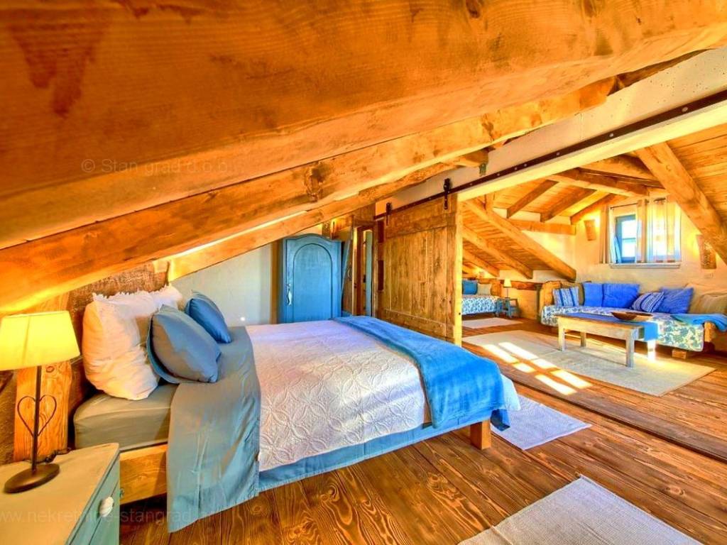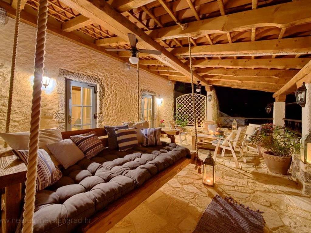This rustic house spans a total of 4 levels. The structure is designed for family living. The total area of the house is 220 m². This area includes a wine cellar in the basement, a living room with a fireplace, kitchen, and dining room on the ground floor, an outdoor toilet, and a covered loggia. An internal staircase leads to the first floor, which has 2 bedrooms, a bathroom, and a large covered terrace with a sea view. The high attic is a spacious room that can be divided into two bedrooms and a bathroom if needed. The interior of the property is fully equipped with new, high-quality technical devices and uniquely designed furniture. The heating system uses a heat pump, air conditioning system, fan convectors for heating and cooling with regulation for each individual room, high-quality wooden joinery, new installations, and Mediterranean tiles.