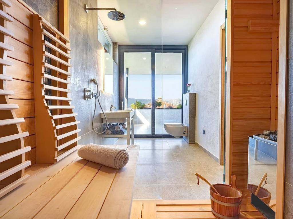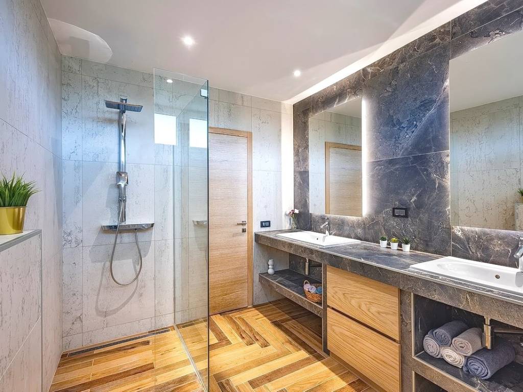 The upper floor boasts two lavish master bedrooms, each with a private bathroom and access to a large balcony that offers breathtaking views of the Adriatic Sea. A fully equipped gym occupies the expansive basement level, adding yet another layer of comfort and exclusivity to this extraordinary home.