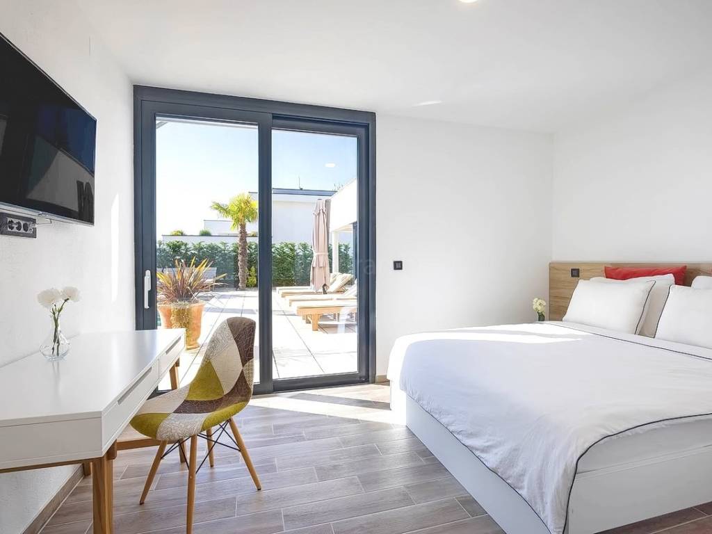 The impeccably landscaped outdoor area creates a unique atmosphere, featuring a stunning pool with a cascading waterfall from the rooftop, a sun deck, a summer kitchen, and a barbecue—perfect for enjoying warm Mediterranean days in style. The spacious courtyard provides ample parking for multiple vehicles.