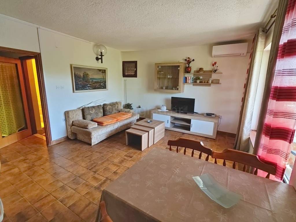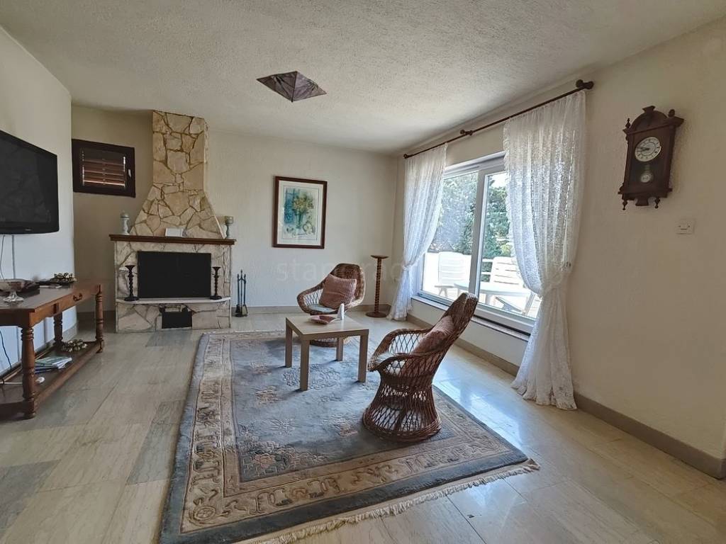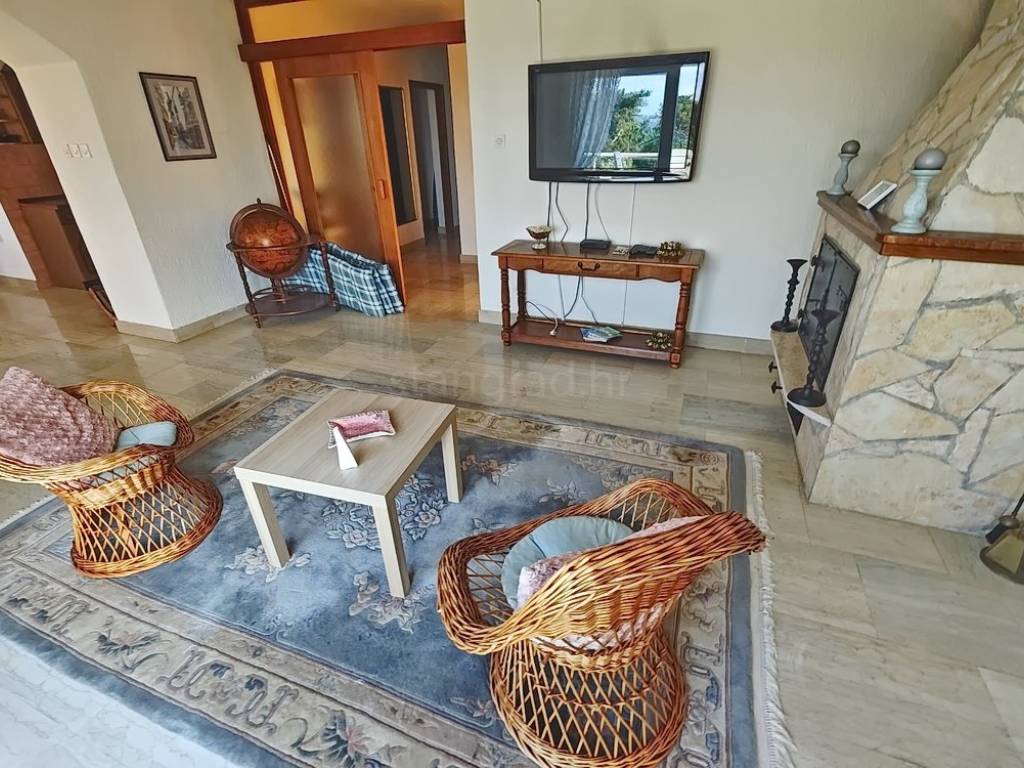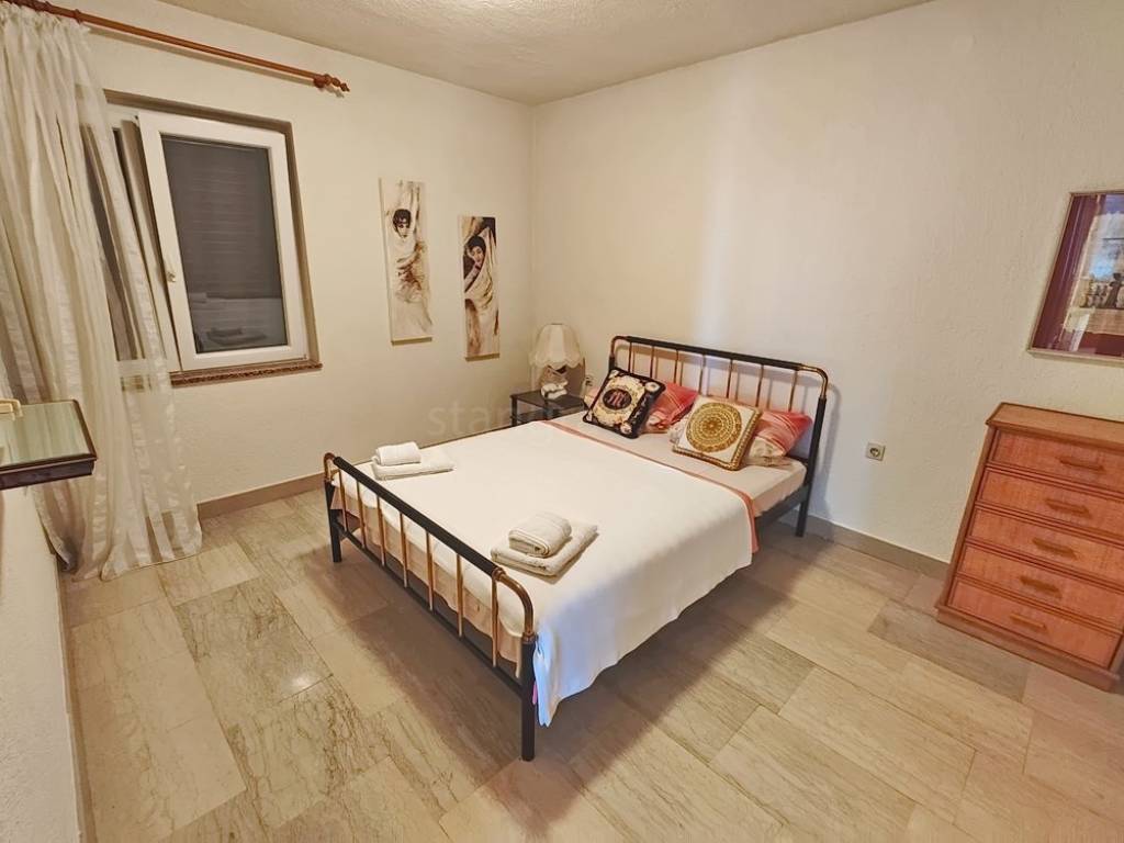 It is important to note that the apartment on the first floor occupies the entire level and consists of an entrance hallway, two bedrooms, a living room, a kitchen with a dining area, and a large terrace with a sea view. The interior spaces of the property are exceptionally well-maintained and fully equipped with necessary technical appliances and high-quality furnishings.