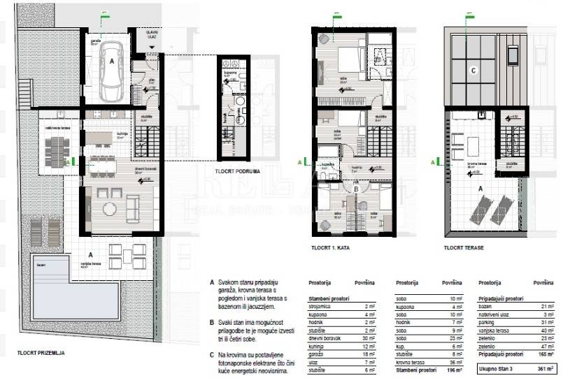 We have for sale a luxurious apartment in a new building in Kostrena, more precisely in Saint Lucia, the area of which includes 196 m2 of living space and 165 m2 of outdoor space. The apartment extends over three floors: basement, ground floor and first floor. On the ground floor there is a spacious living room, a kitchen, and an attractive outdoor terrace with a swimming pool. The basement contains a bathroom and a boiler room. On the first floor there are four bedrooms and an additional bathroom. Access to the roof terrace with an incredible panoramic view of the sea is possible from the first floor. The apartment is equipped with underfloor heating, fan coil cooling and a heat pump. Customers have the freedom to choose finishing materials according to their own preferences. Photovoltaic power plants are installed on the roof, which makes the house energy independent. The facility is located in the popular part of Kostrena, known as "Zelena Kostrena", only a 5-minute drive to the first beach. Access to the facility is provided from the upper road, where the expansion of the existing road is planned. The apartment comes with two outdoor parking spaces and a garage inside the building. For any additional information about this exceptional offer, feel free to contact us.