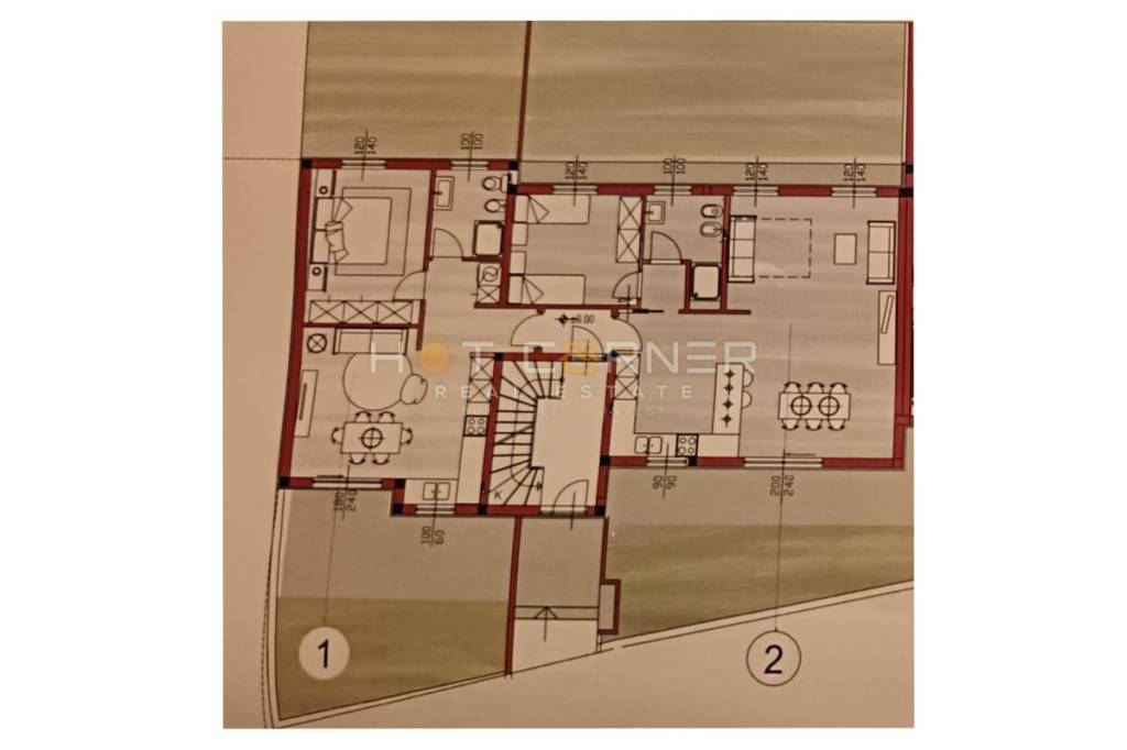 A beautiful ground floor apartment in a NEW BUILDING in Medulin is for sale, just 50m from the sea. The apartment is located in a smaller residential building and consists of 2 separate residential units (apartments), each with an area of about 55m2. Each apartment consists of an entrance hall, 1 bedroom, bathroom, living room with kitchen and dining room with access to the terrace and garden.
